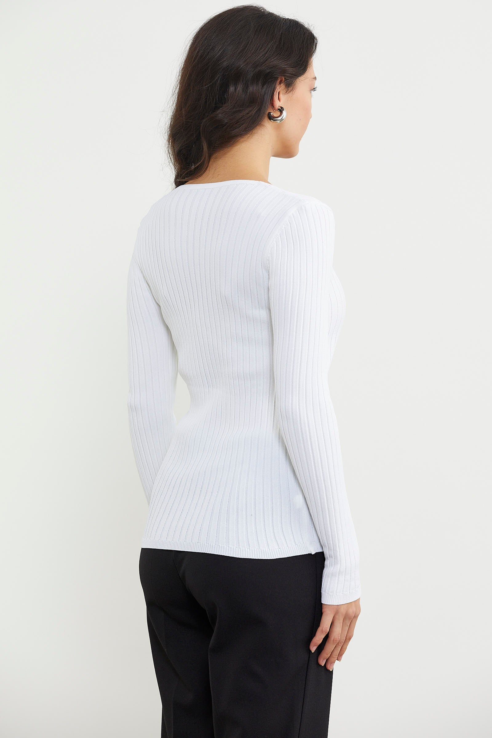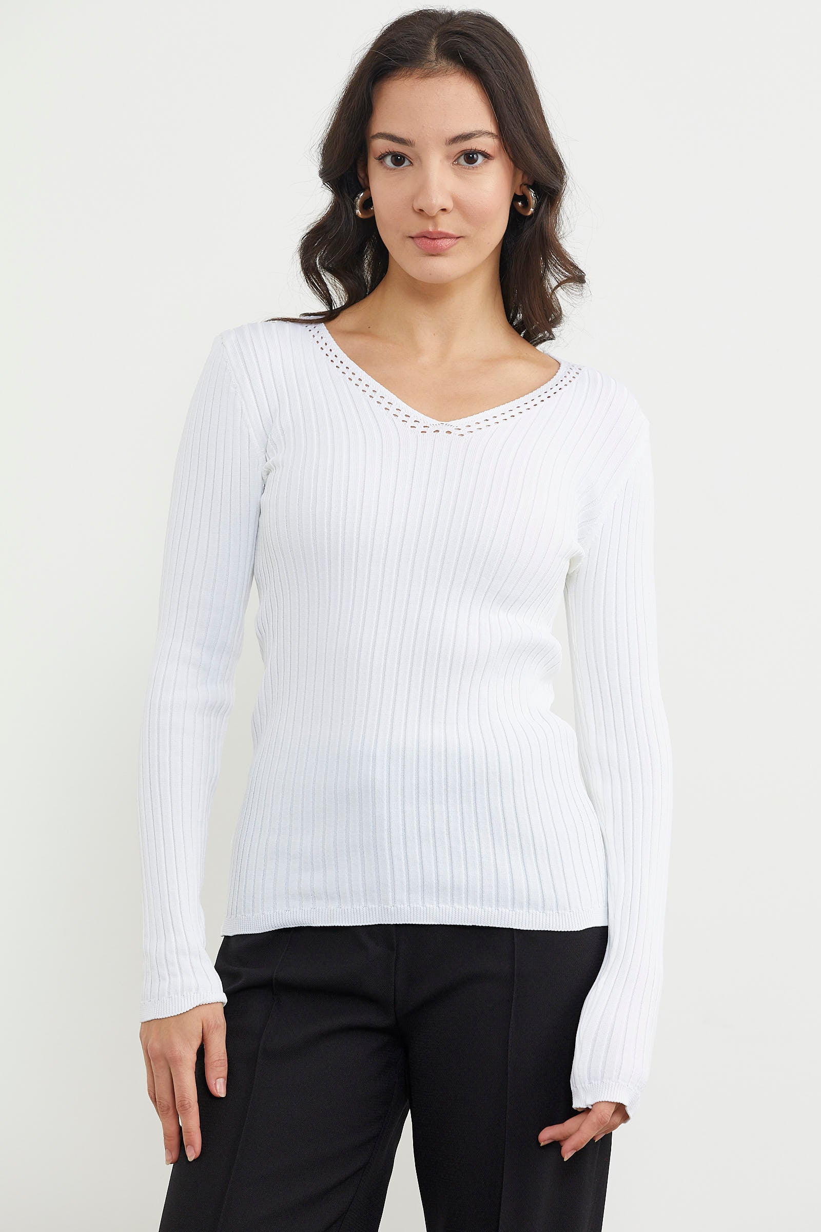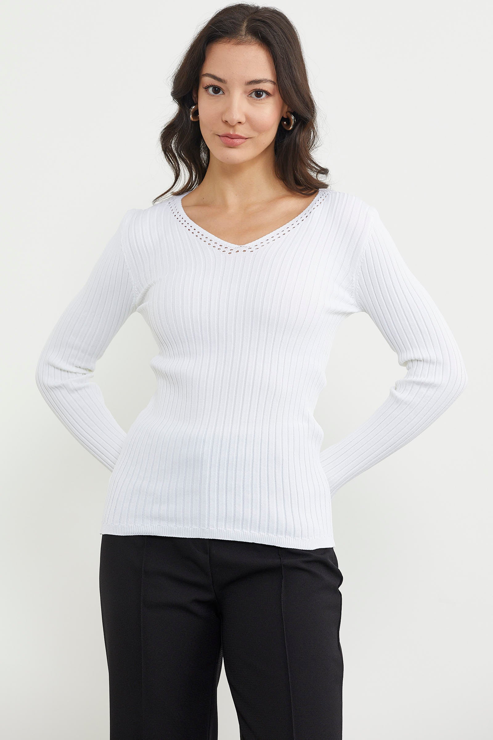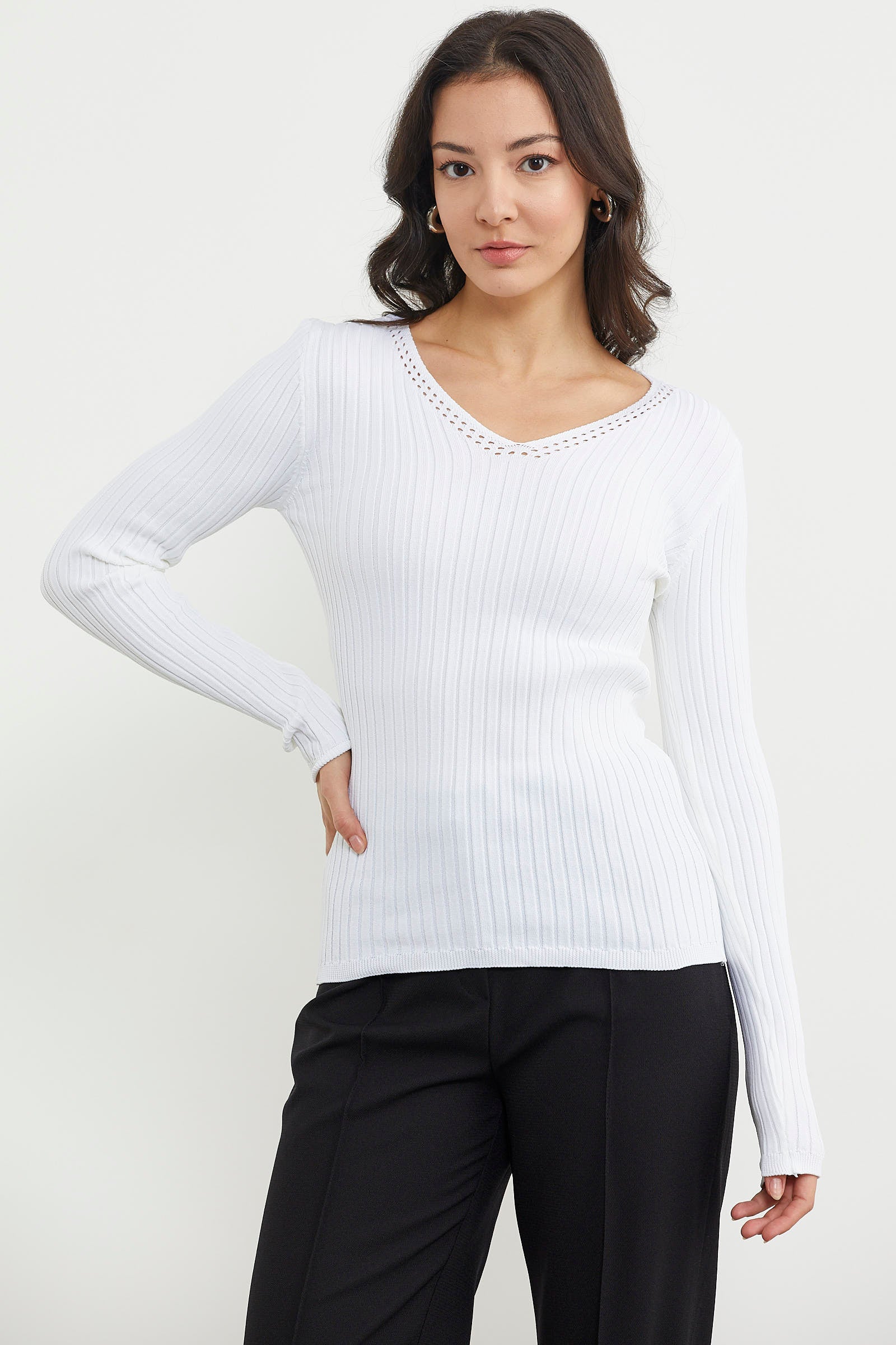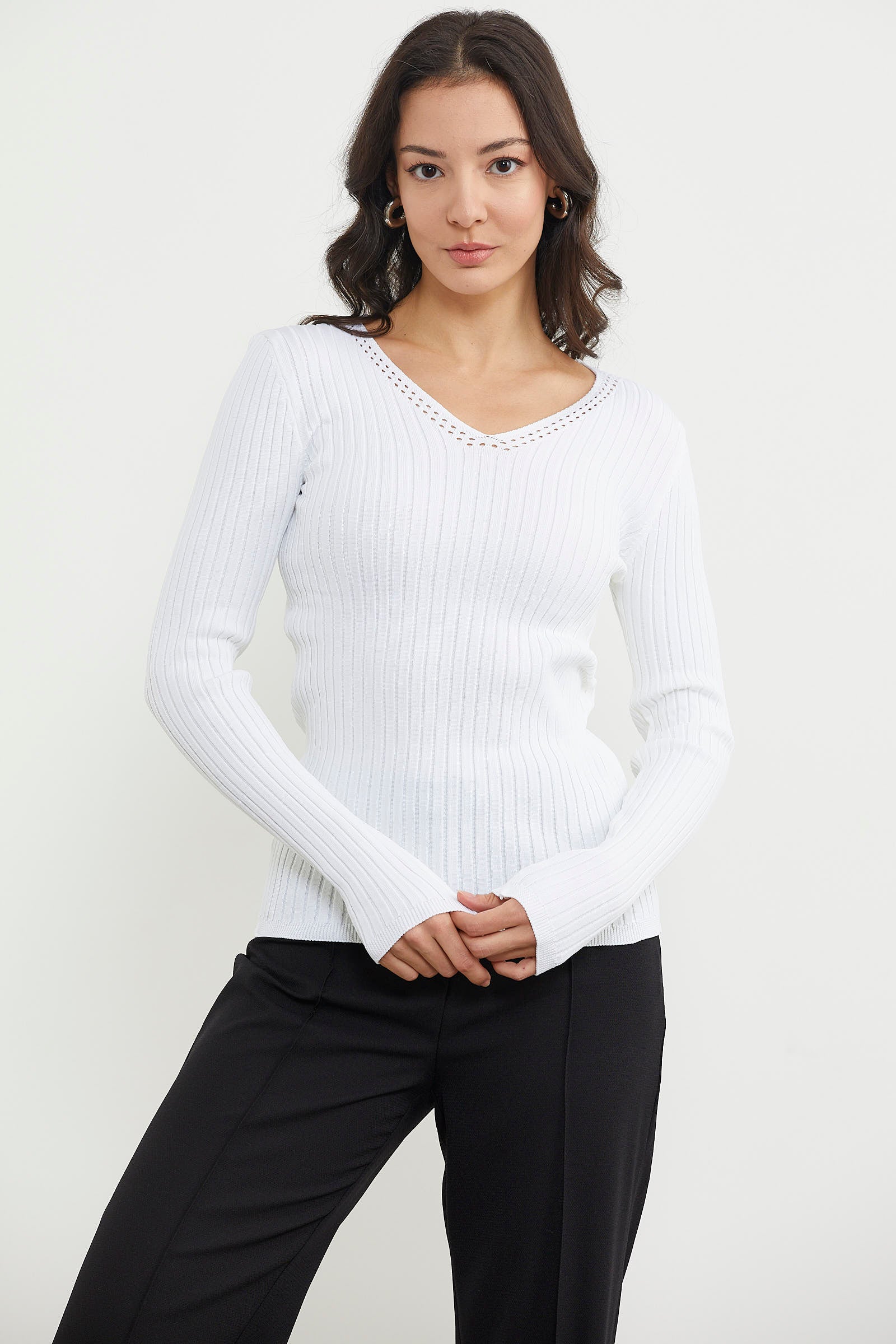 Fitilli dokusu ve esnek kumaşıyla rahat hissettirecek V yakalı uzun kollu triko kazak kolay kombinlenebilecek bir parça olmasının yanı sıra stillerinizde öne çıkacaktır.