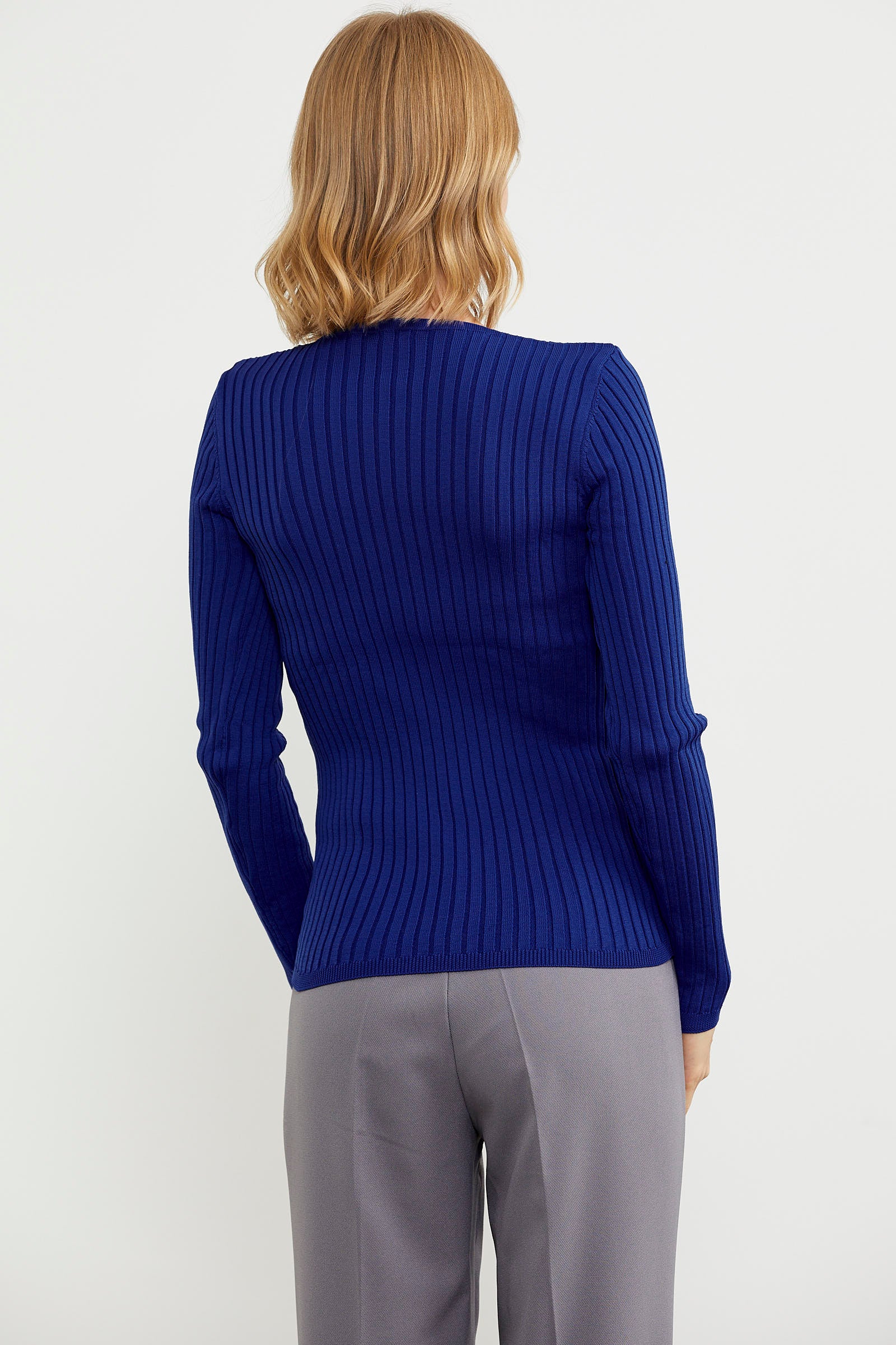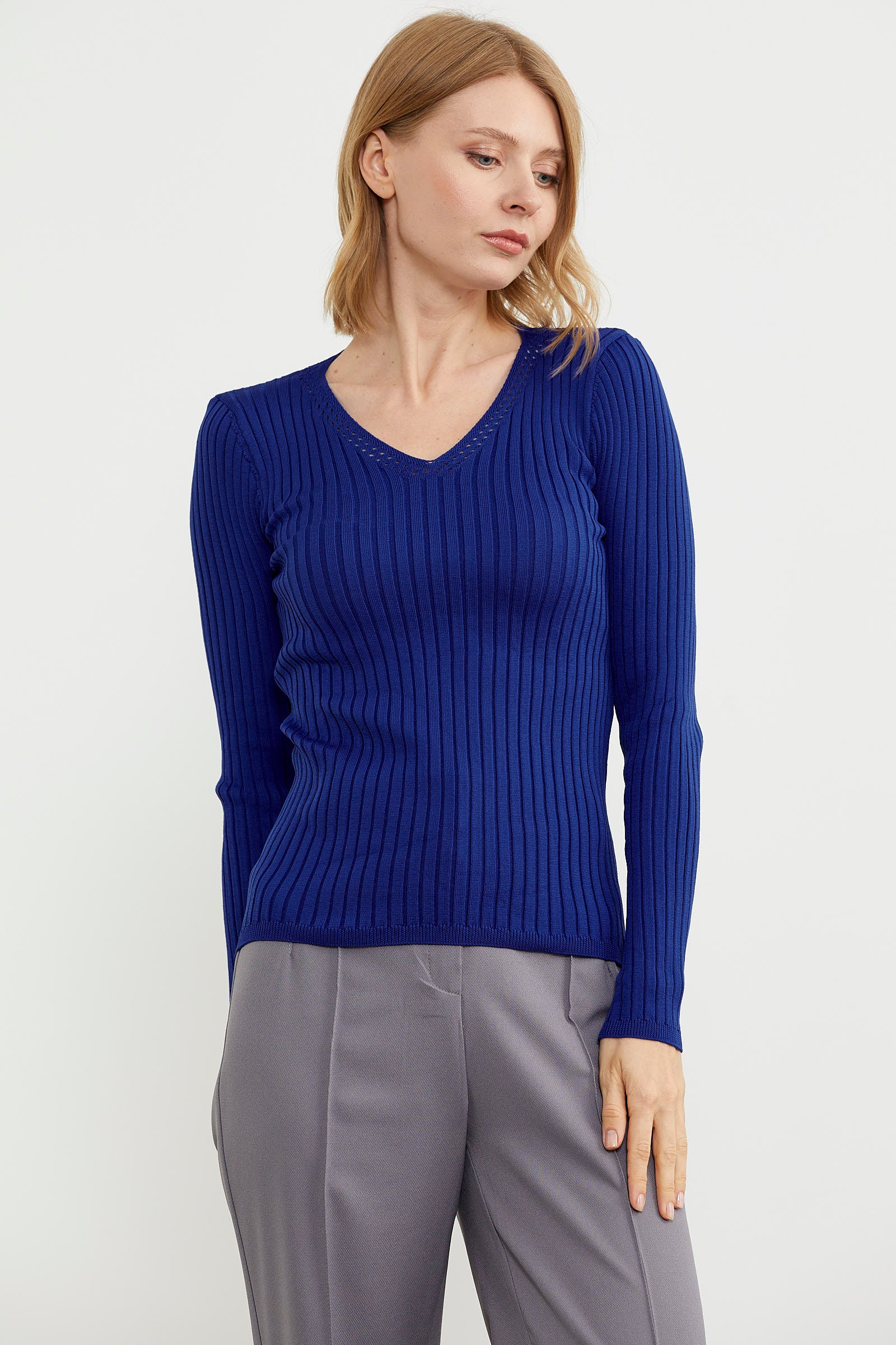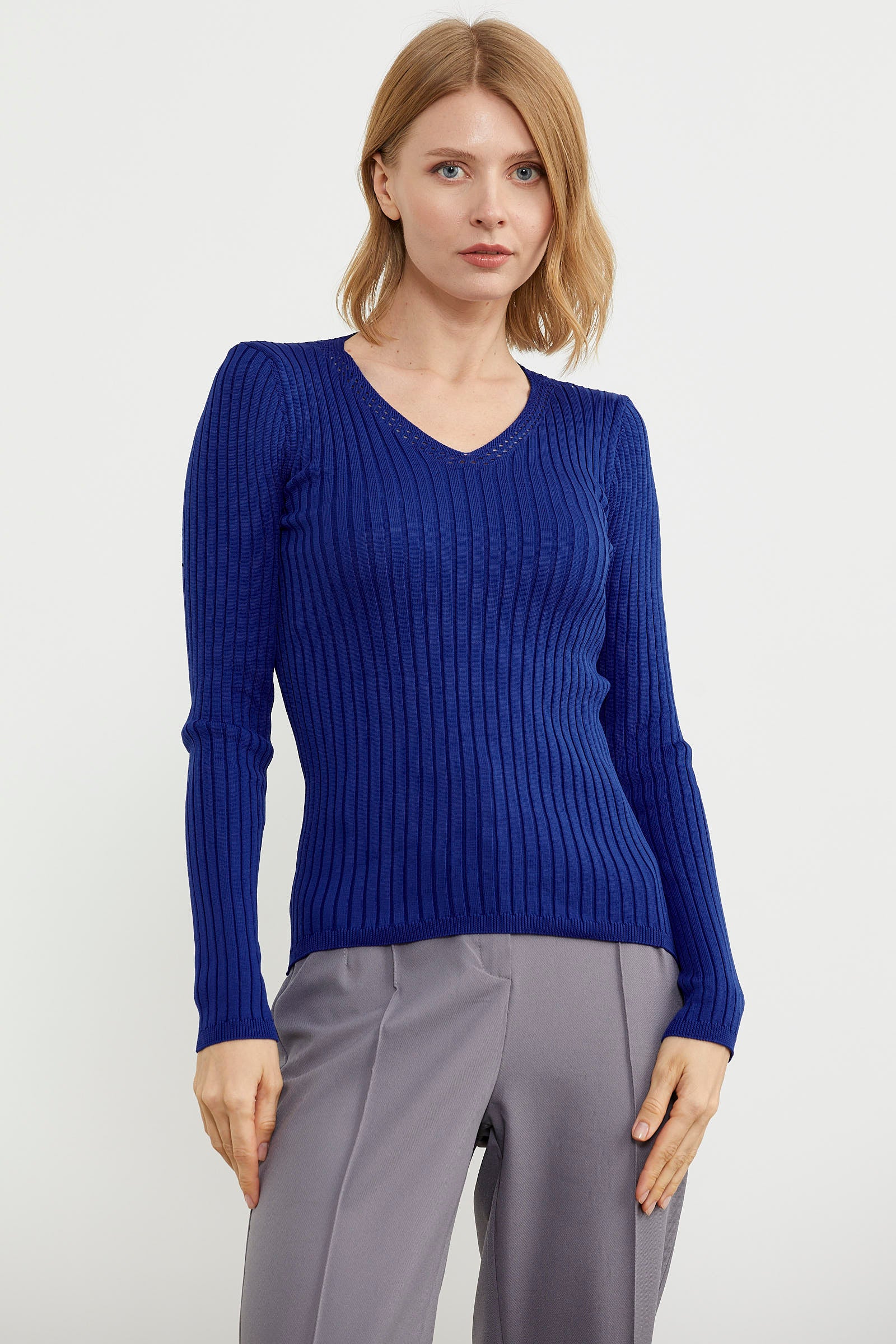 Kalın Fitilli V Yaka Triko Kazak - Saks