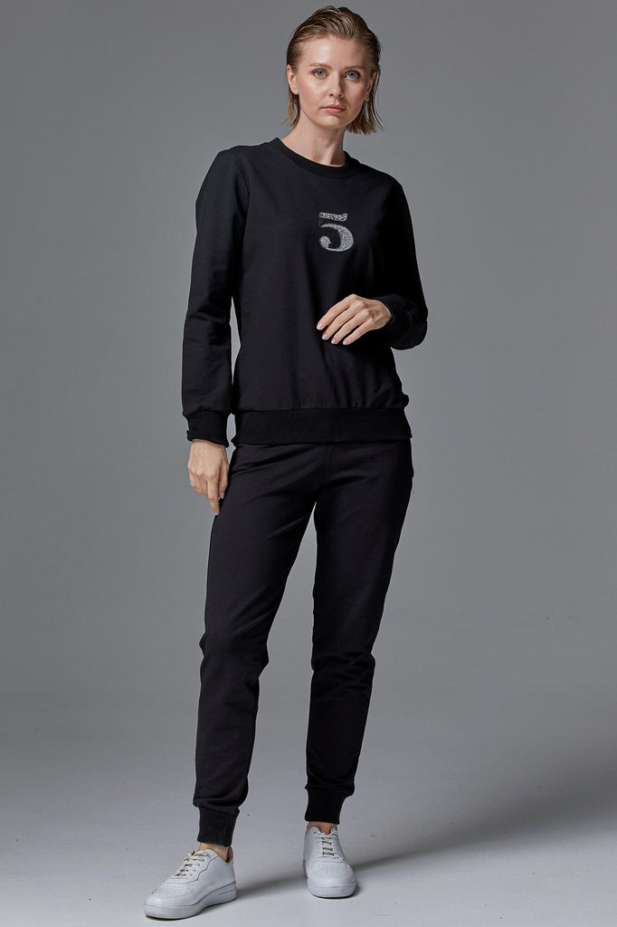 Viskon karışımlı kumaştan üretilen üçlü eşofman takımı. Dik yakalı, sıfır kollu, ön zemini kapitoneden oluşan, fermuar kapamasıyla kullanım kolaylığı sunan yelek. Sıfır yaka, etek ucu ve manşetleri ribanalı, taş detaylı sweatshirt ve beli büzgü bağlı jogger eşofman altından oluşan takım.