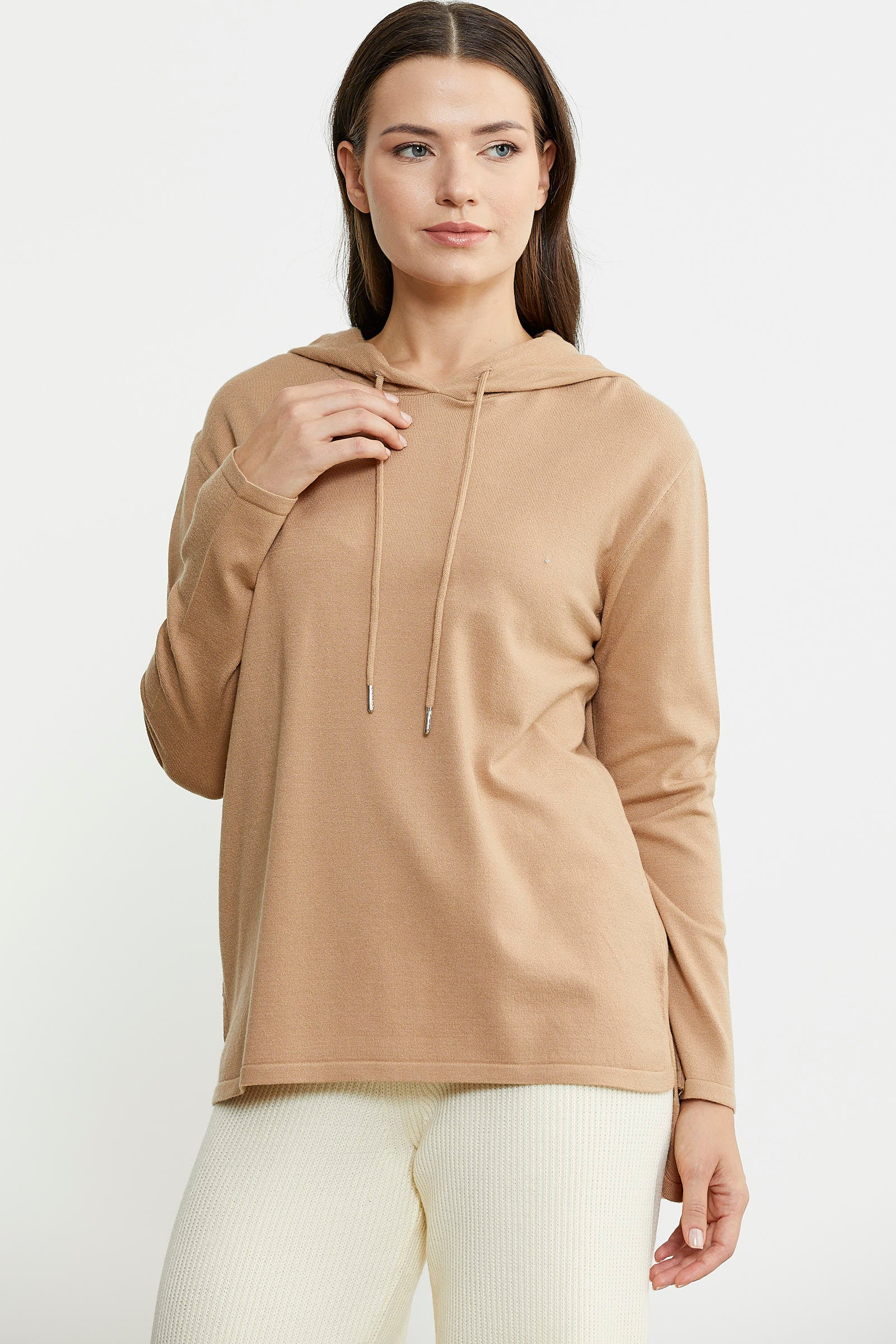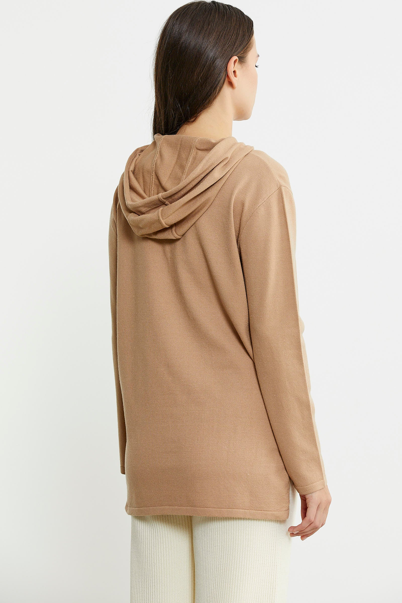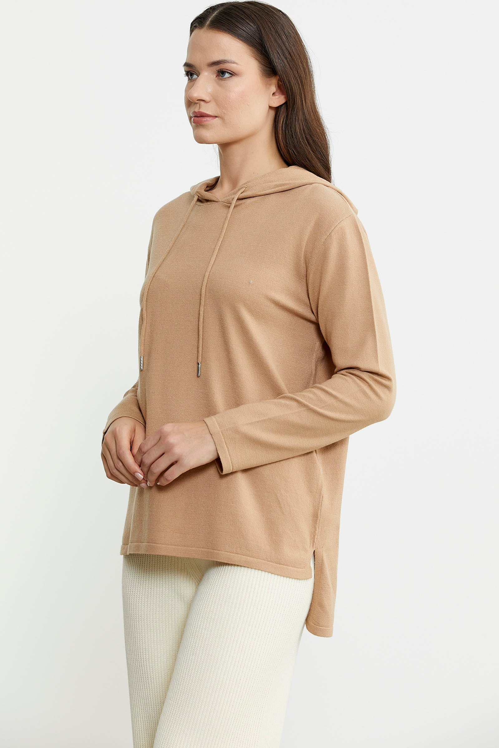 Kapüşonlu Arkası Uzun Triko Kazak - Bej