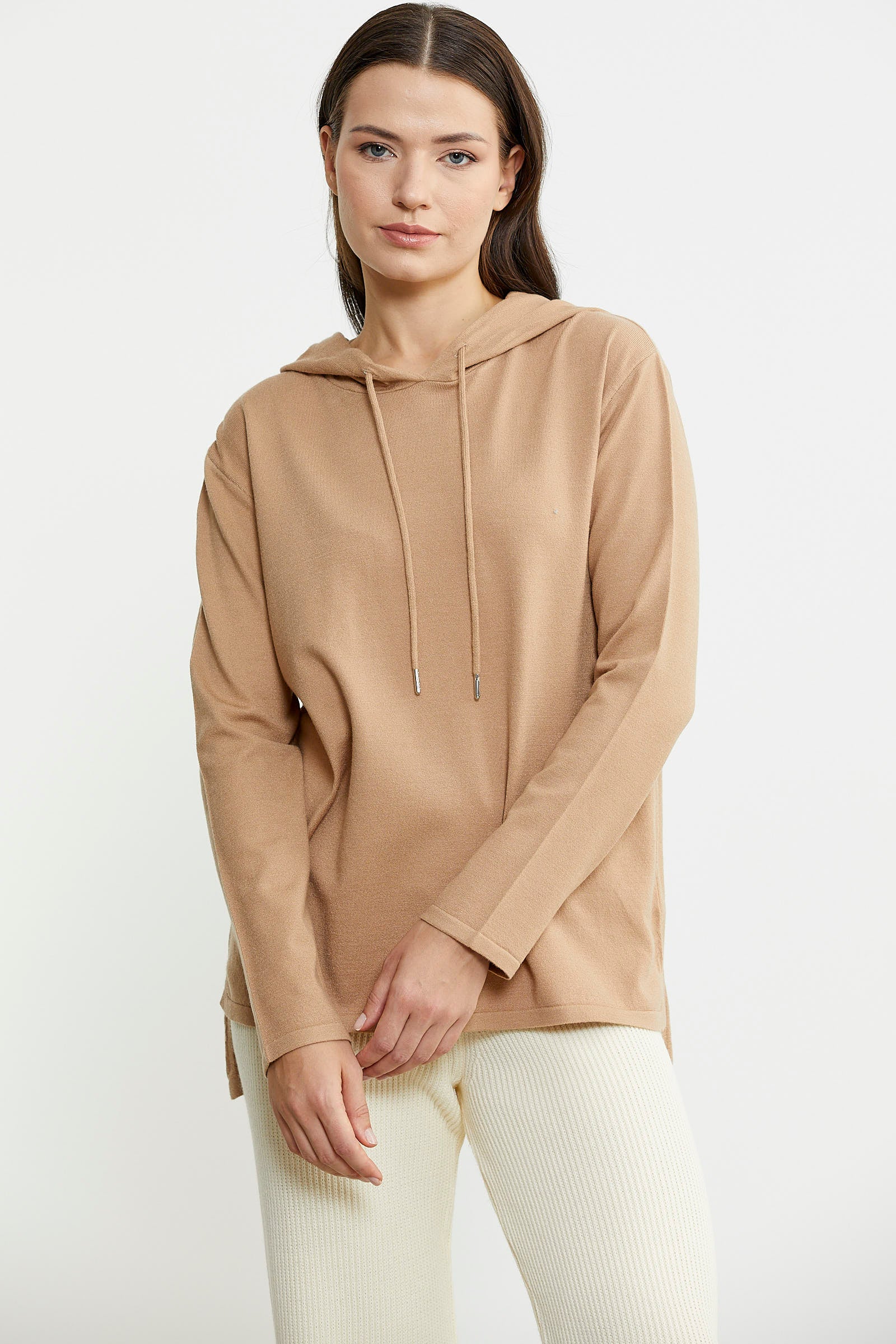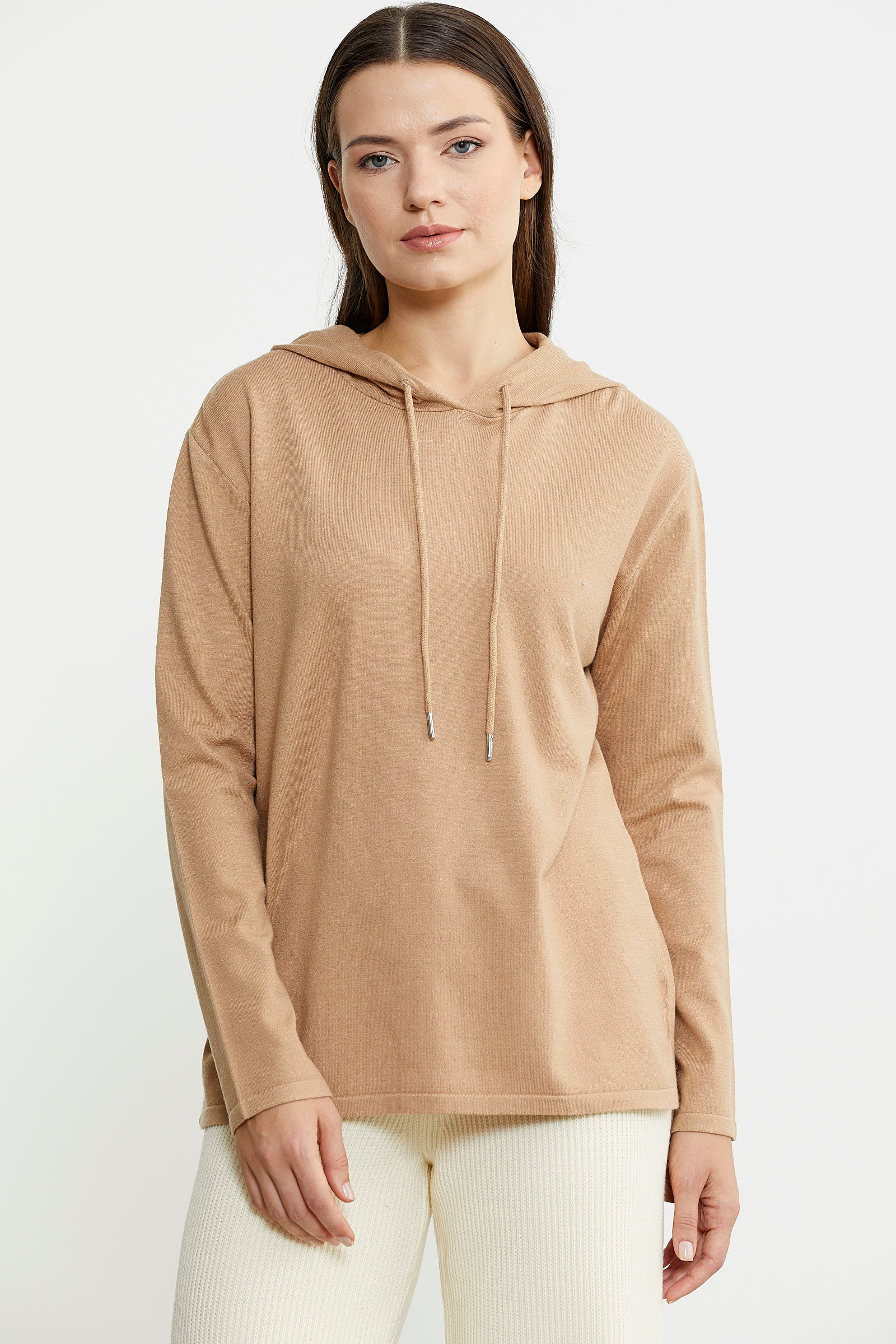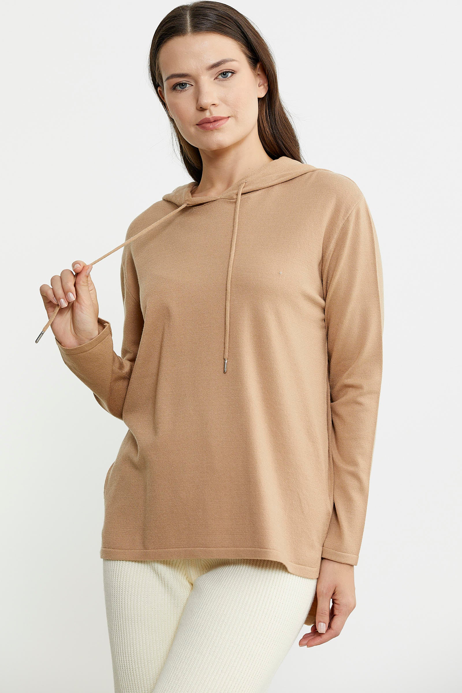 Kapüşonlu Arkası Uzun Triko Kazak - Bej