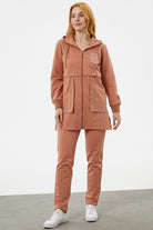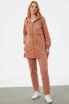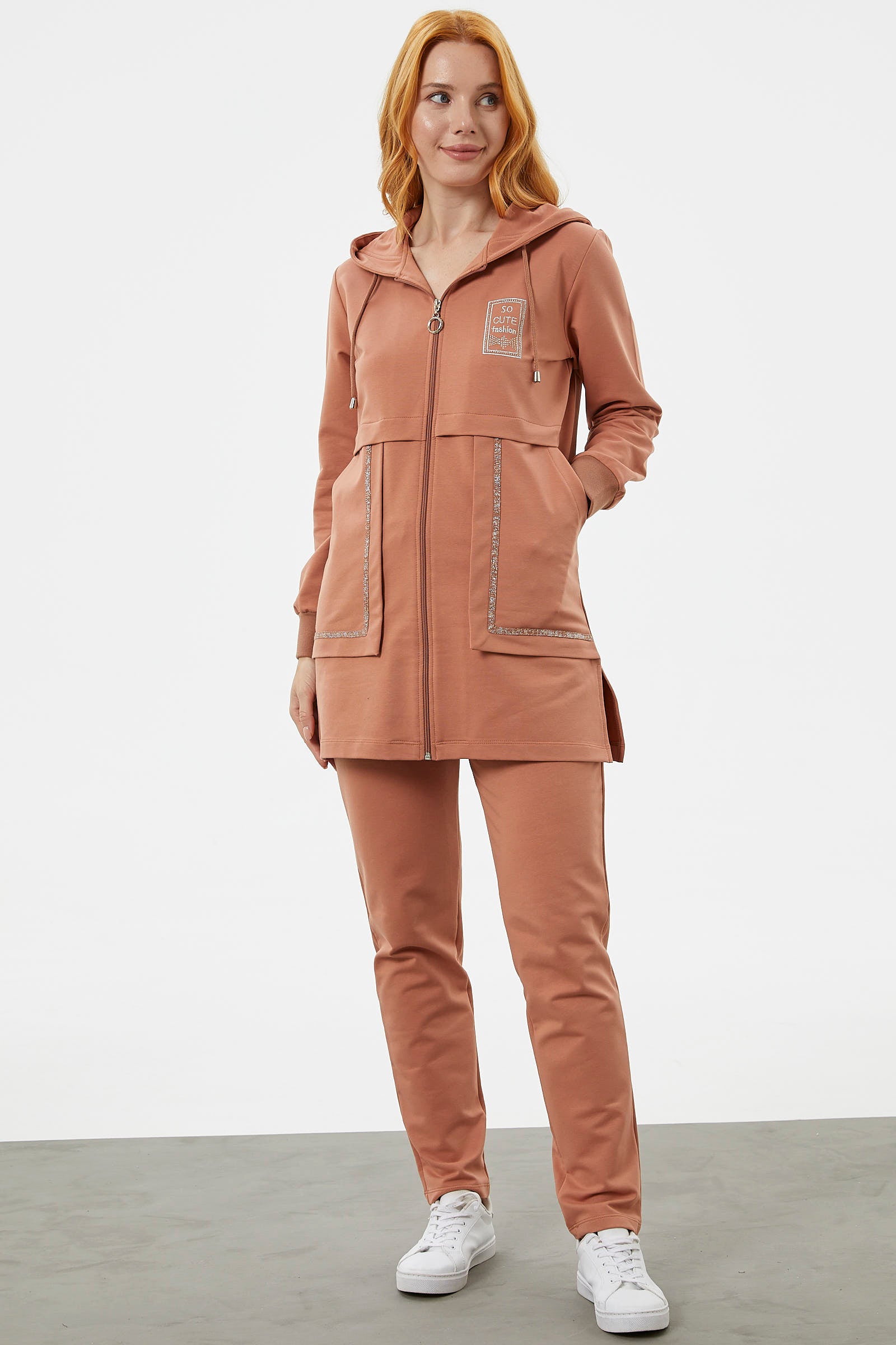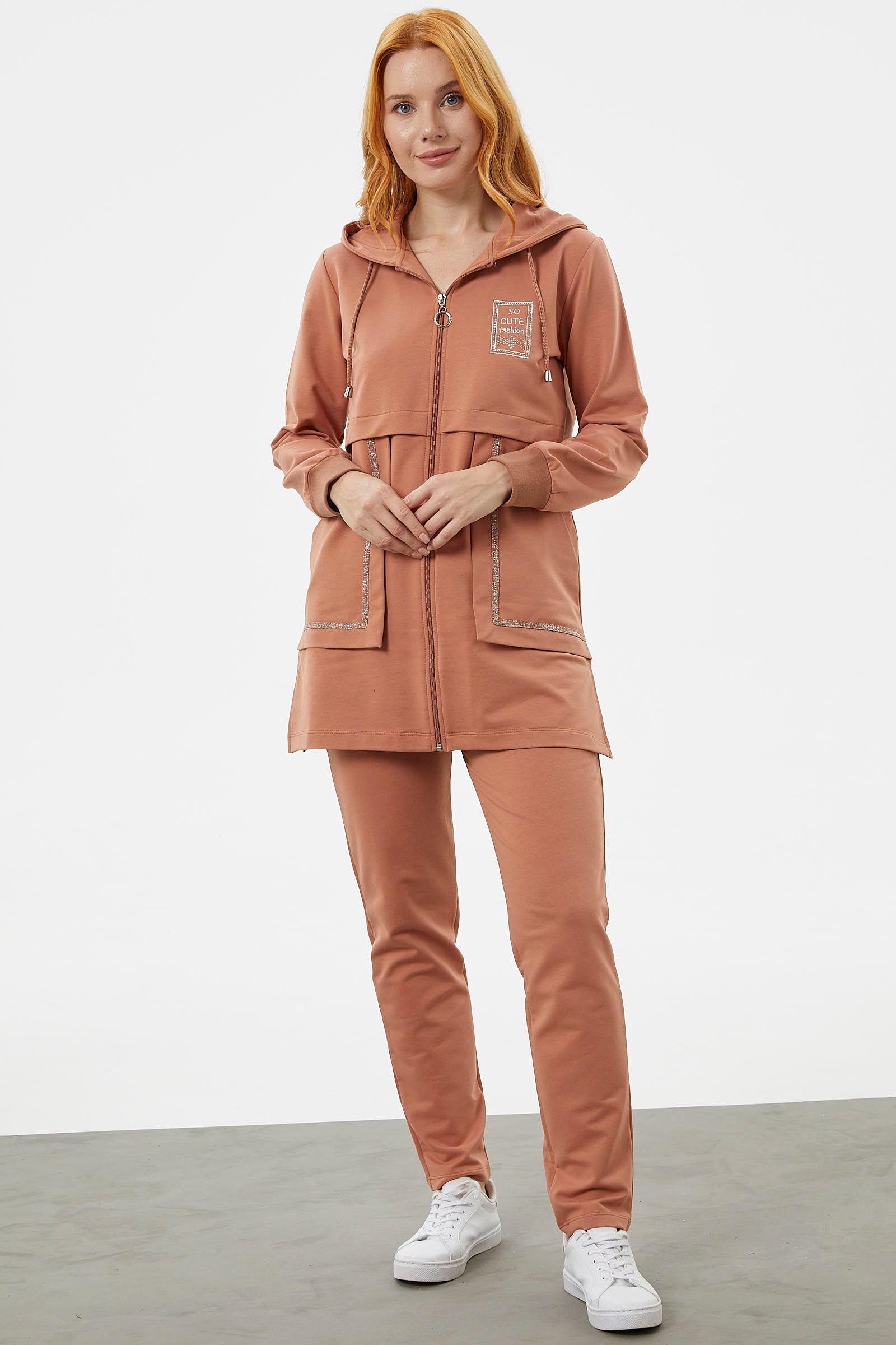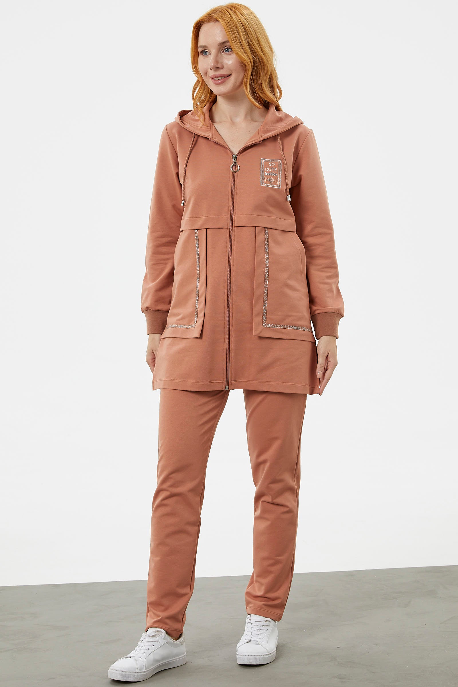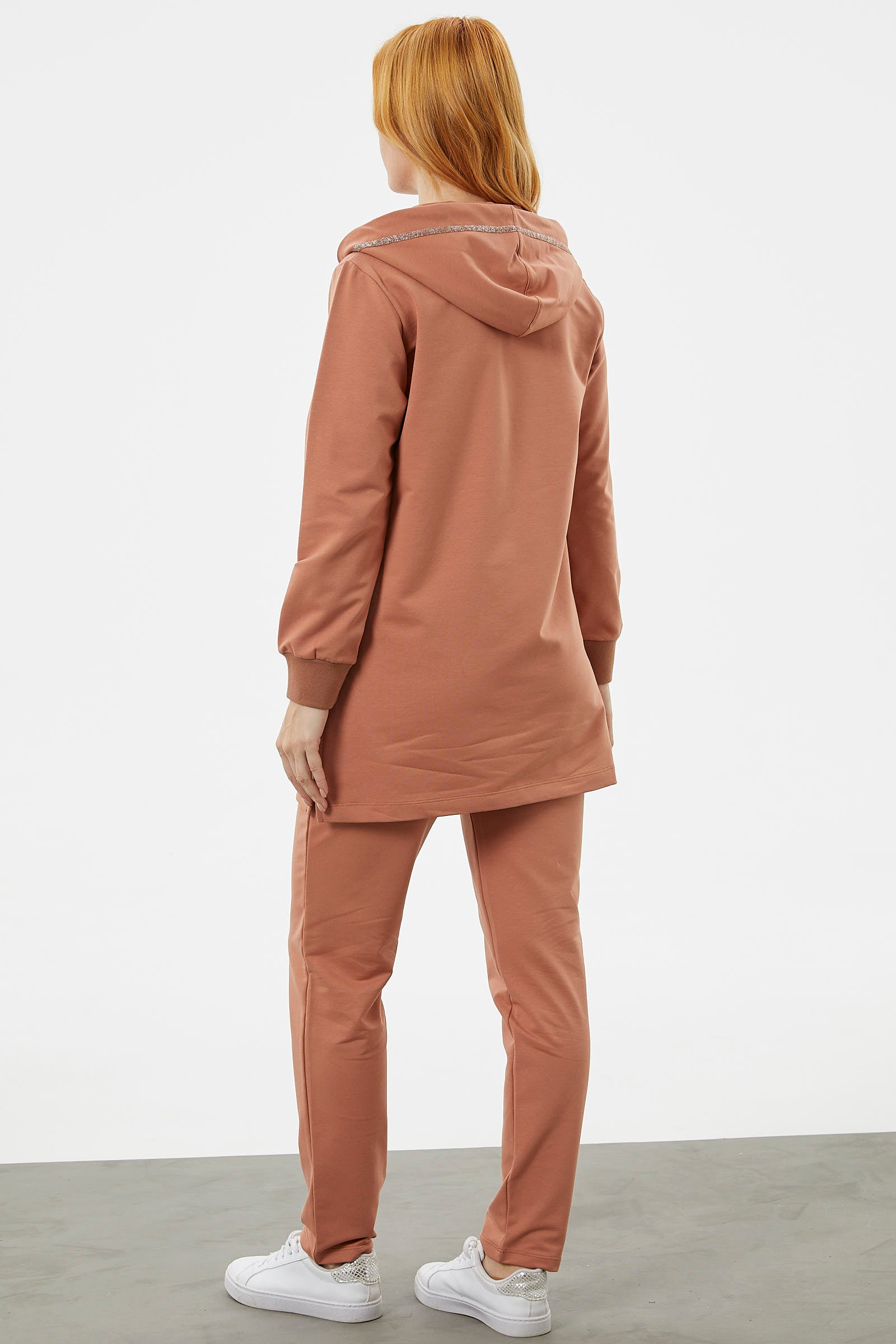 Kapüşonlu Biye Detaylı Fermuarlı Eşofman Takımı - Somon