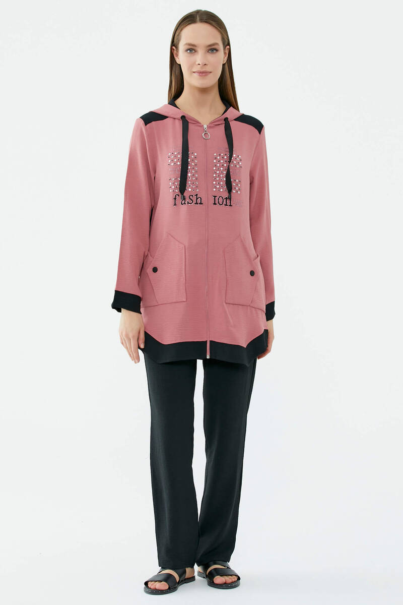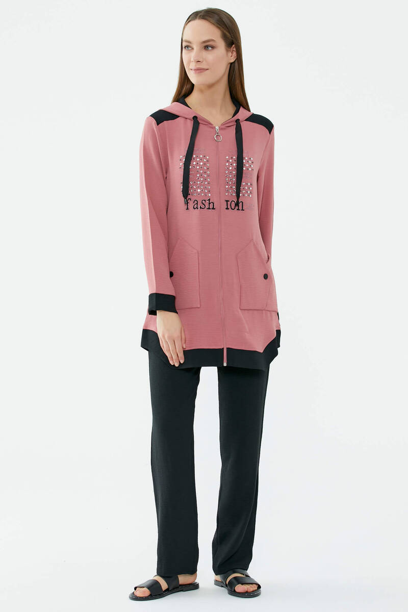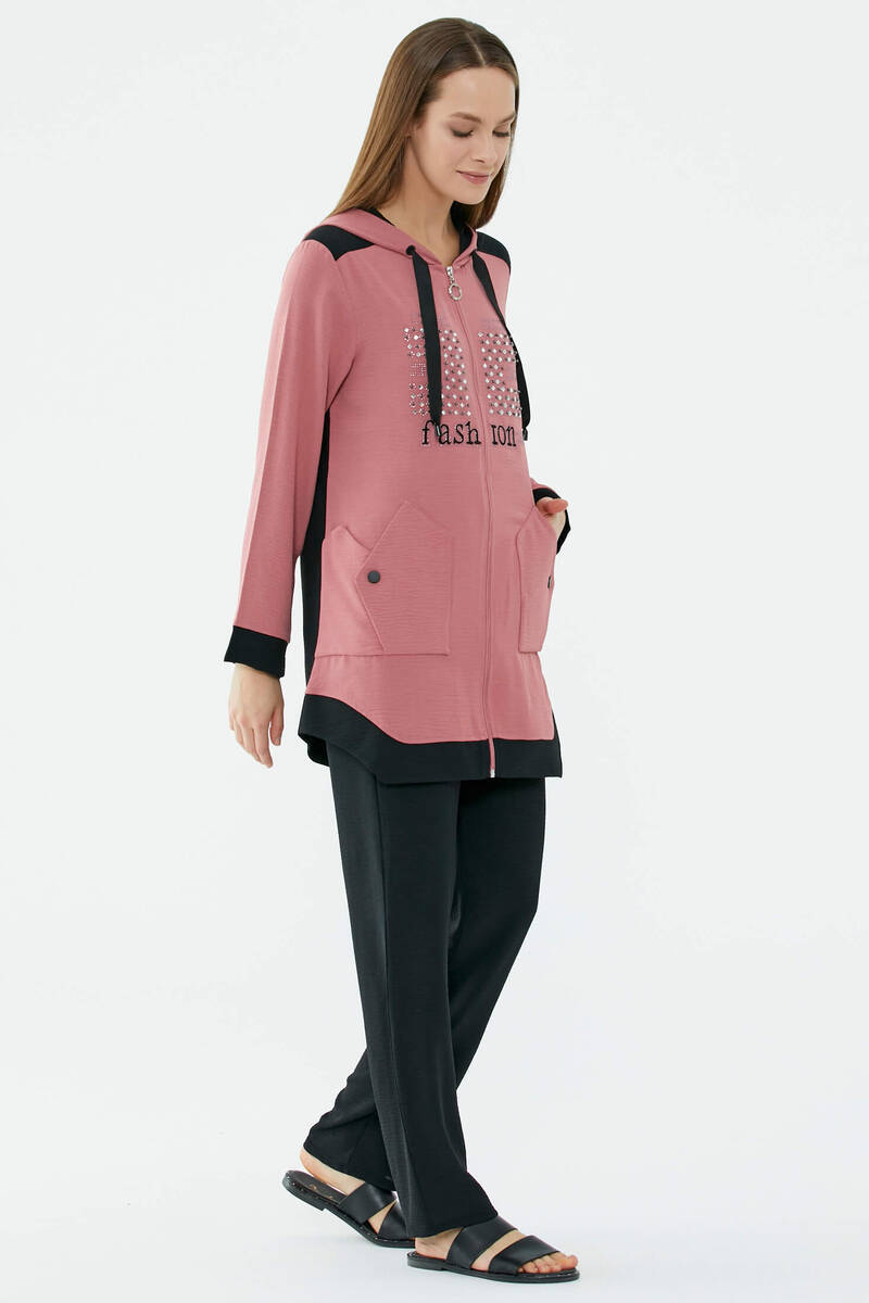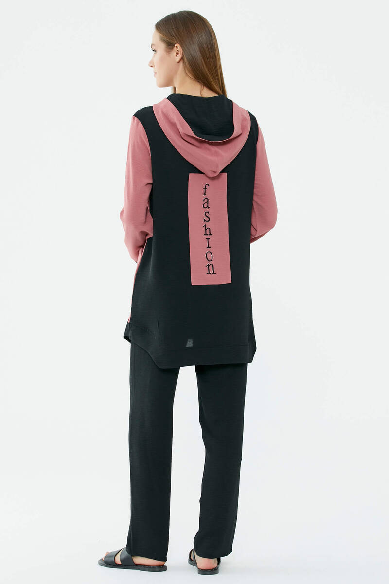 Kapüşonlu Çift Renk Rahat Kalıp Krep Takım - Gül - Siyah