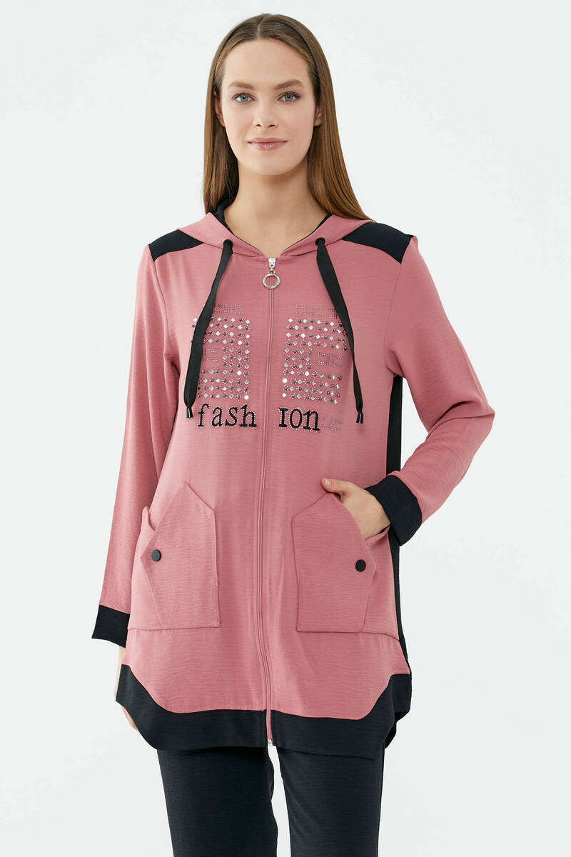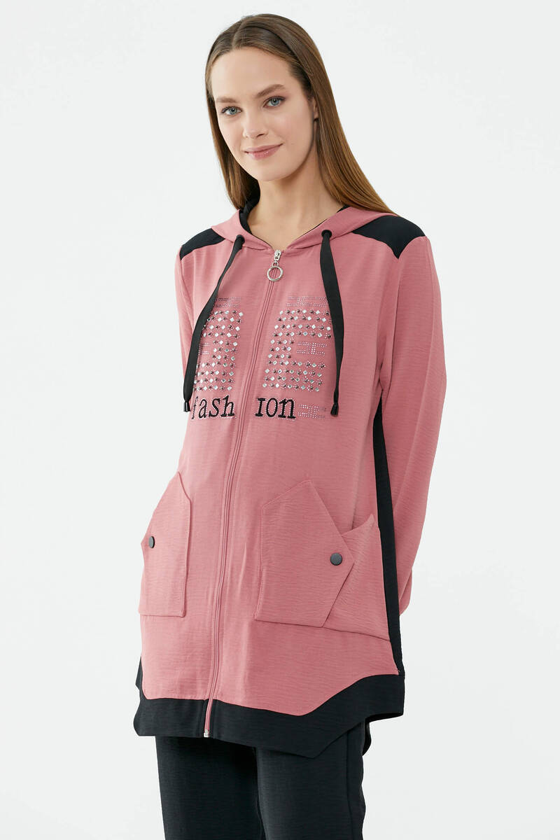 Kapüşonlu, uzun kollu, fermuar kapamasıyla kullanım kolaylığı sunan, taş detayına sahip tunik ve beli lastikli, boru paça pantolondan oluşan krep takım ile siz de etkileyici görünümler yaratın.