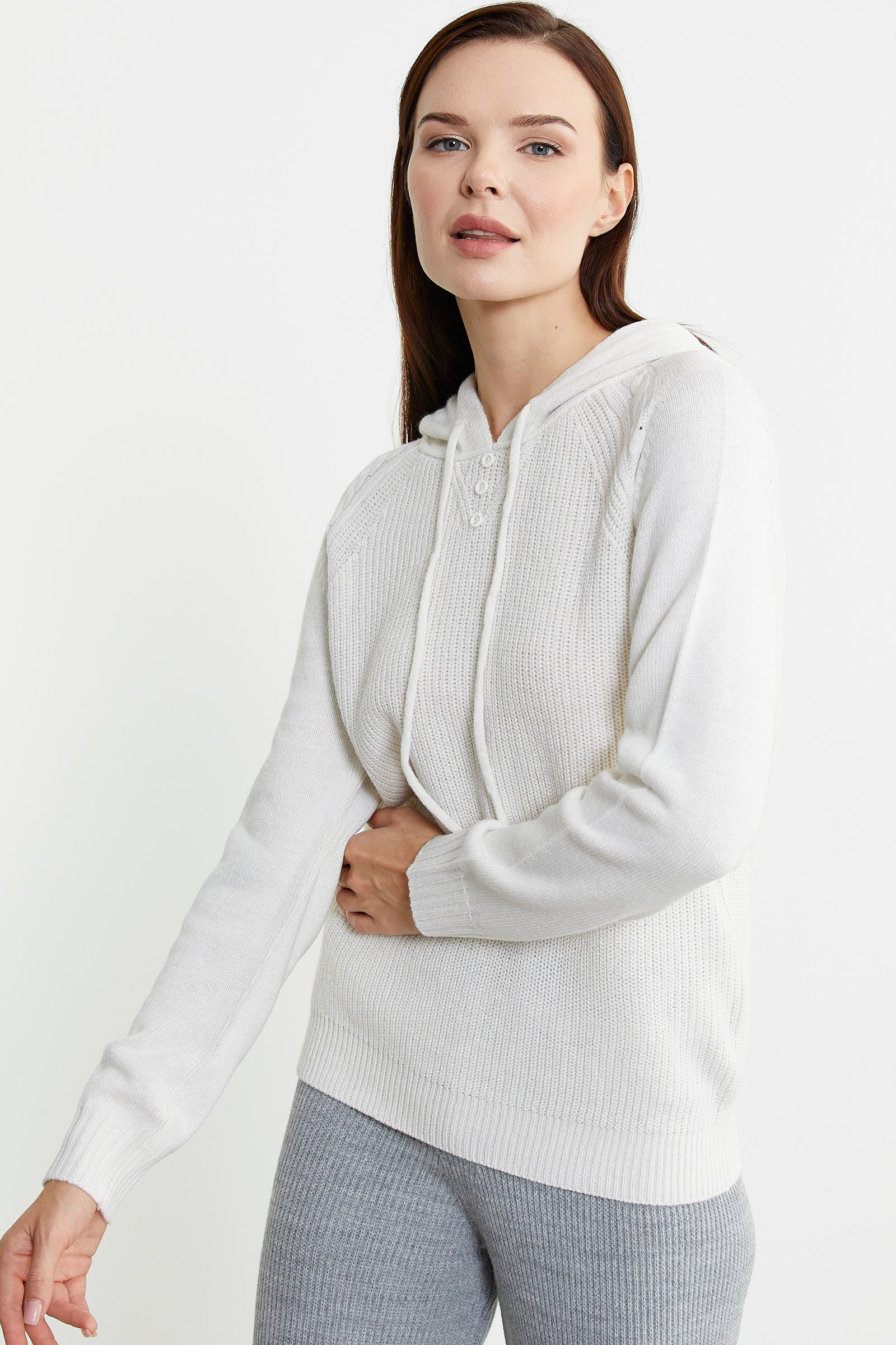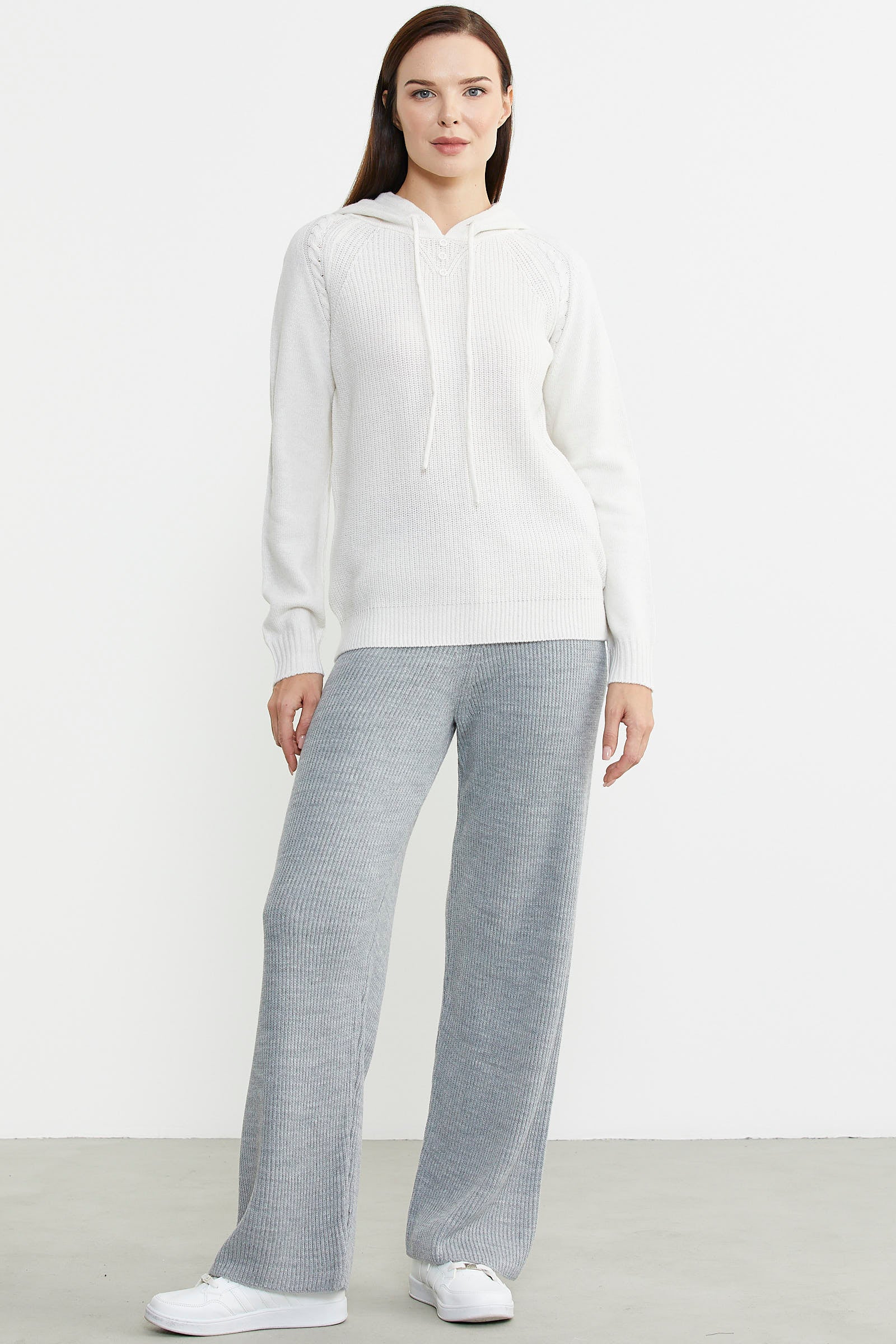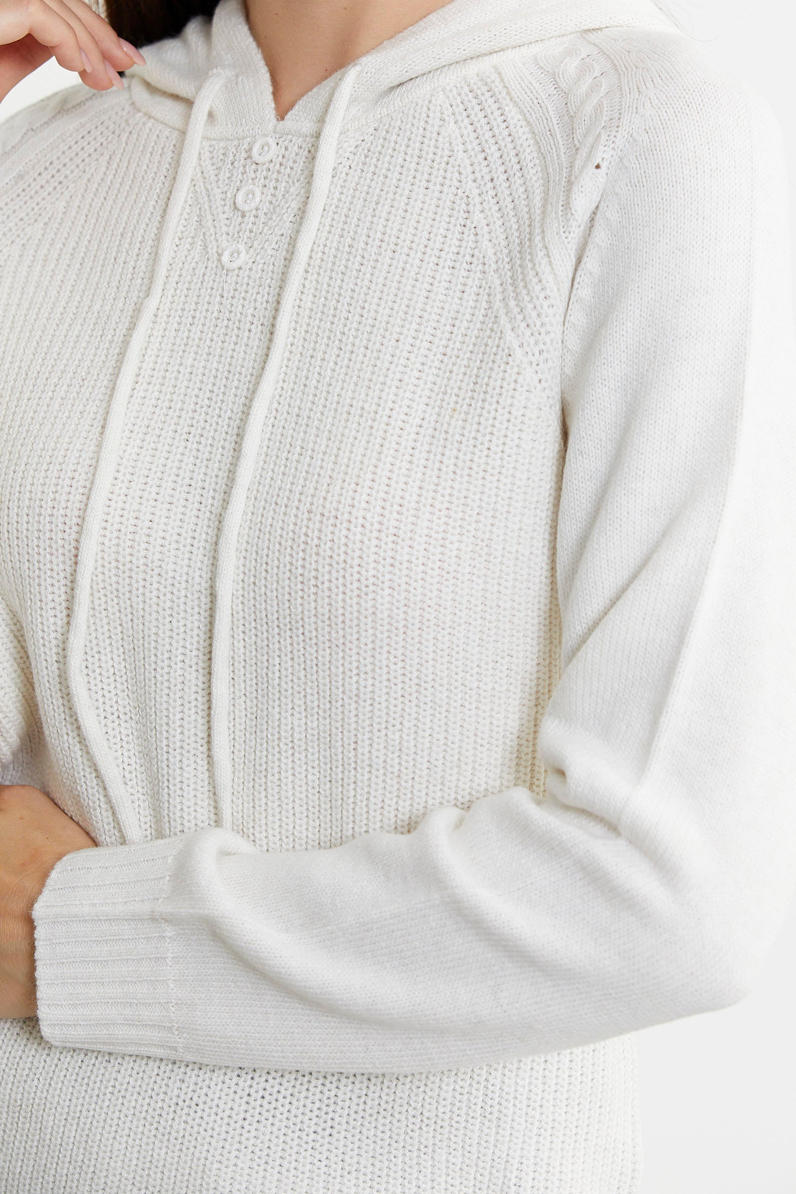 Kapüşonlu Dökümlü Yünlü Triko Kazak - Kemik