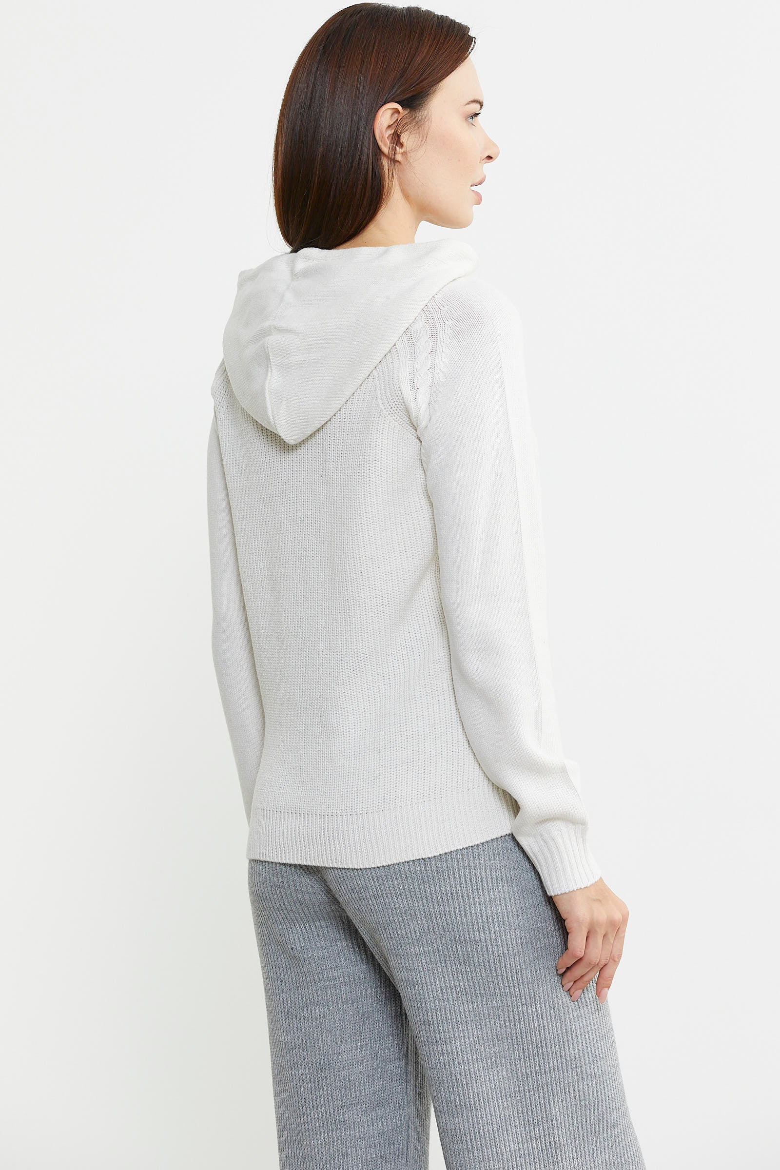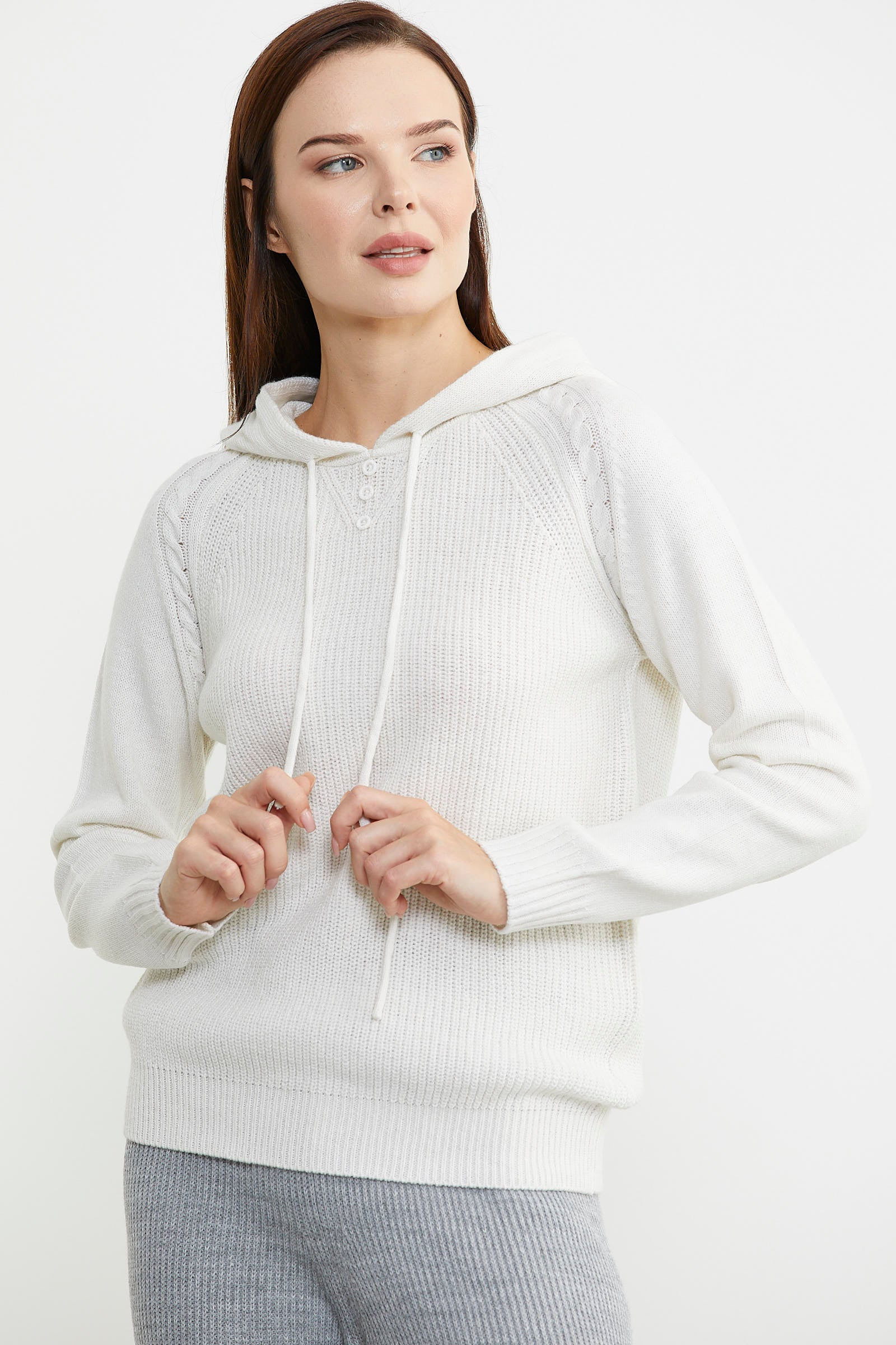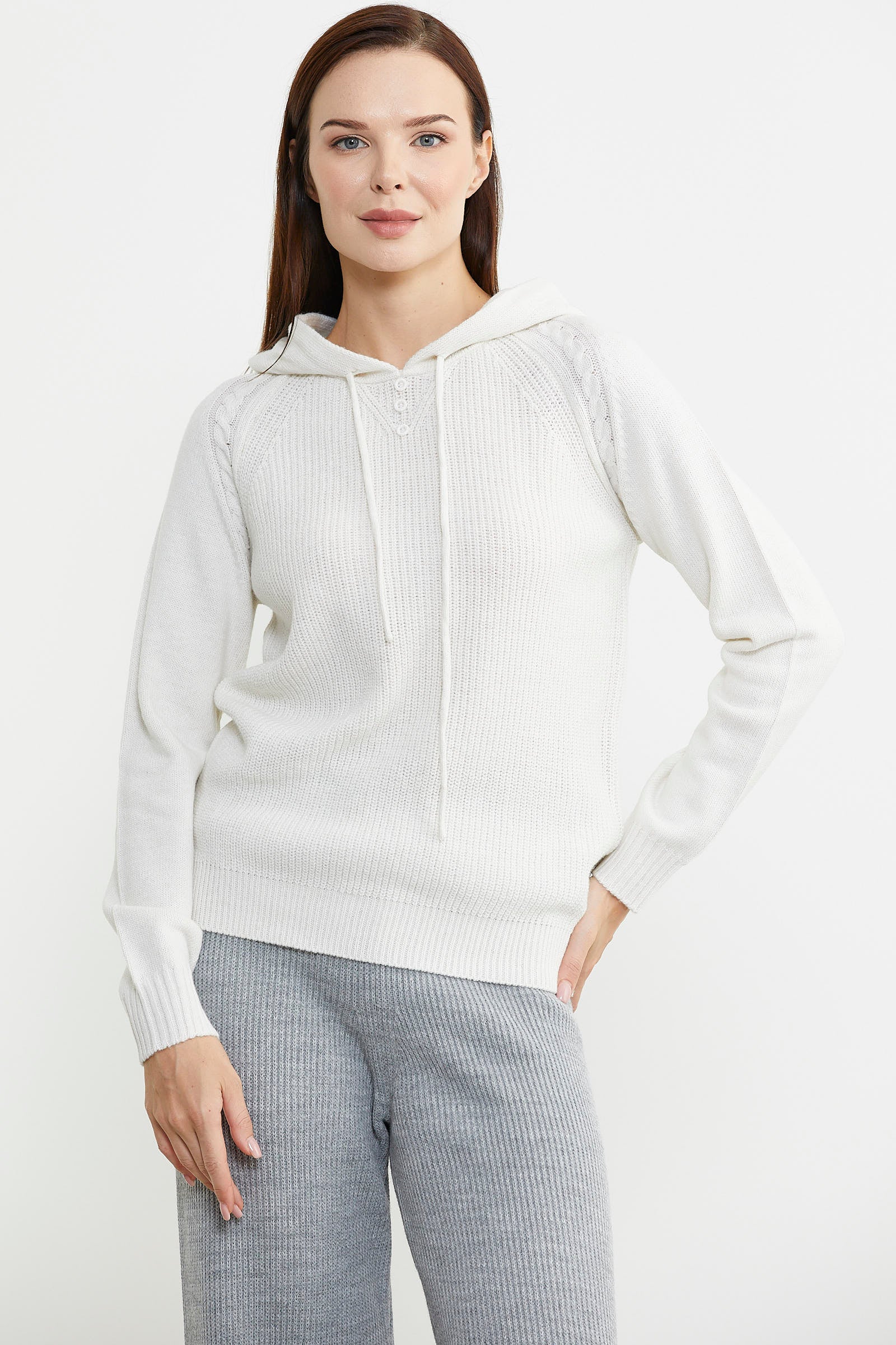 Kapüşonlu Dökümlü Yünlü Triko Kazak - Kemik