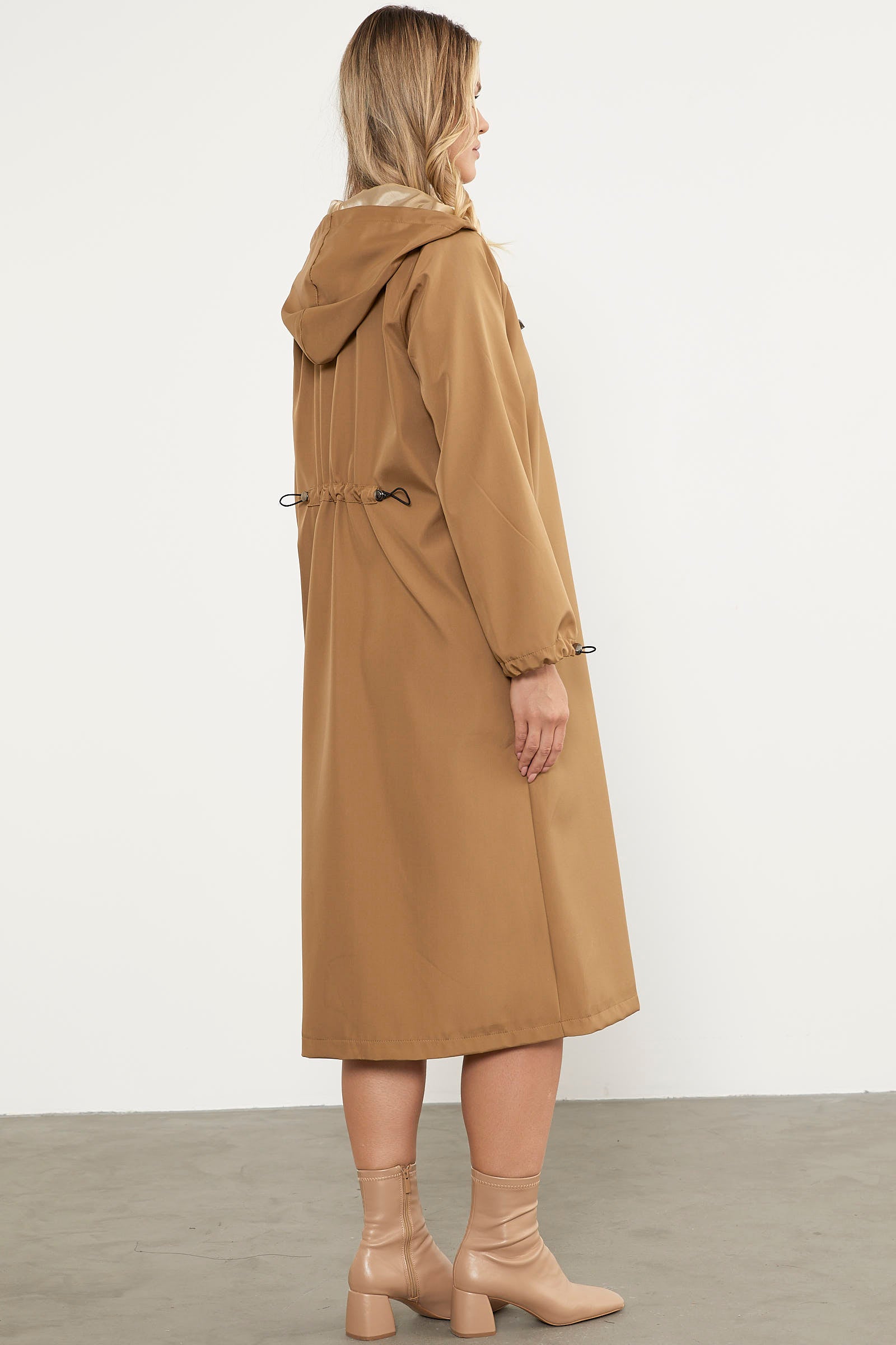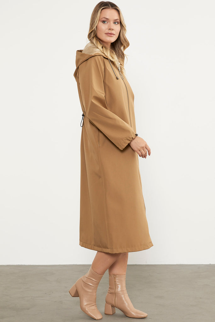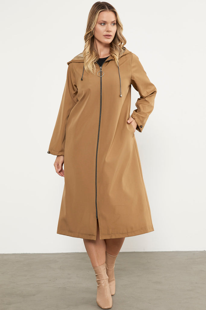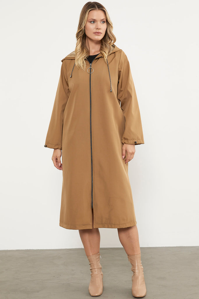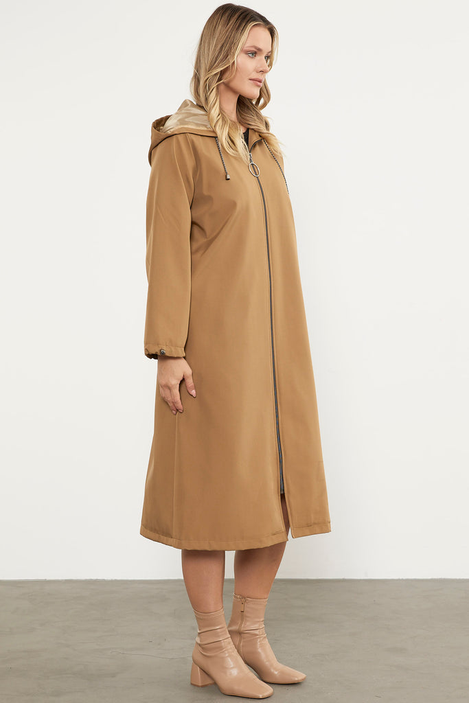 Kapüşonlu Fermuarlı Uzun Trençkot - Vizon