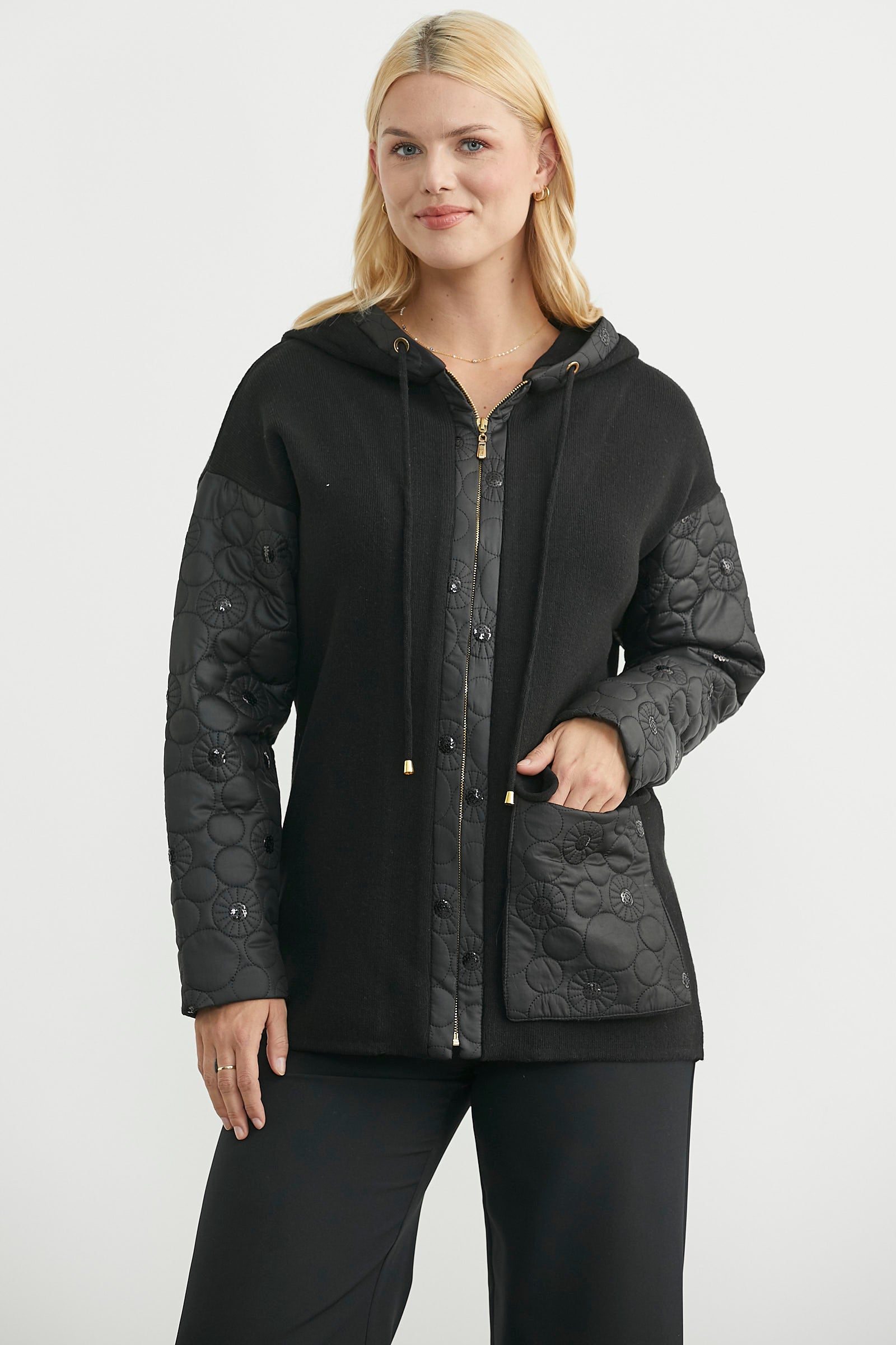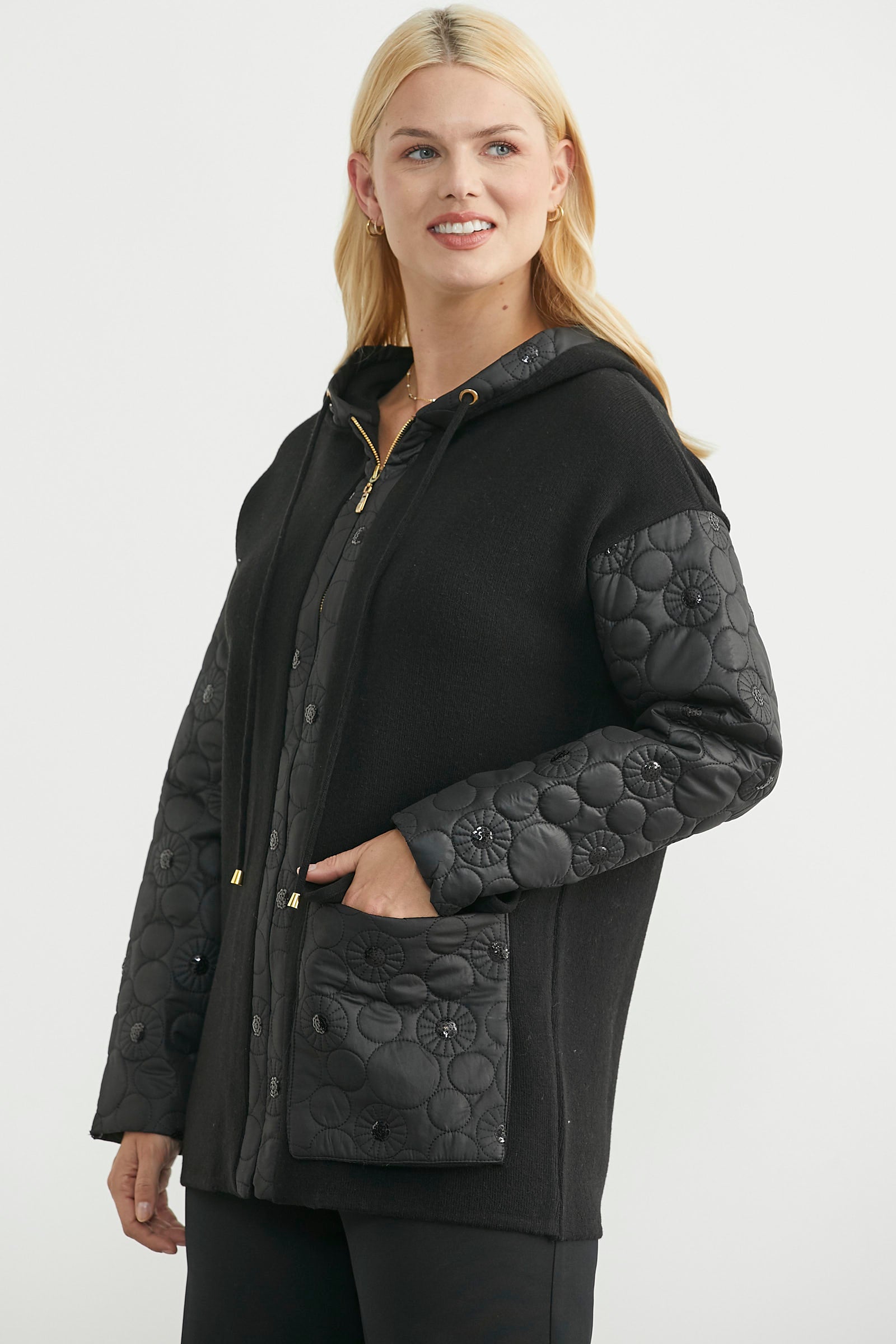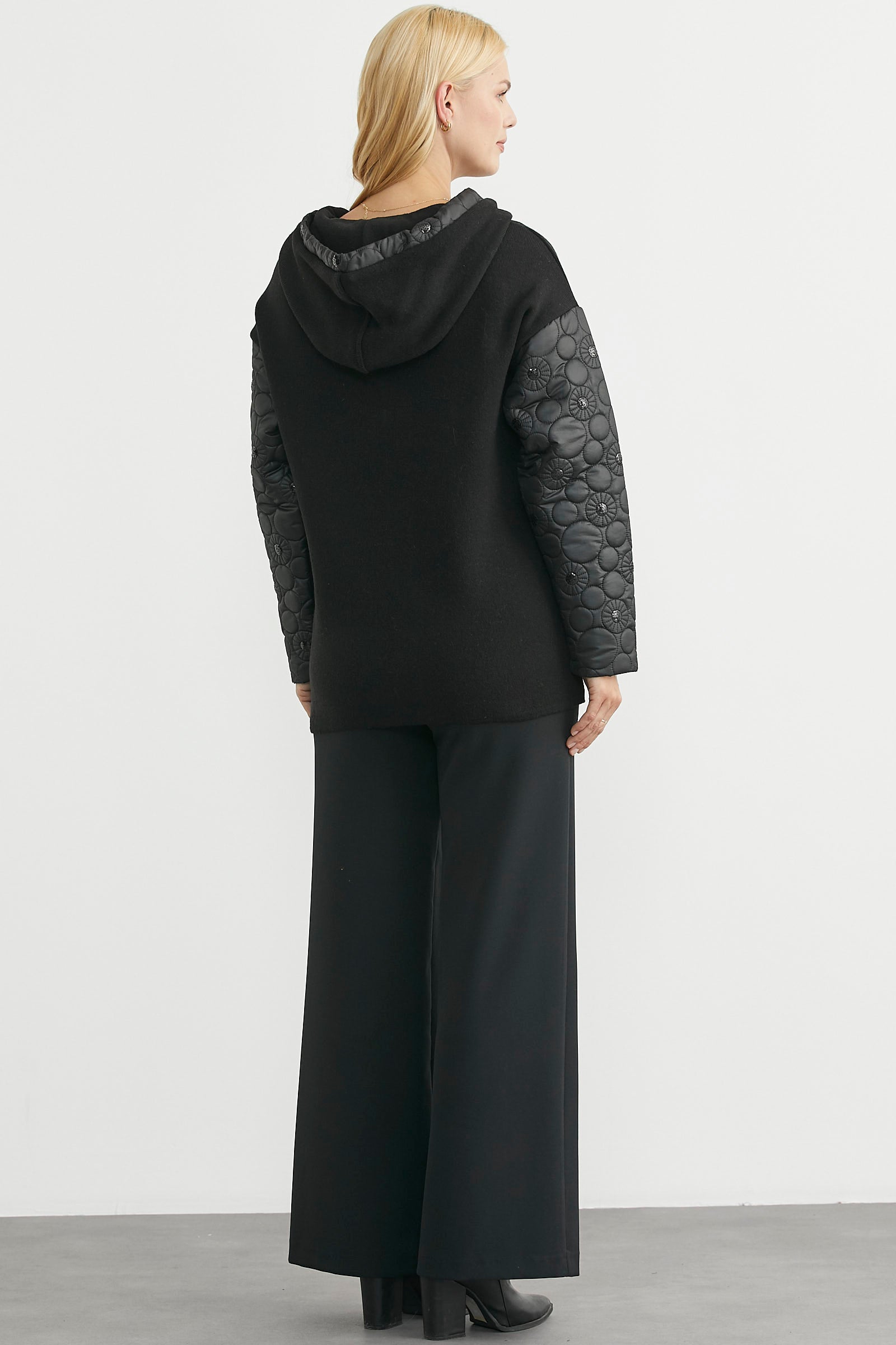 Kapüşonlu Kapitone Detaylı Triko Ceket - Siyah