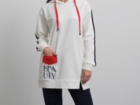 Kapüşonlu, kolları şerit detaylı, ön kısmında yırtmaç bulunan sweatshirt ve boru paça alttan oluşan takım ile haftasonu stilinizi oluşturun.