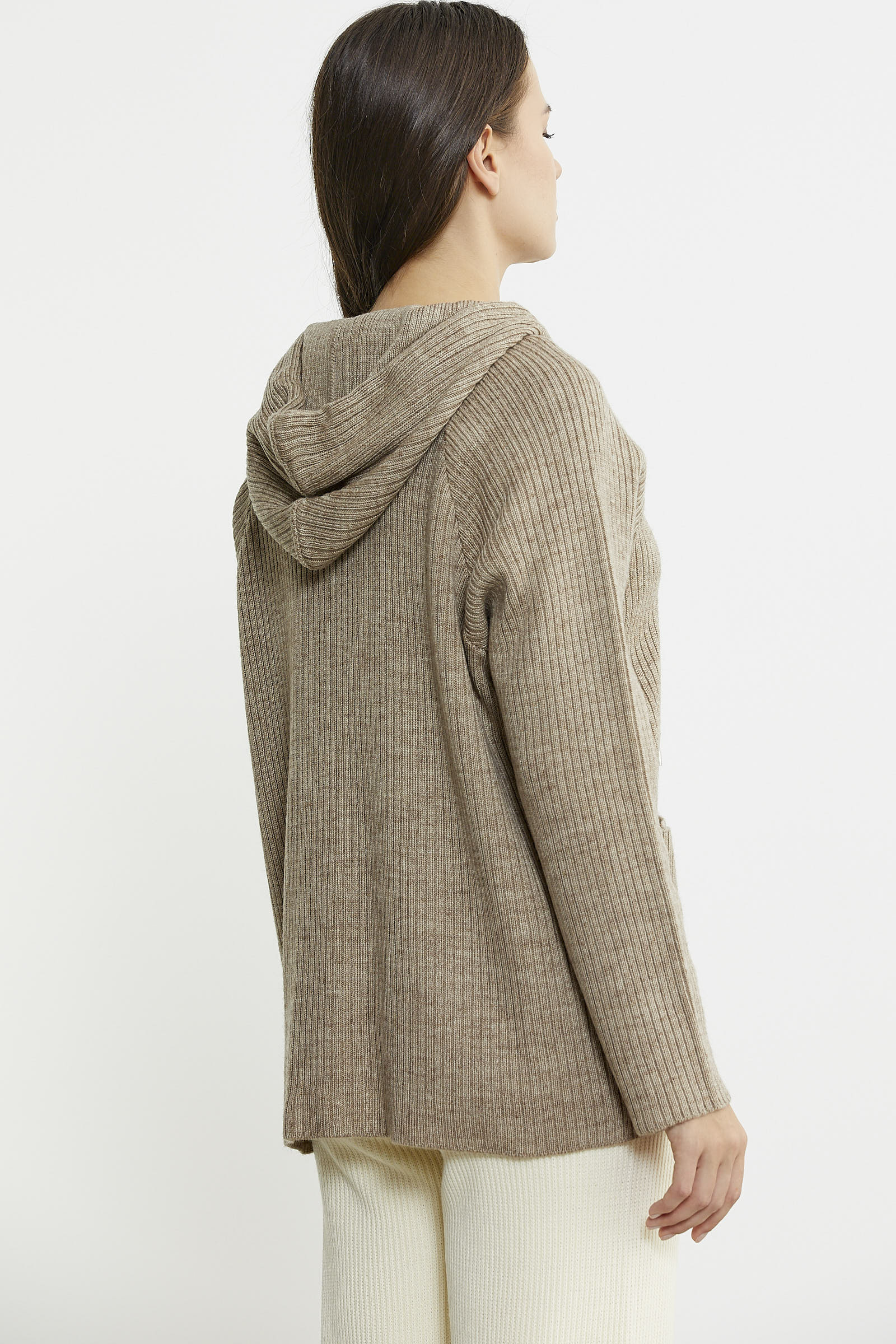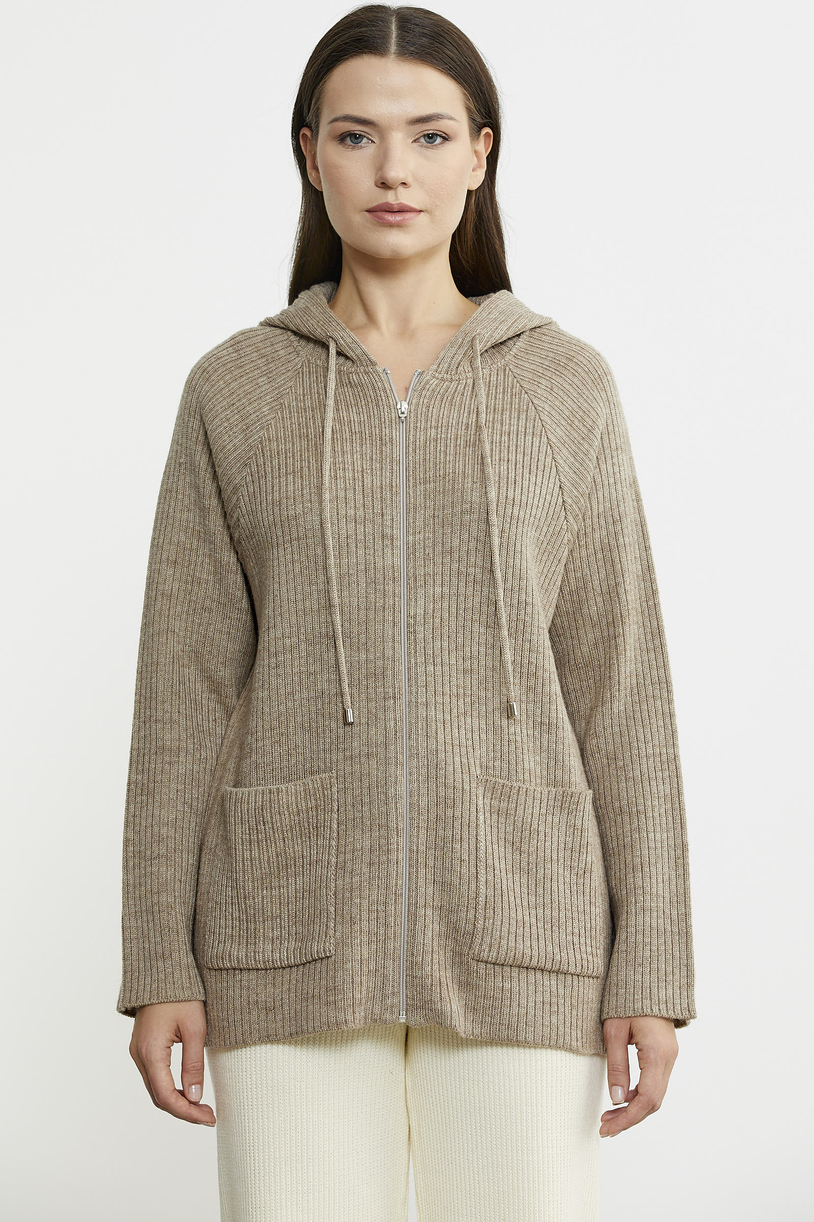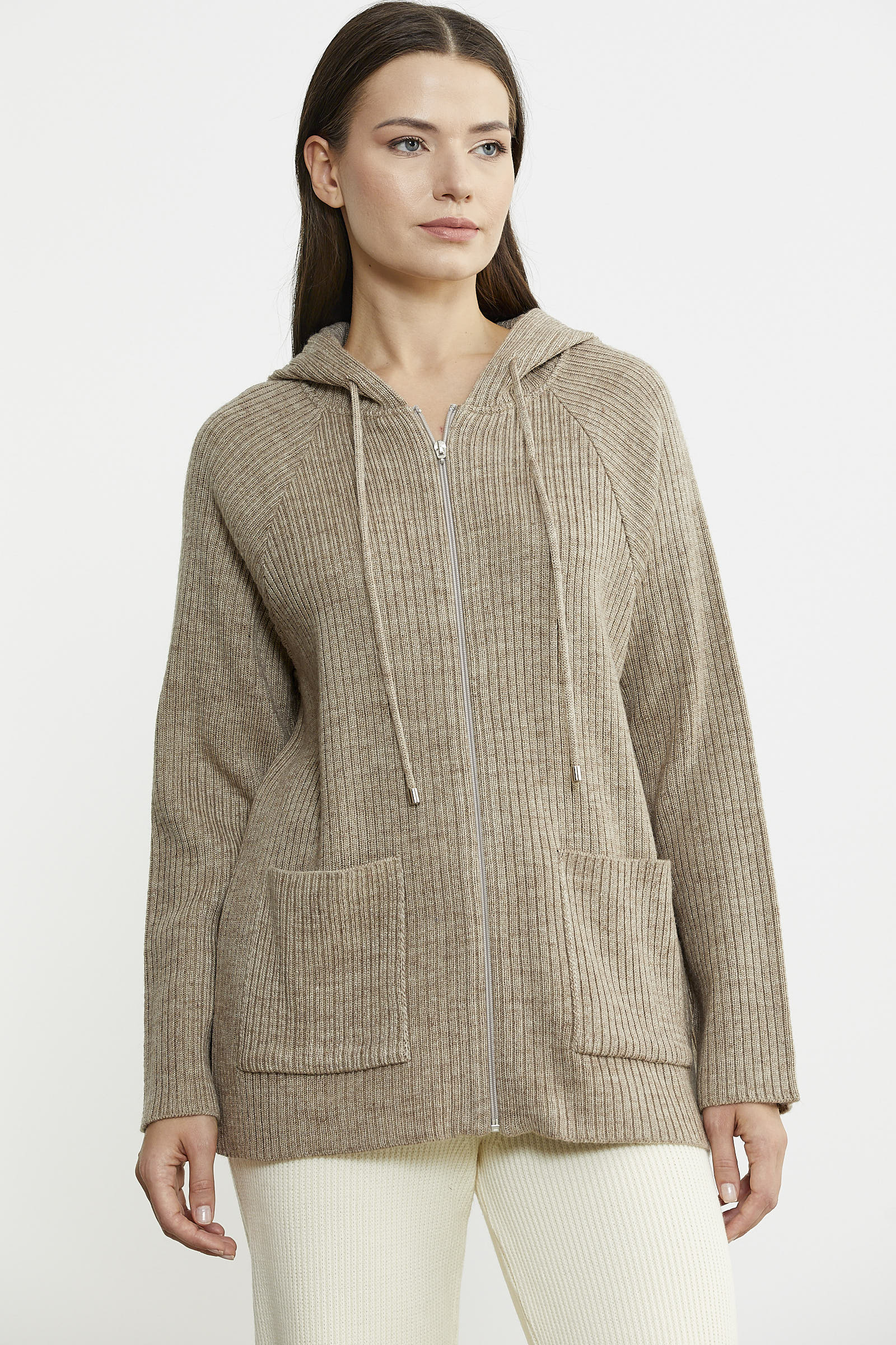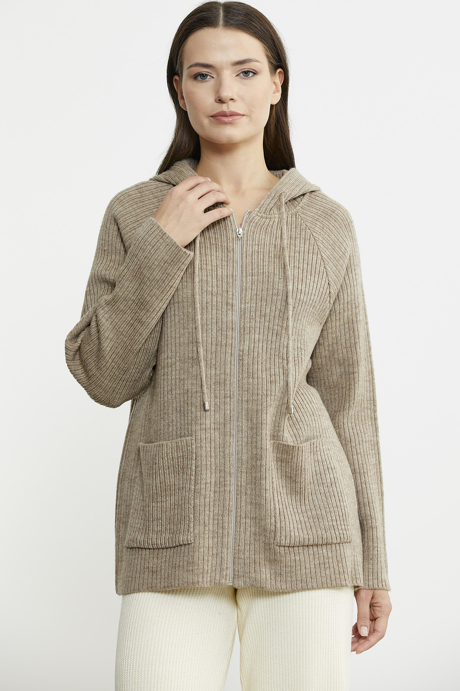 Kapüşonlu Tam Fermuarlı Yünlü Triko Hırka - Koyu Bej