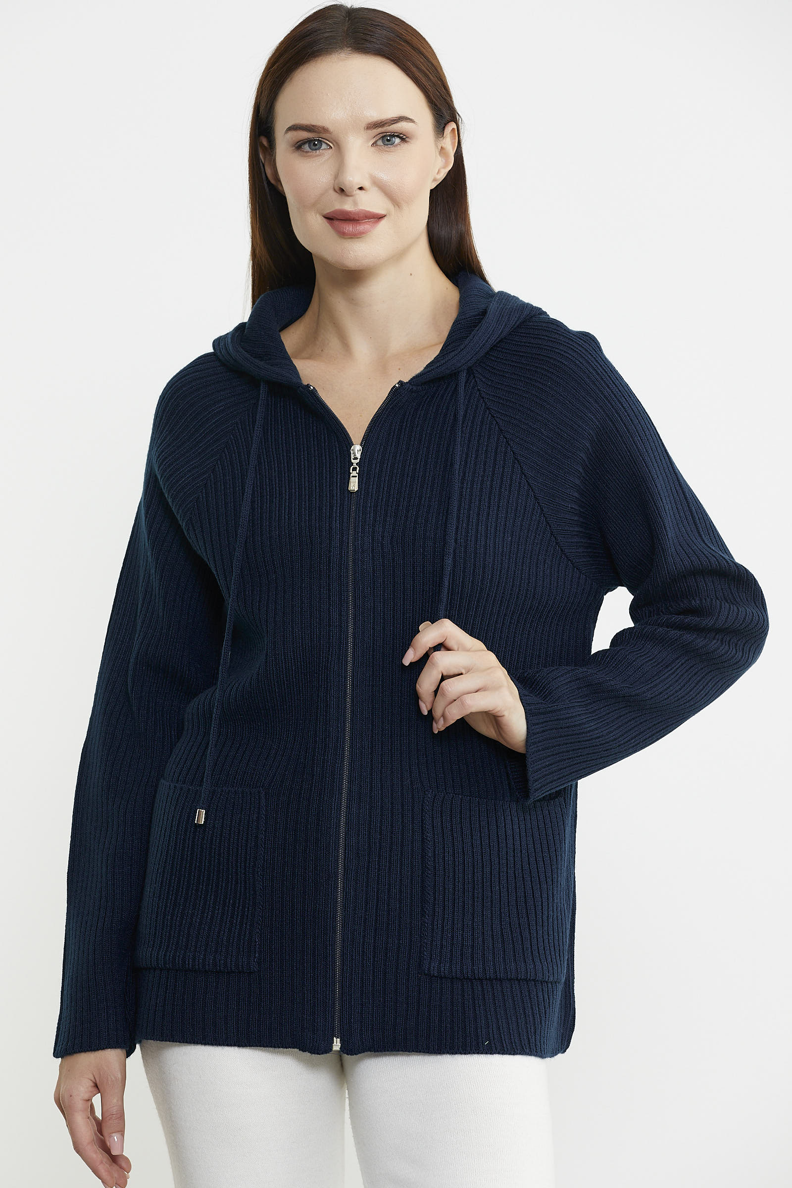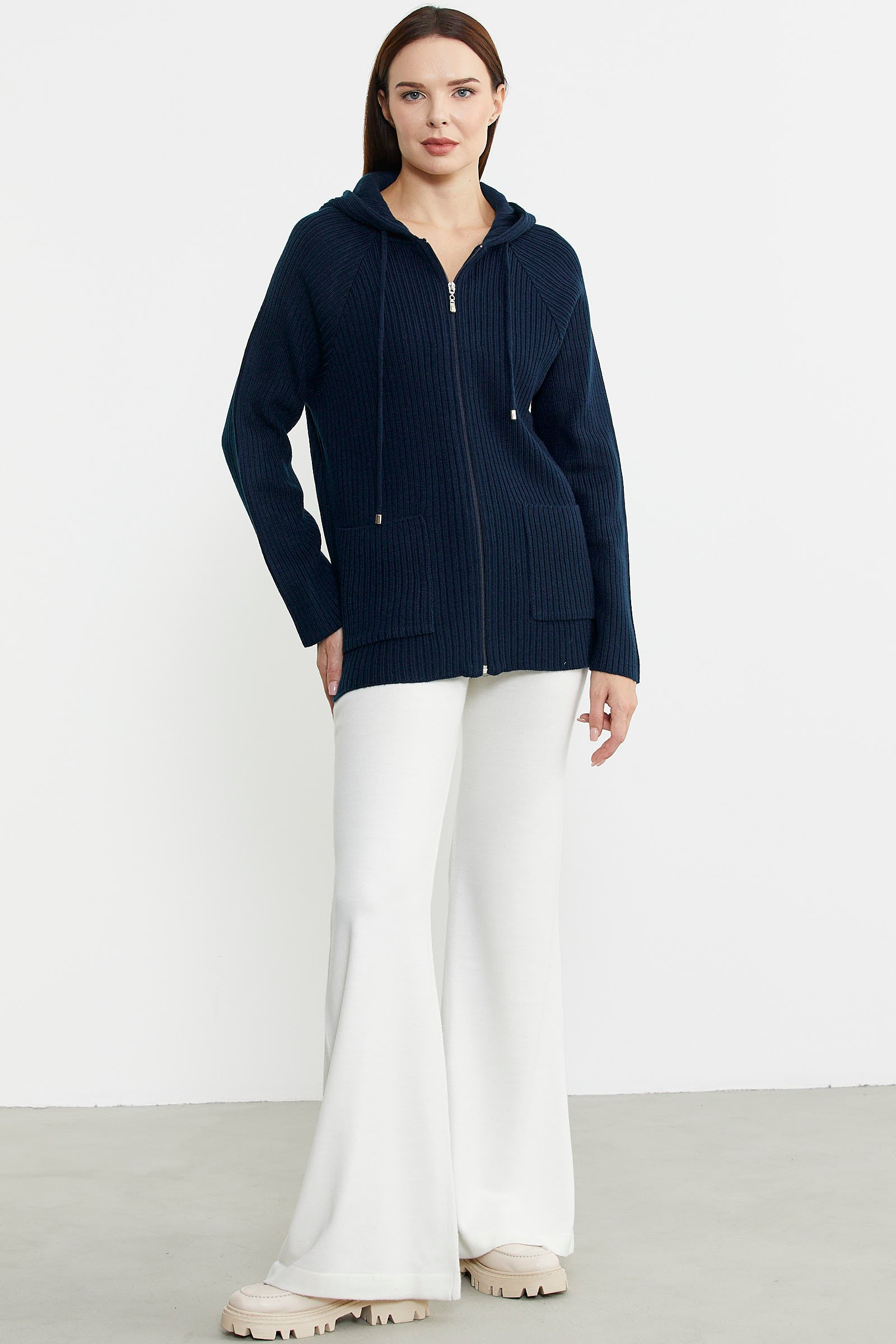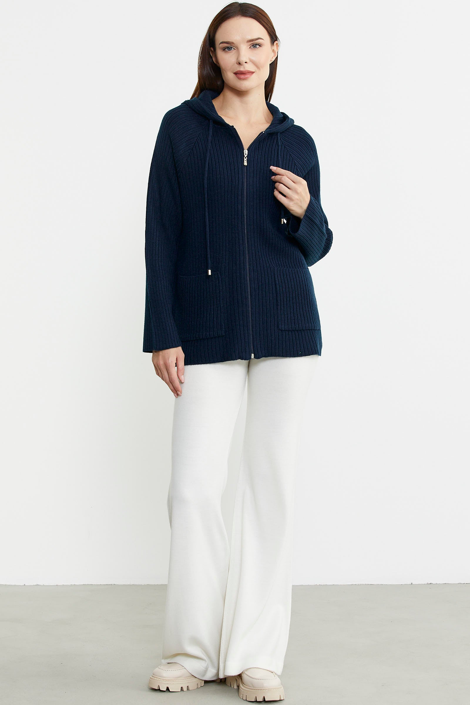 Kapüşonlu, fermuar kapamalı triko hırka yüksek oranda yün içermektedir. Cep detayıyla günlük kullanım için ideal tasarlanmıştır.