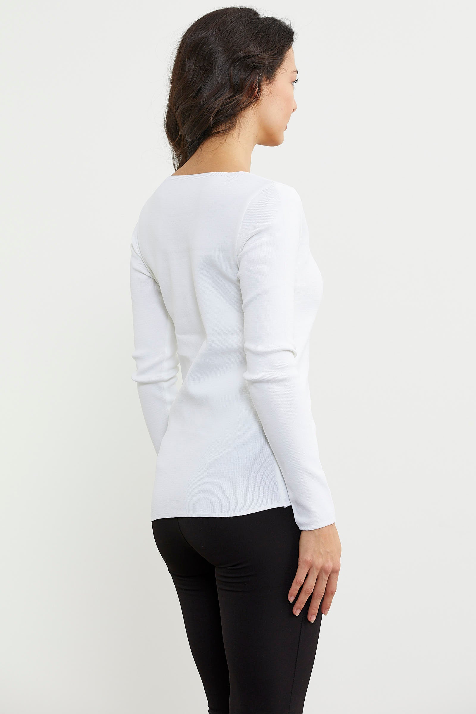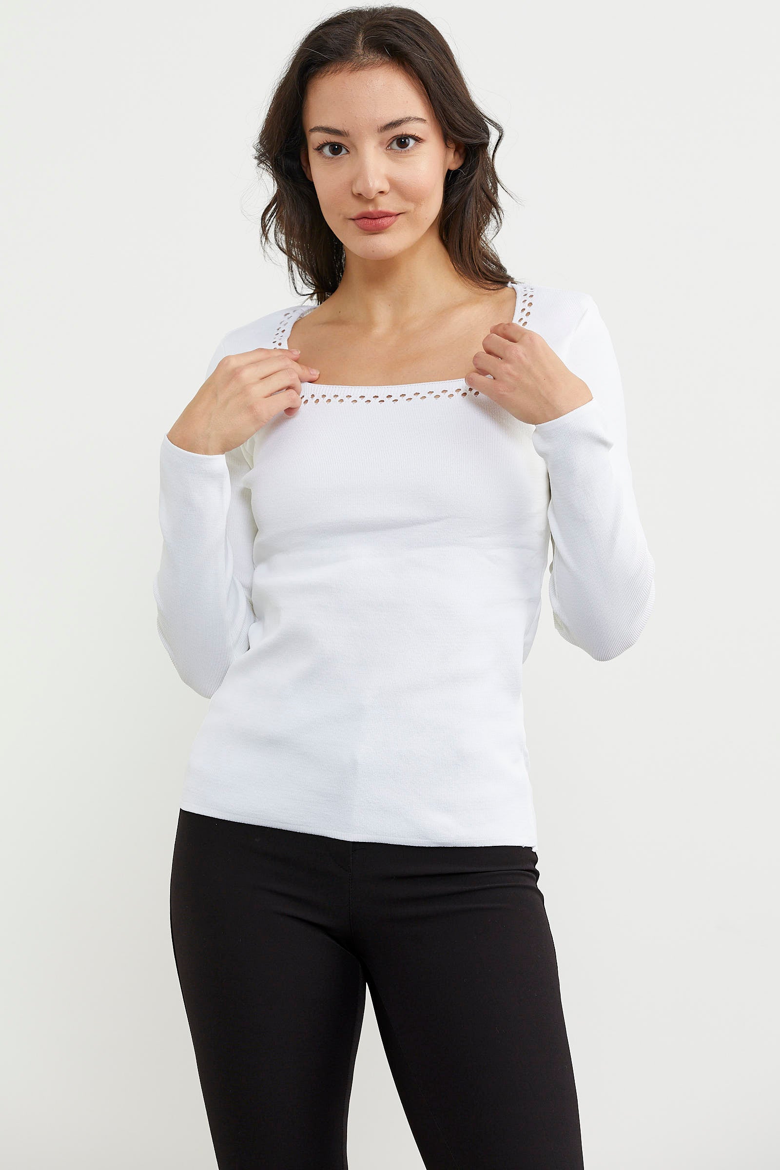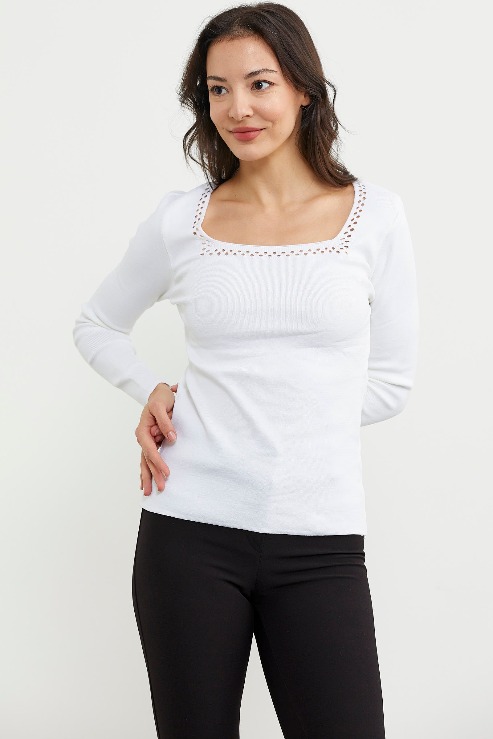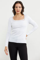 Sadeliğin verdiği zarifliği üzerinizde hissedeceğiniz yaka detaylı uzun kollu tasarımıyla vücudunuza mükemmel uyum sağlayacak kare yaka triko kazak yoğun günlerinizin kurtarıcısı olacaktır.