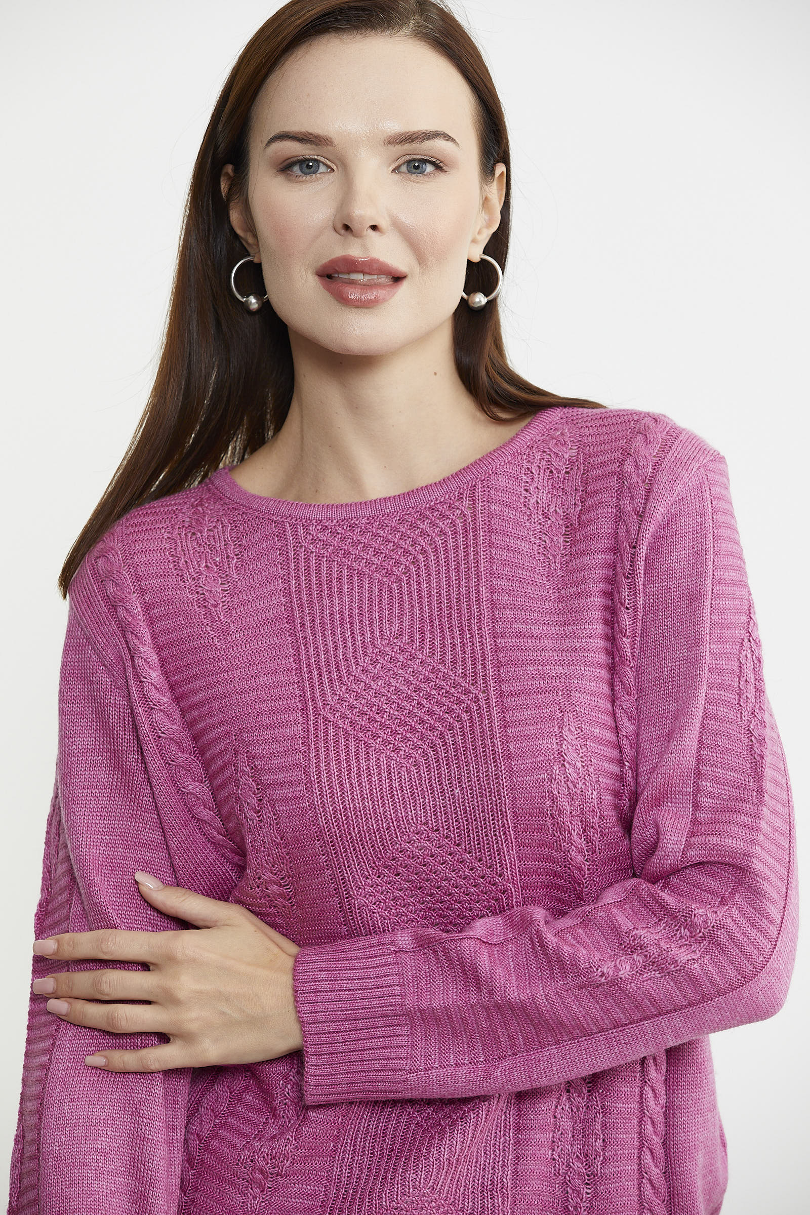 Daire yaka triko kazak rahat kalıp olarak üretilmiştir. Ön bedende ve kolda farklı motifler birleştirilerek hareketlendirilmiştir.