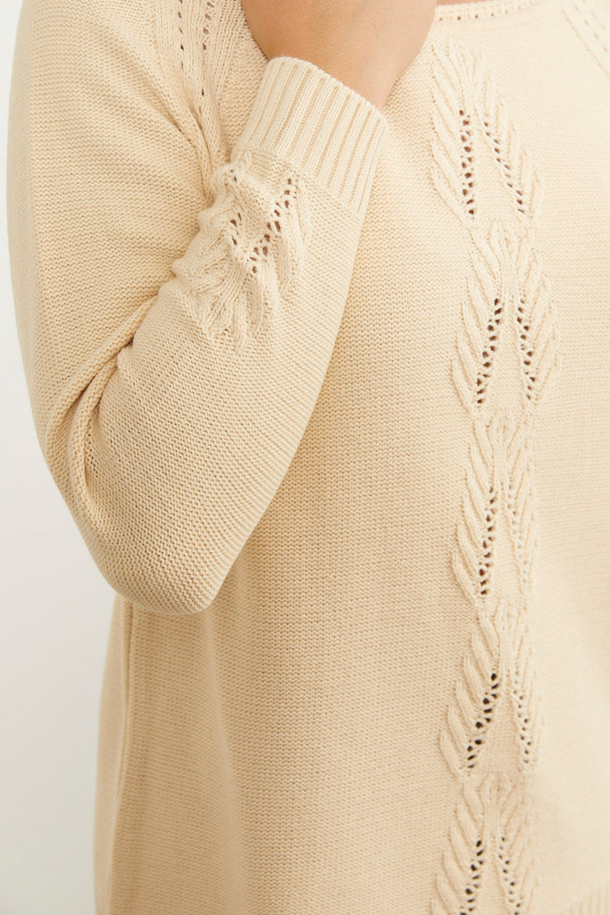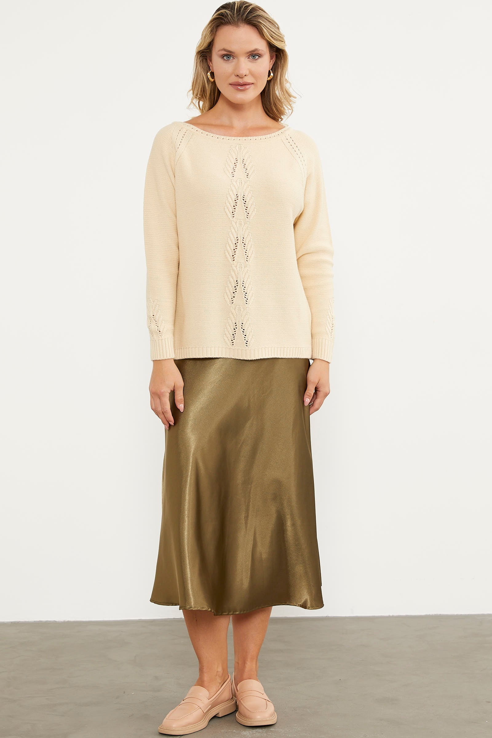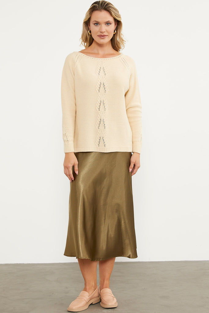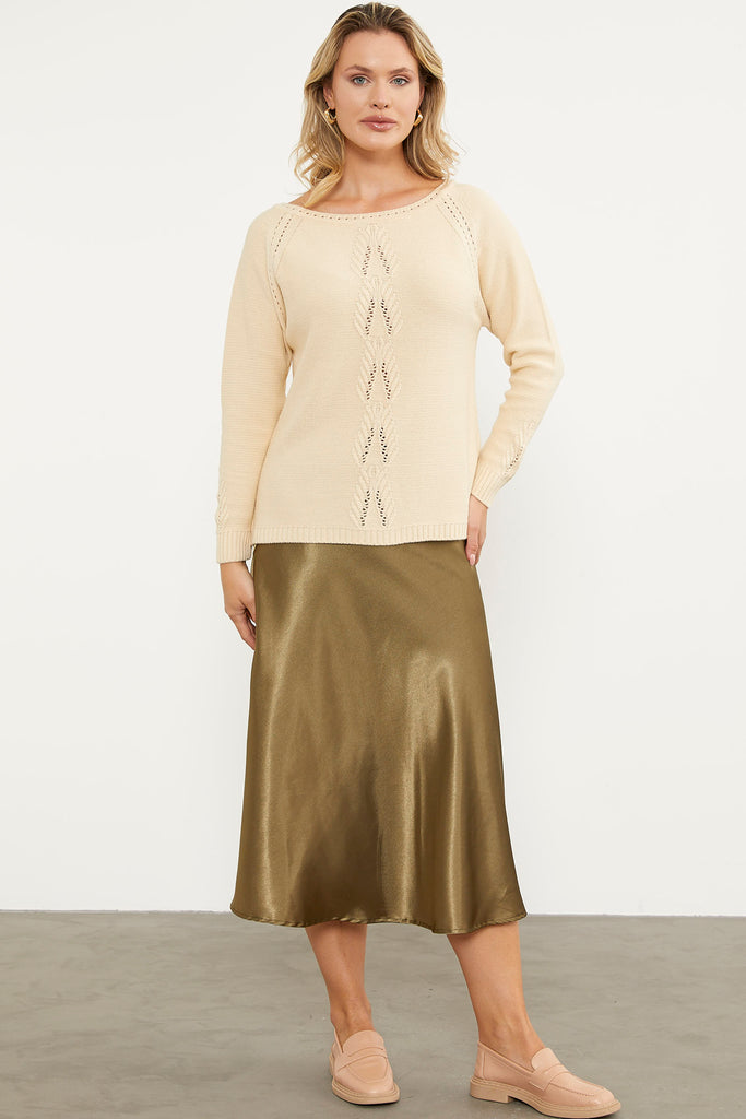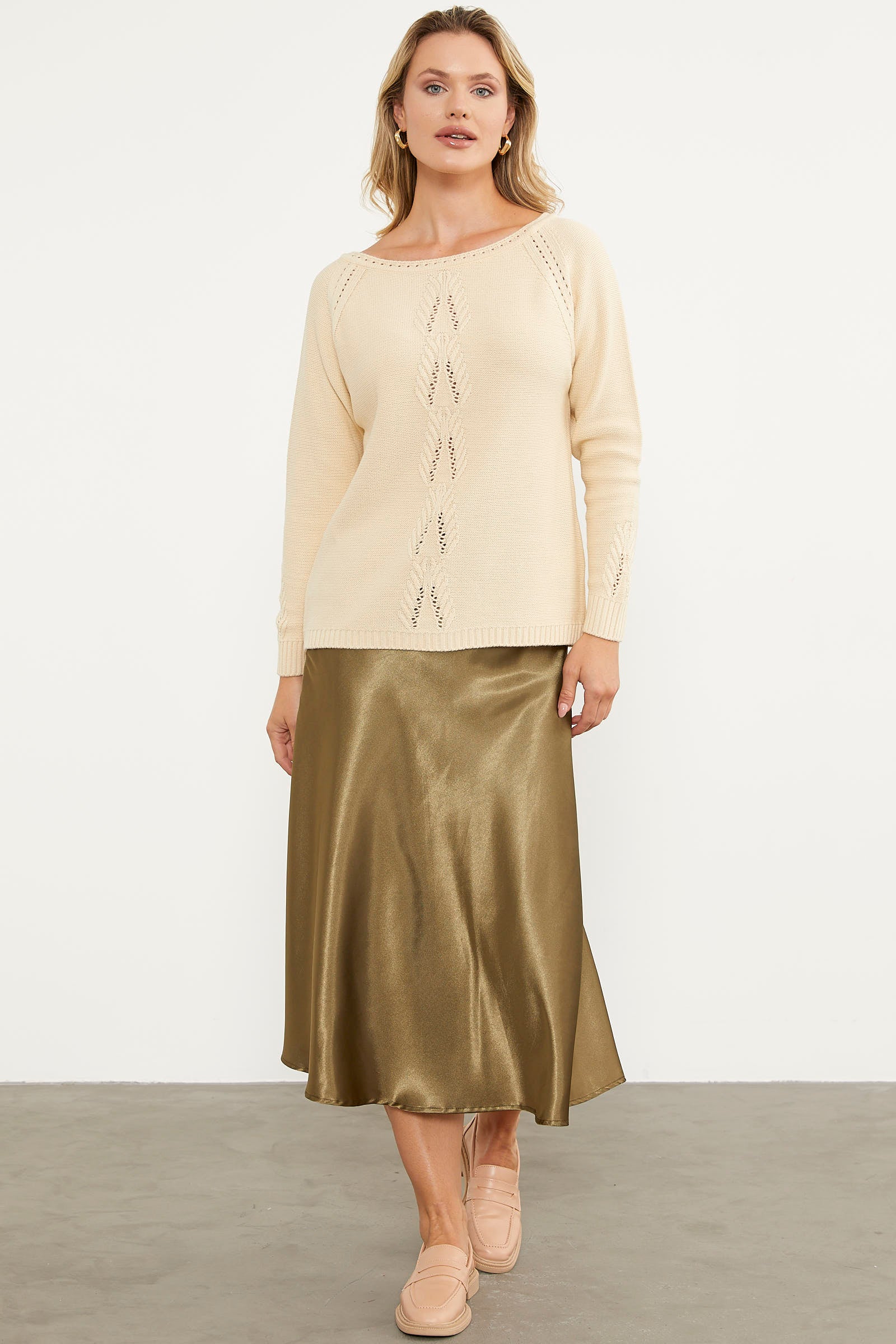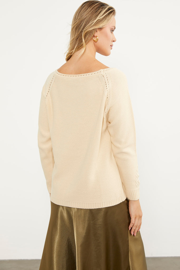 Kayık Yaka Motif Detaylı Triko Kazak - Kemik