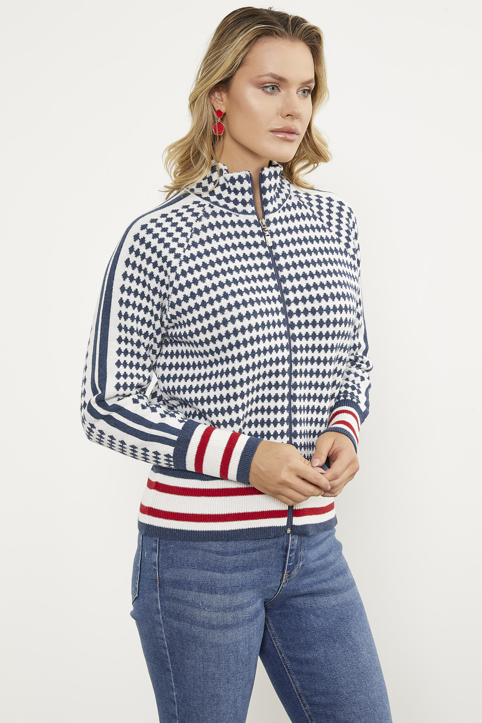 Vücuda mükemmel uyum sağlayan, kazayağı desenli, etek ucu, ve manşetlerinde renkli çizgili lastik detayına sahip fermuarlı triko hırka, hareketli tasarımıyla canlı bir enerji sunuyor. Basic kombinlerinizi bile dikkat çekecek hale getiren parça kış günlerinin vazgeçilmezi olmaya aday.