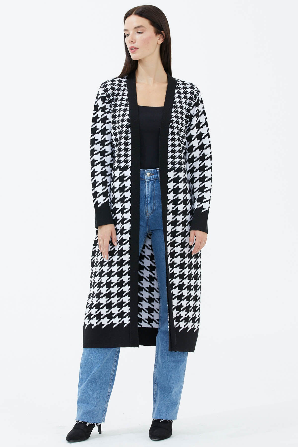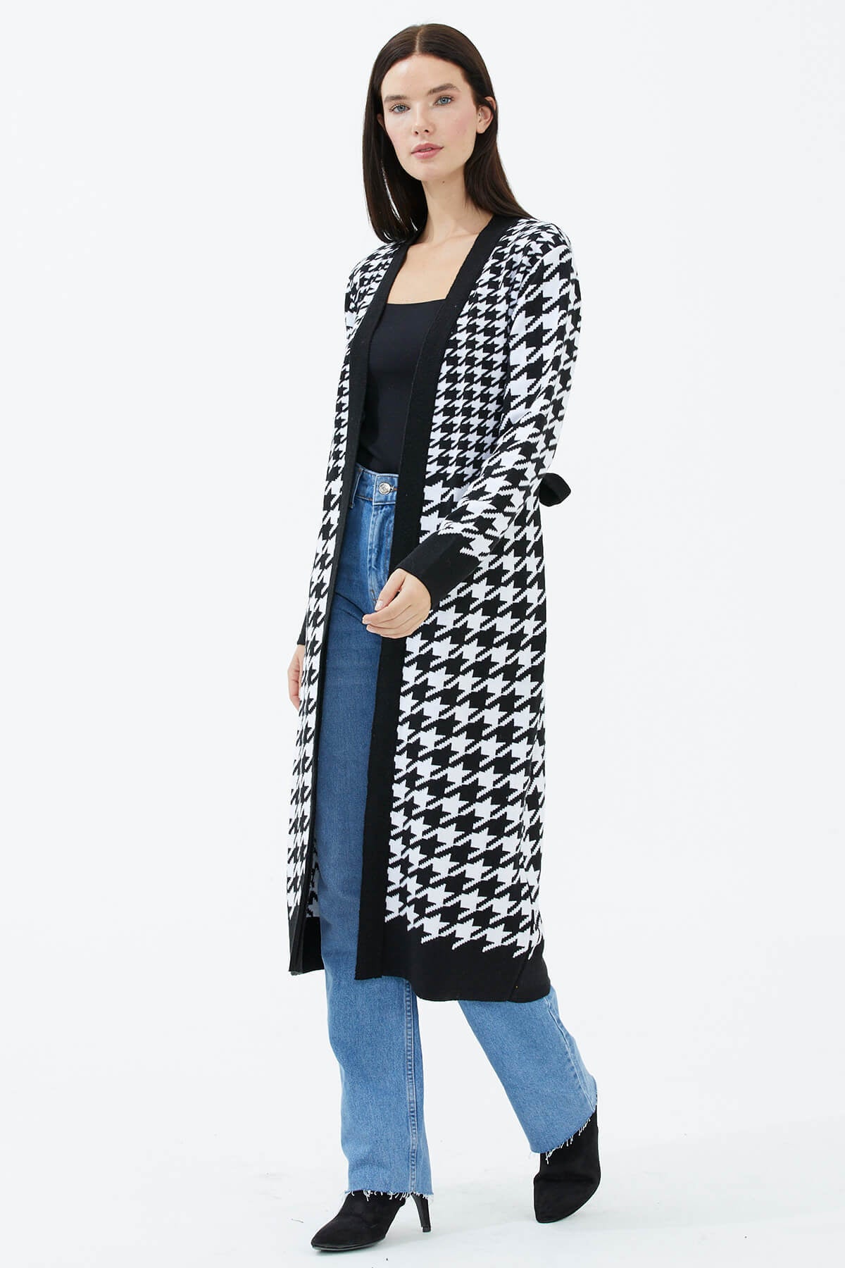 Kazayağı Desenli Uzun Kemerli Triko Hırka - Siyah