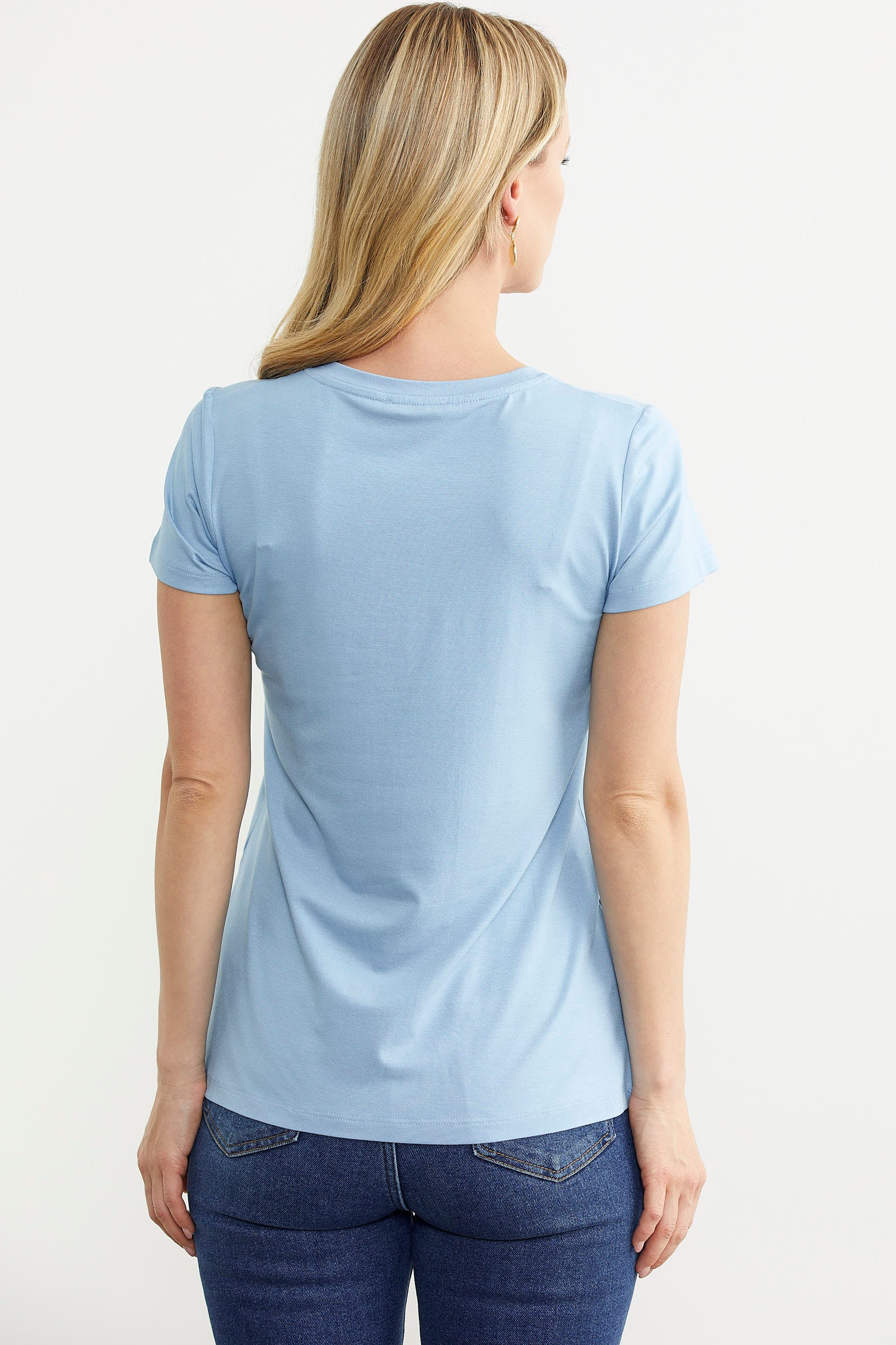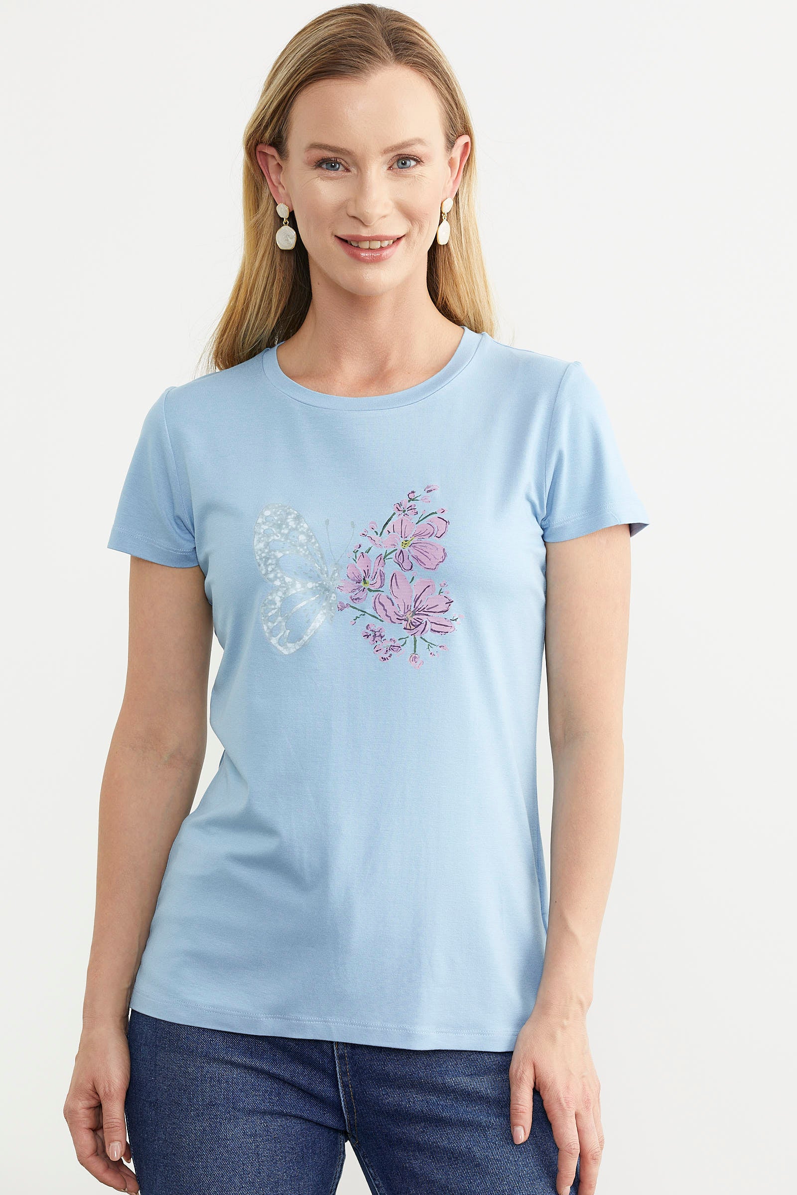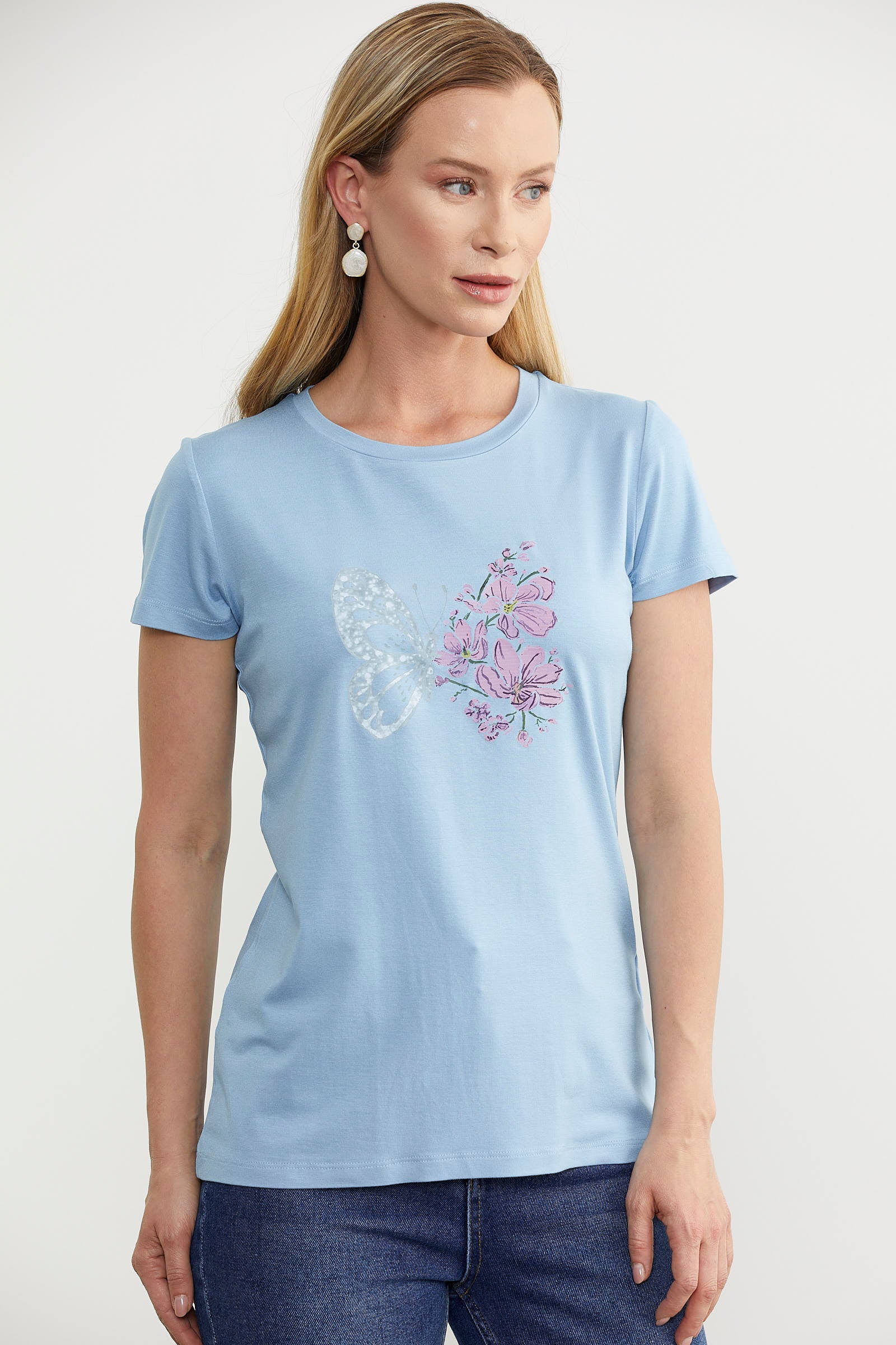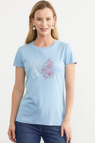 Kelebek Baskılı Basic Tişört - Mavi