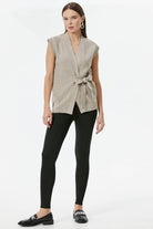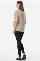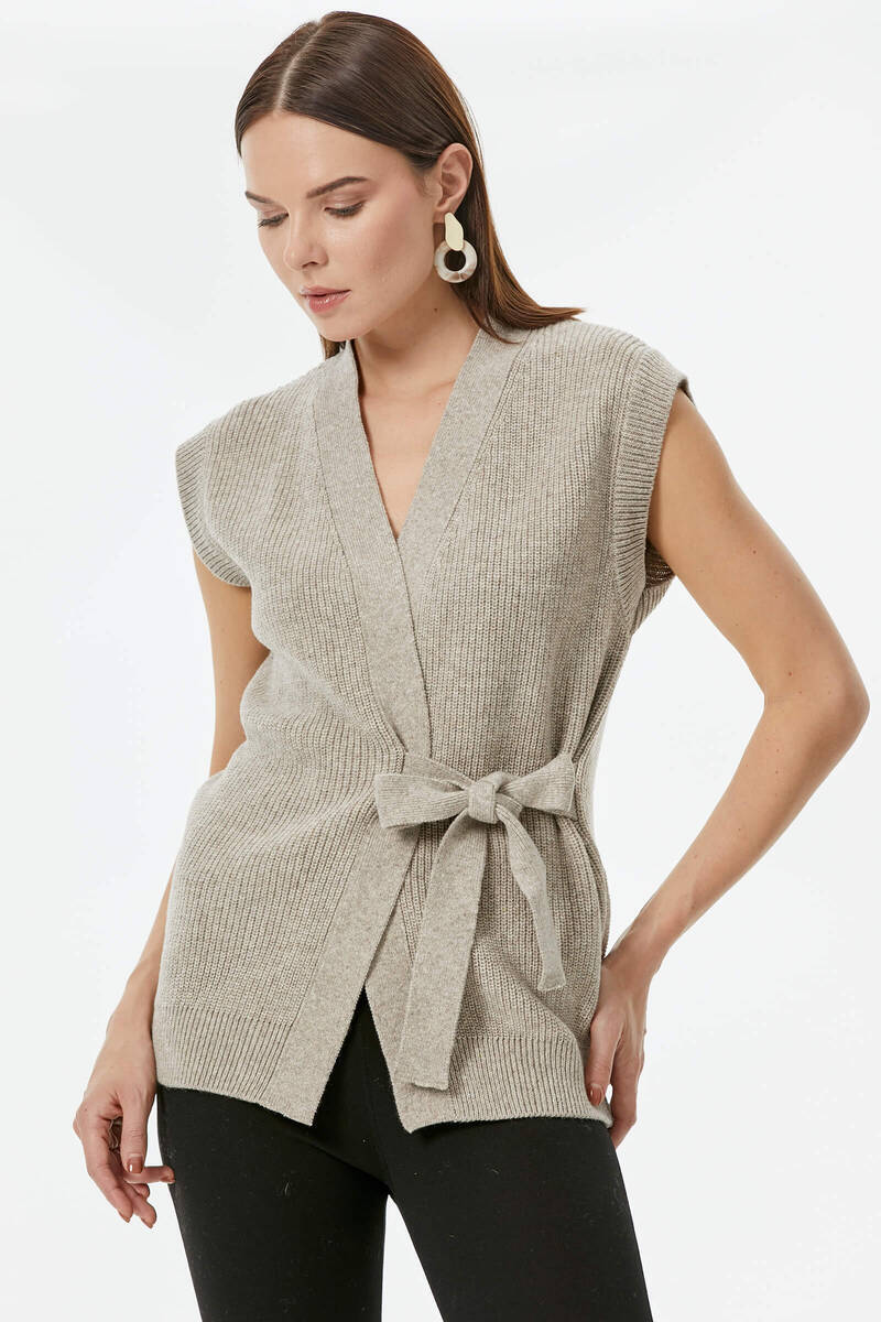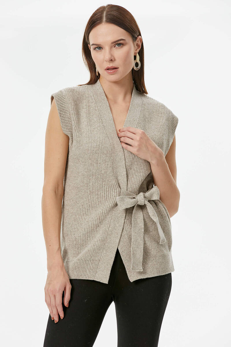 Kendinden Kemerli Yünlü Triko Yelek - Vizon