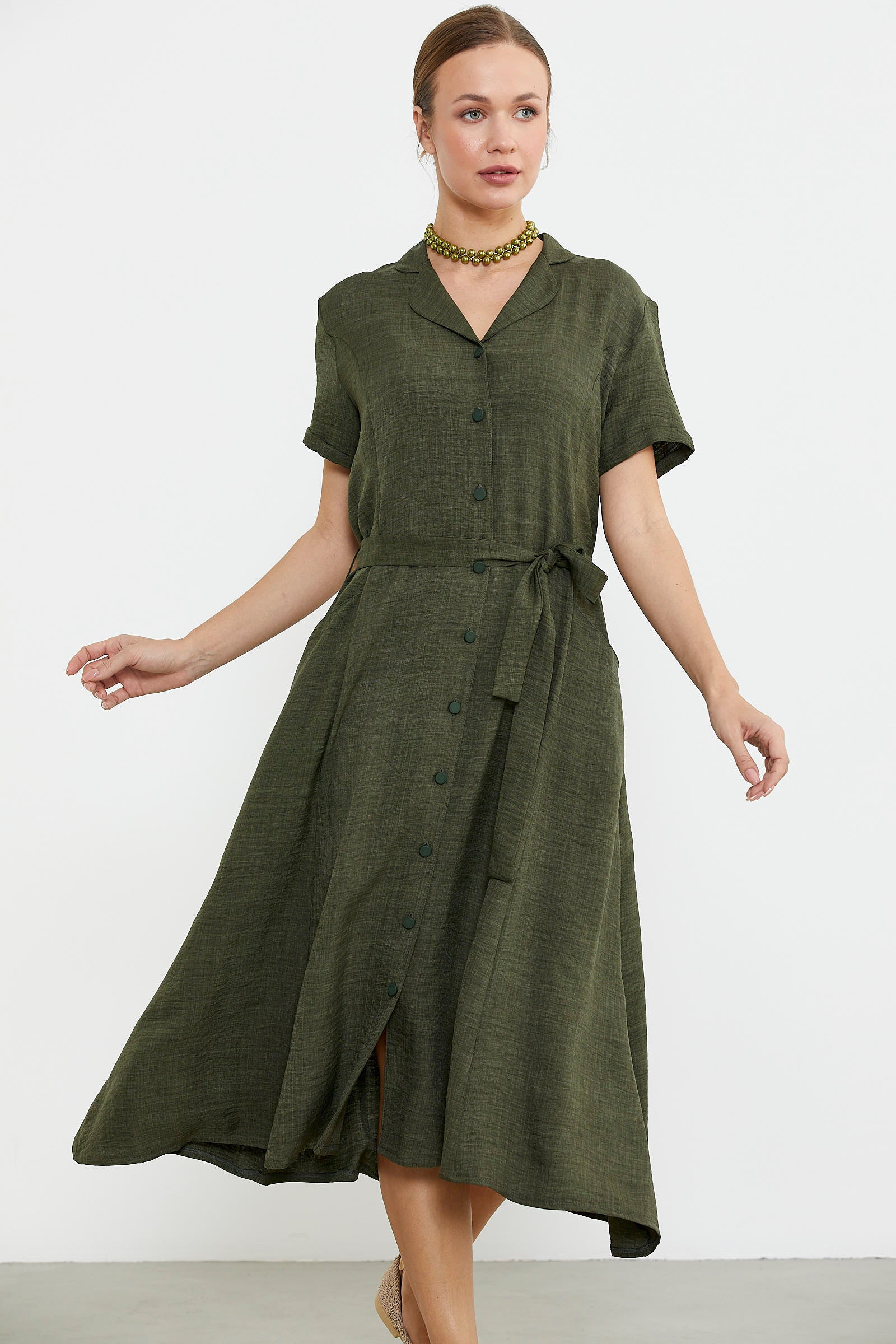 Keten Görünümlü Cepli Gömlek Elbise - Haki