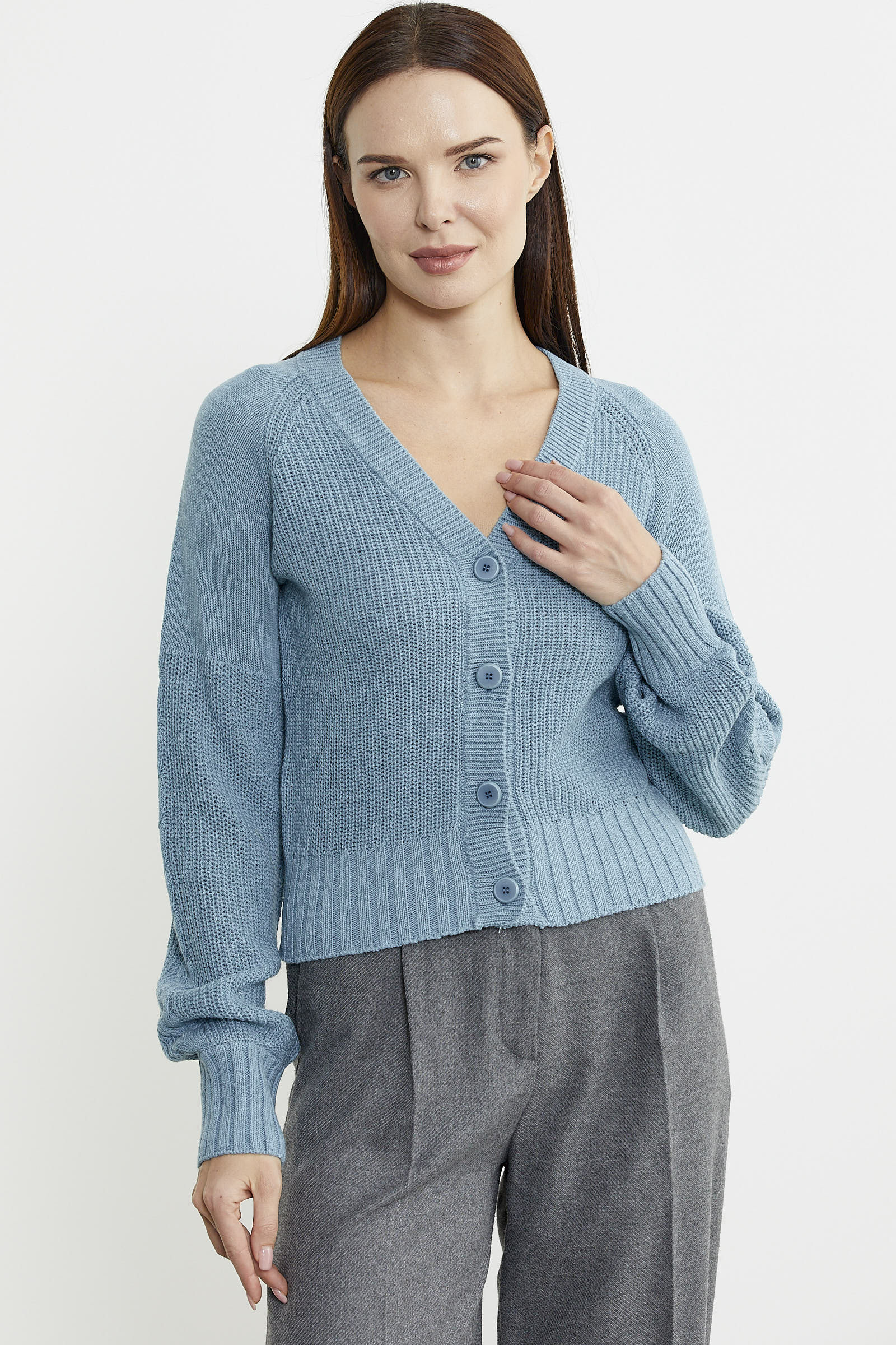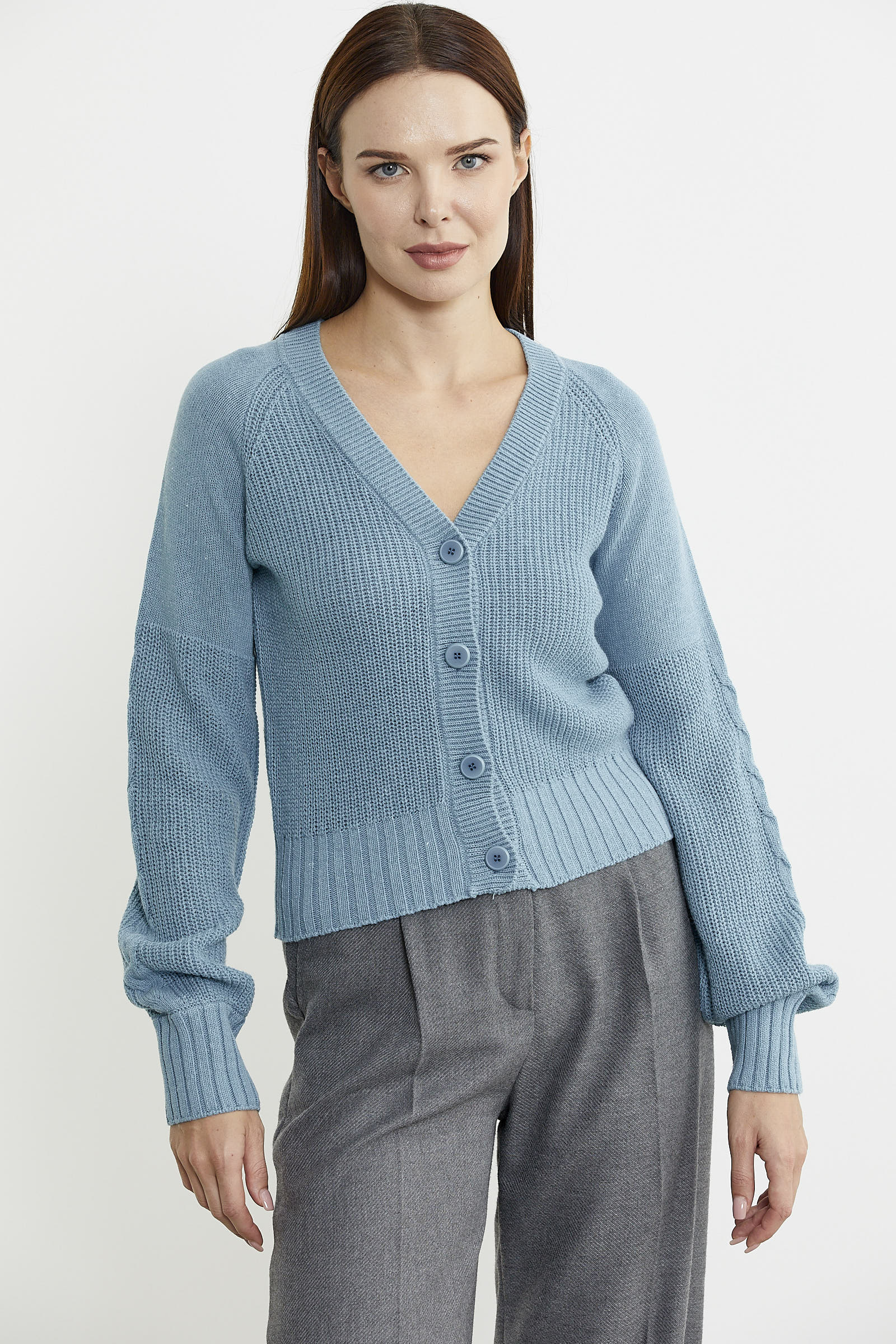 Reglan kol, motif detaylı triko hırka düğme kapamalıdır. Rahat kalıp, kısa model olarak tasarlanmıştır.
