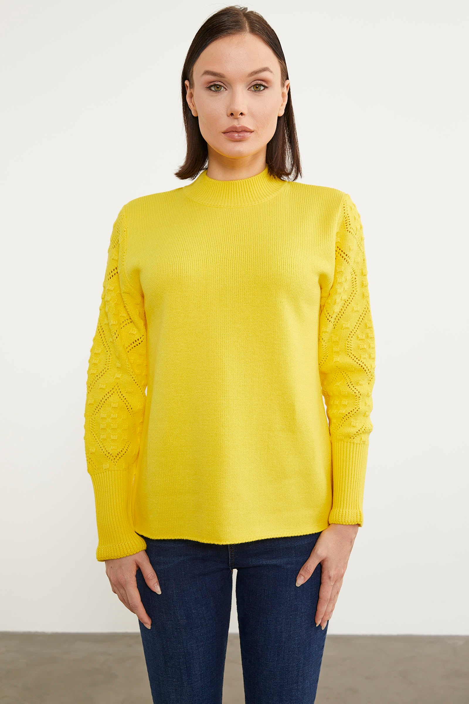 Kolları Motifli Yarım Balıkçı Triko Kazak - Sarı