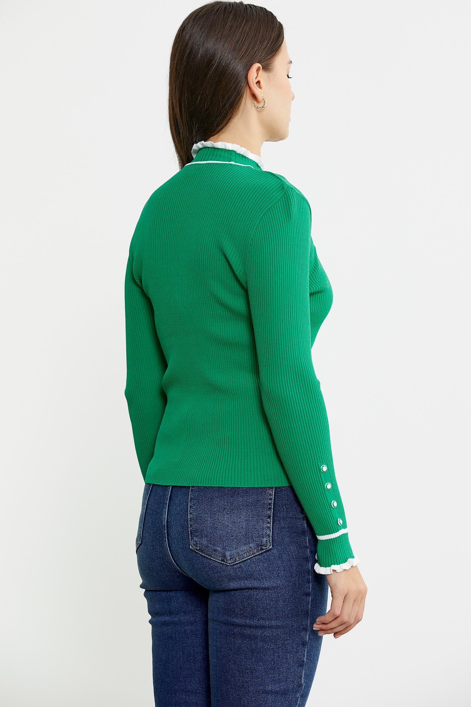 Yarım balıkçı çok yönlü tasarım çizgisi ile kurtarıcı parça görevi üstlenen triko kazak.Fitilli örülen üst, manşetlerindeki metal düğmeleriyle öne çıkıyor.