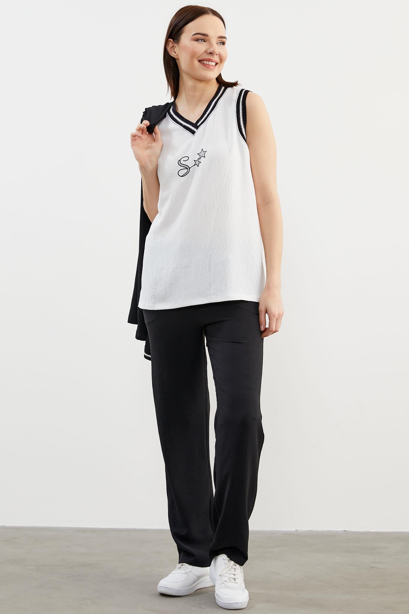 Nakış detayına sahip sıfır kol, v yaka, tişört ile beli lastikli, boru paça pantolondan oluşan takım.