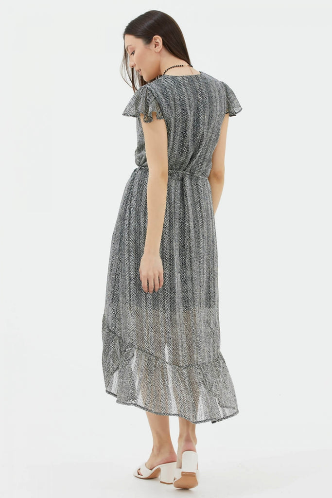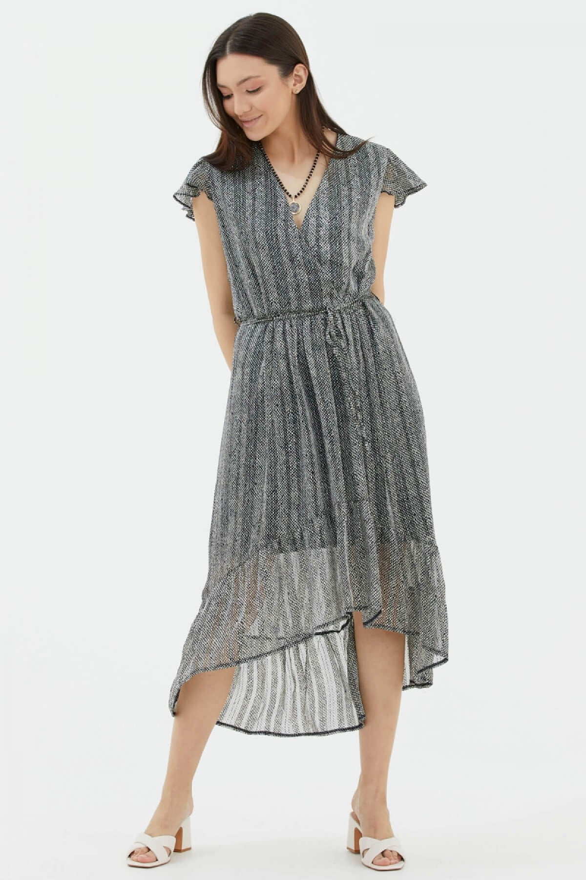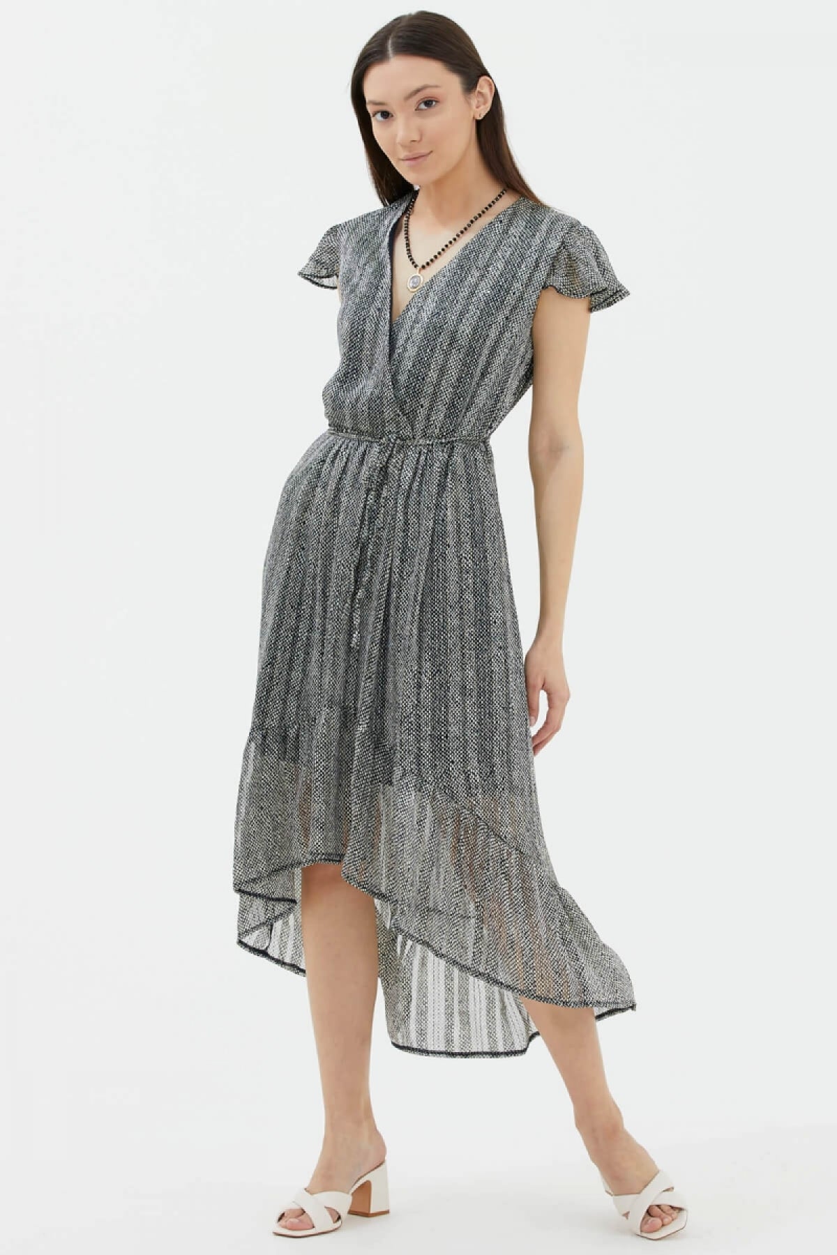 Kruvaze yaka, kap kol, belden bağlama detaylı, önü kısa arkası uzun olan desenli elbise ile zarif ve şık bir görünüm yakalayın.