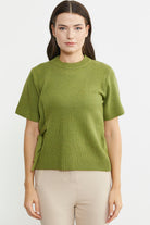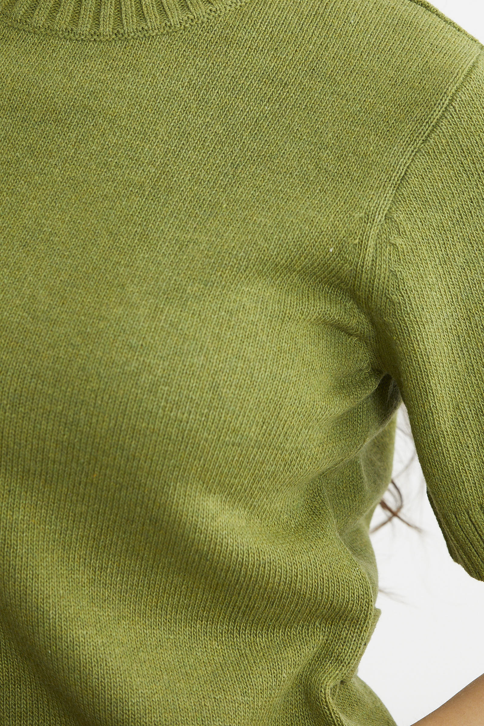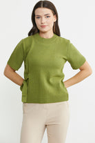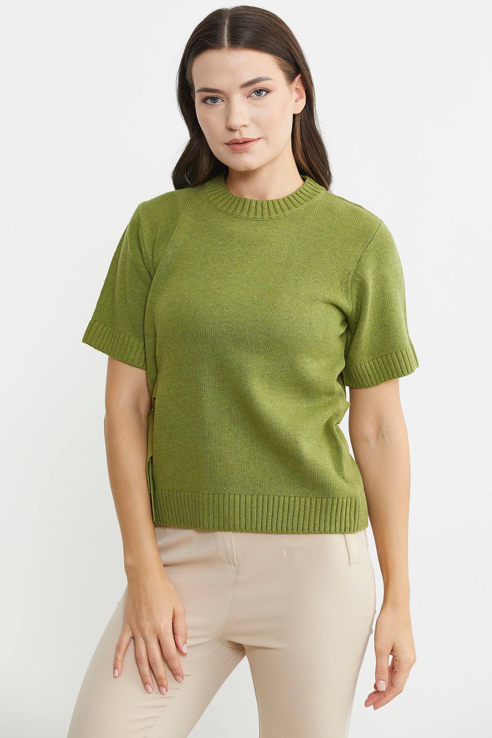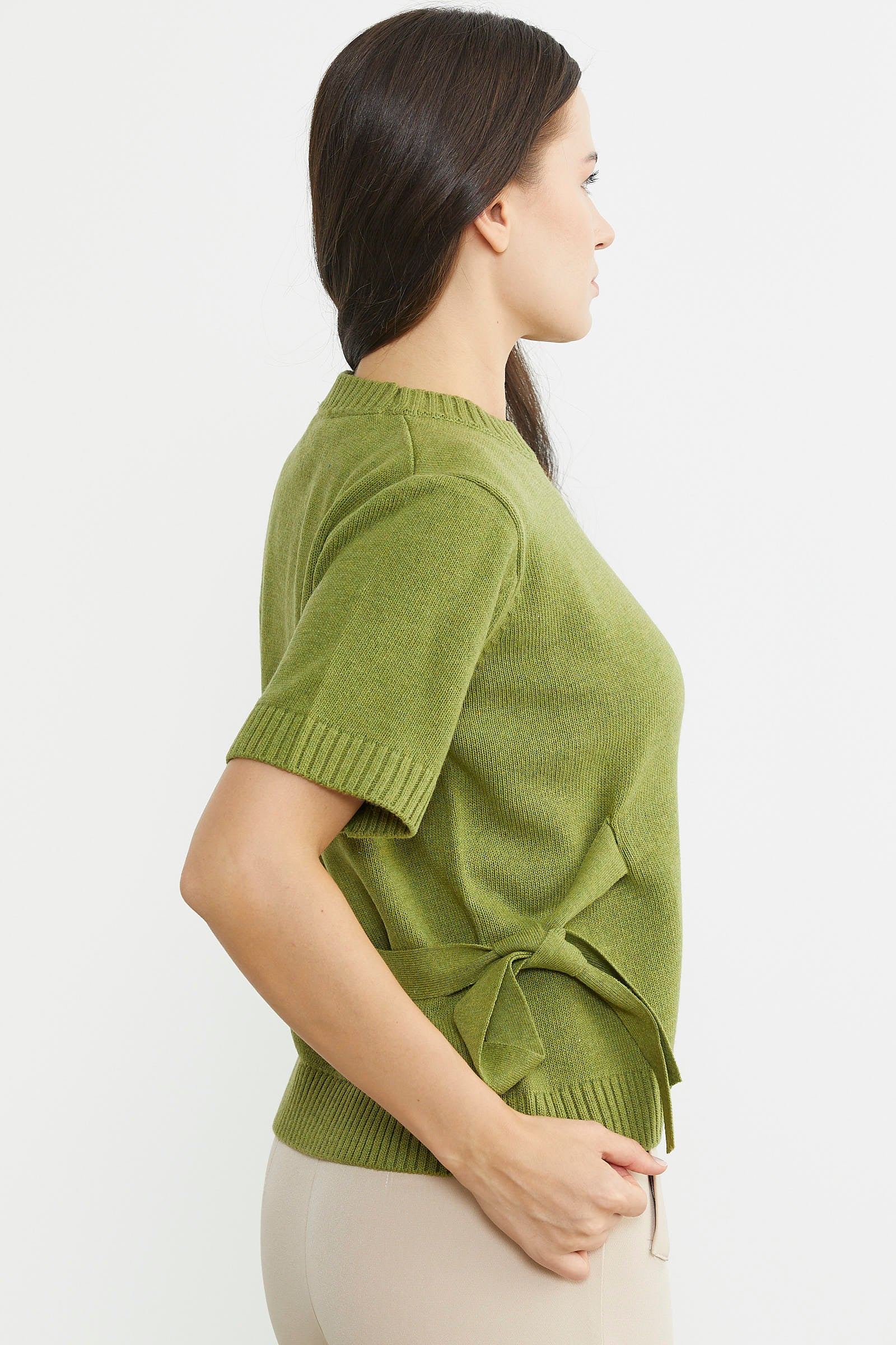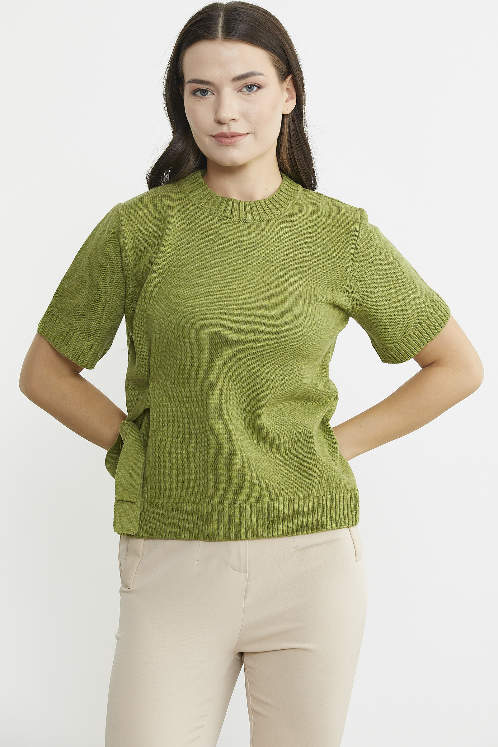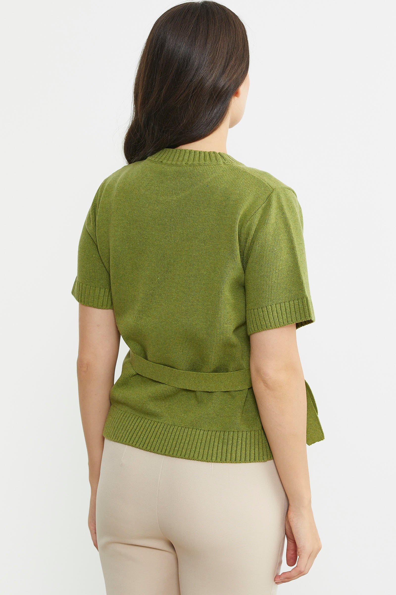 Kuşaklı Kısa Kol Yünlü Triko Kazak - Yeşil