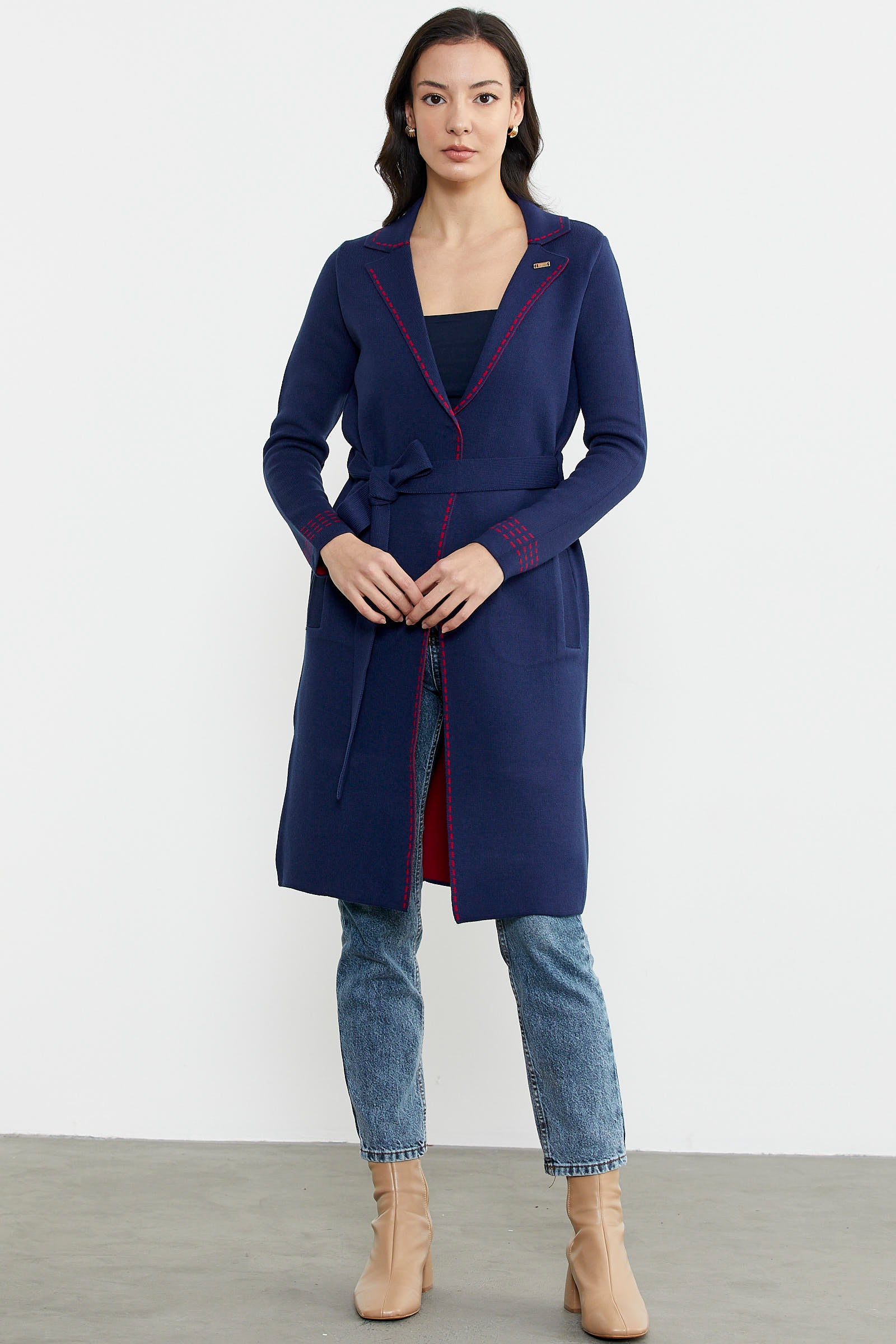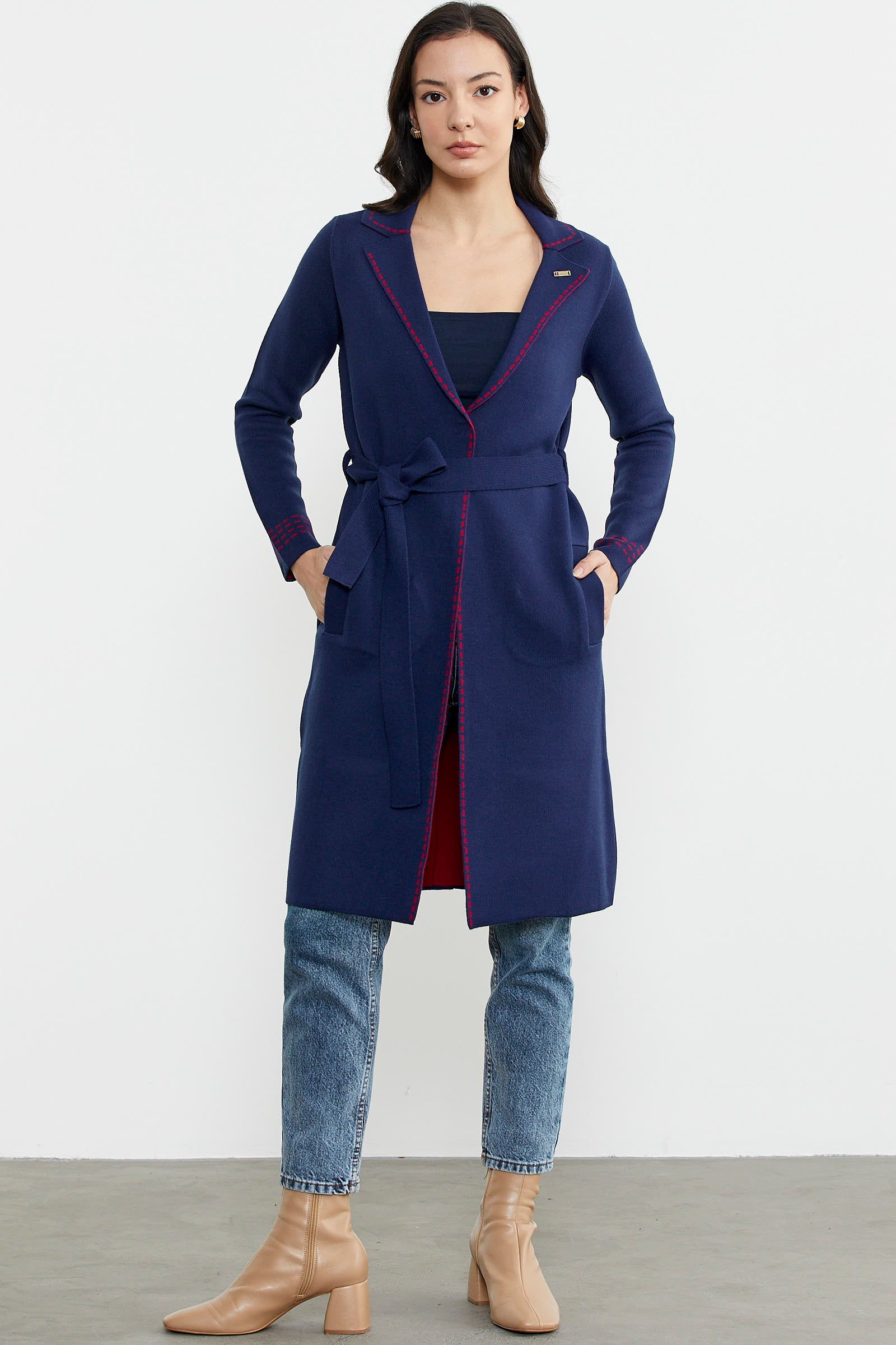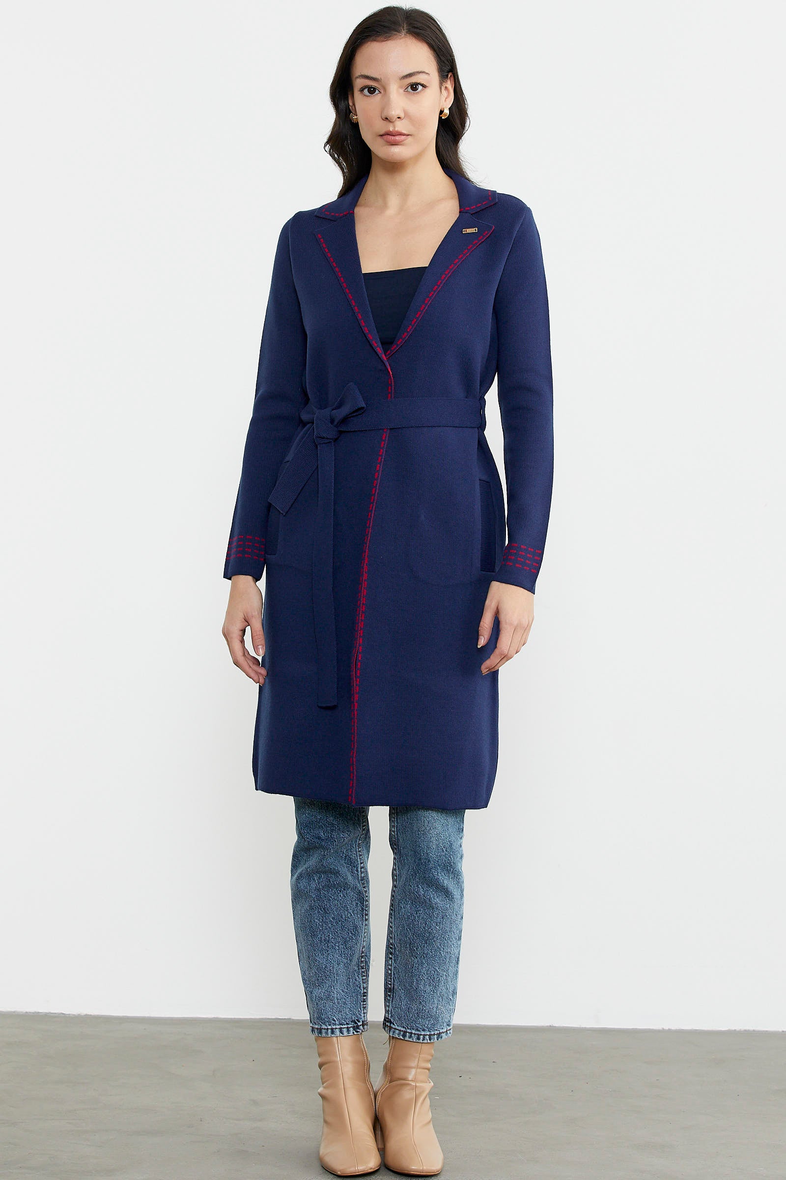 Kuşaklı Uzun Triko Hırka - Lacivert - Kırmızı