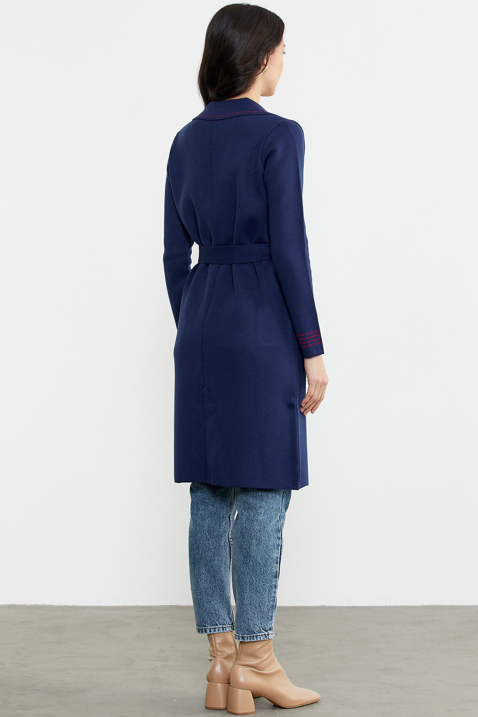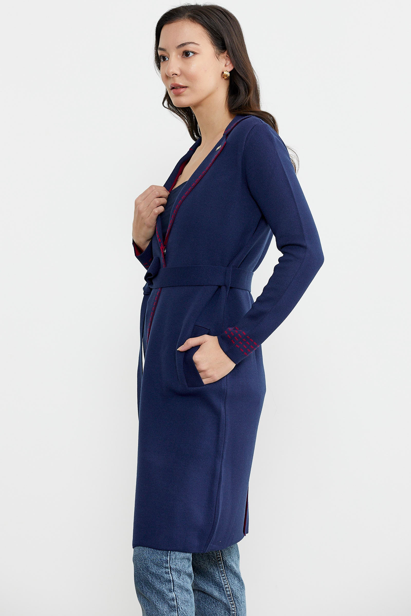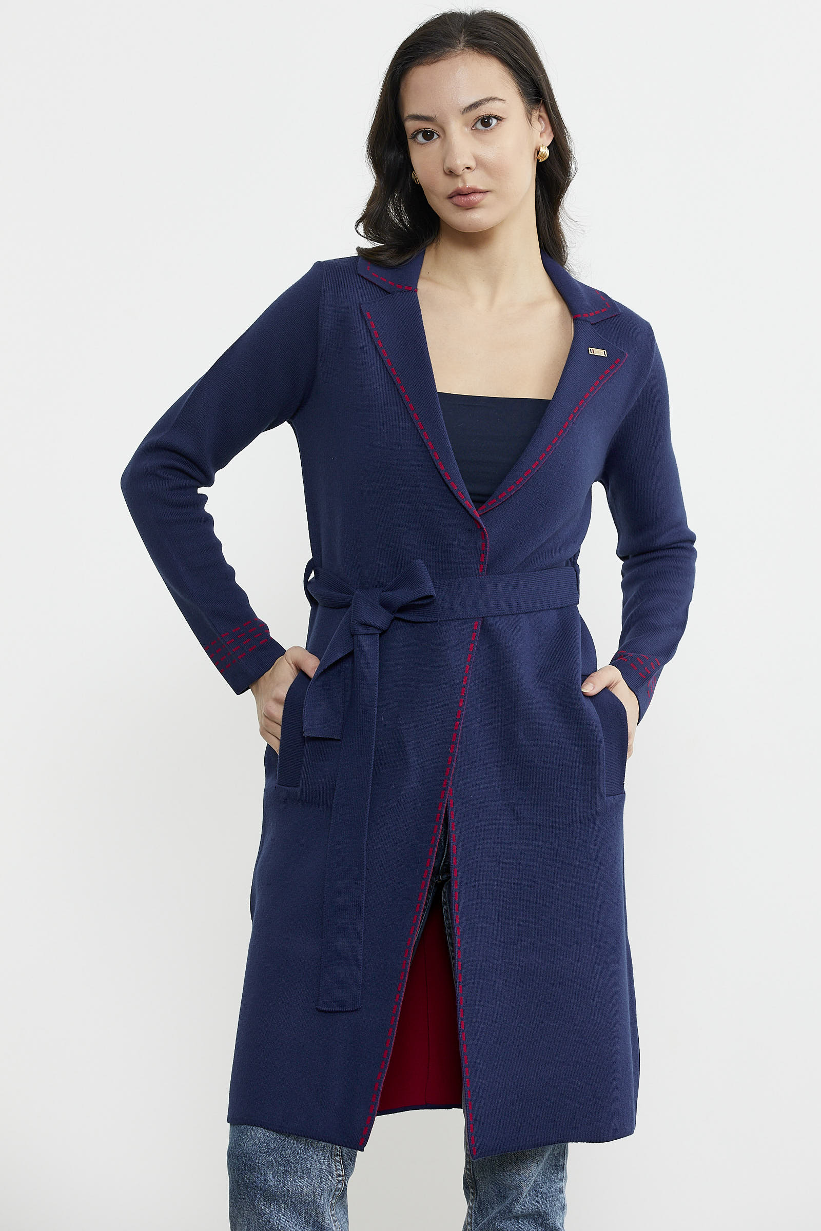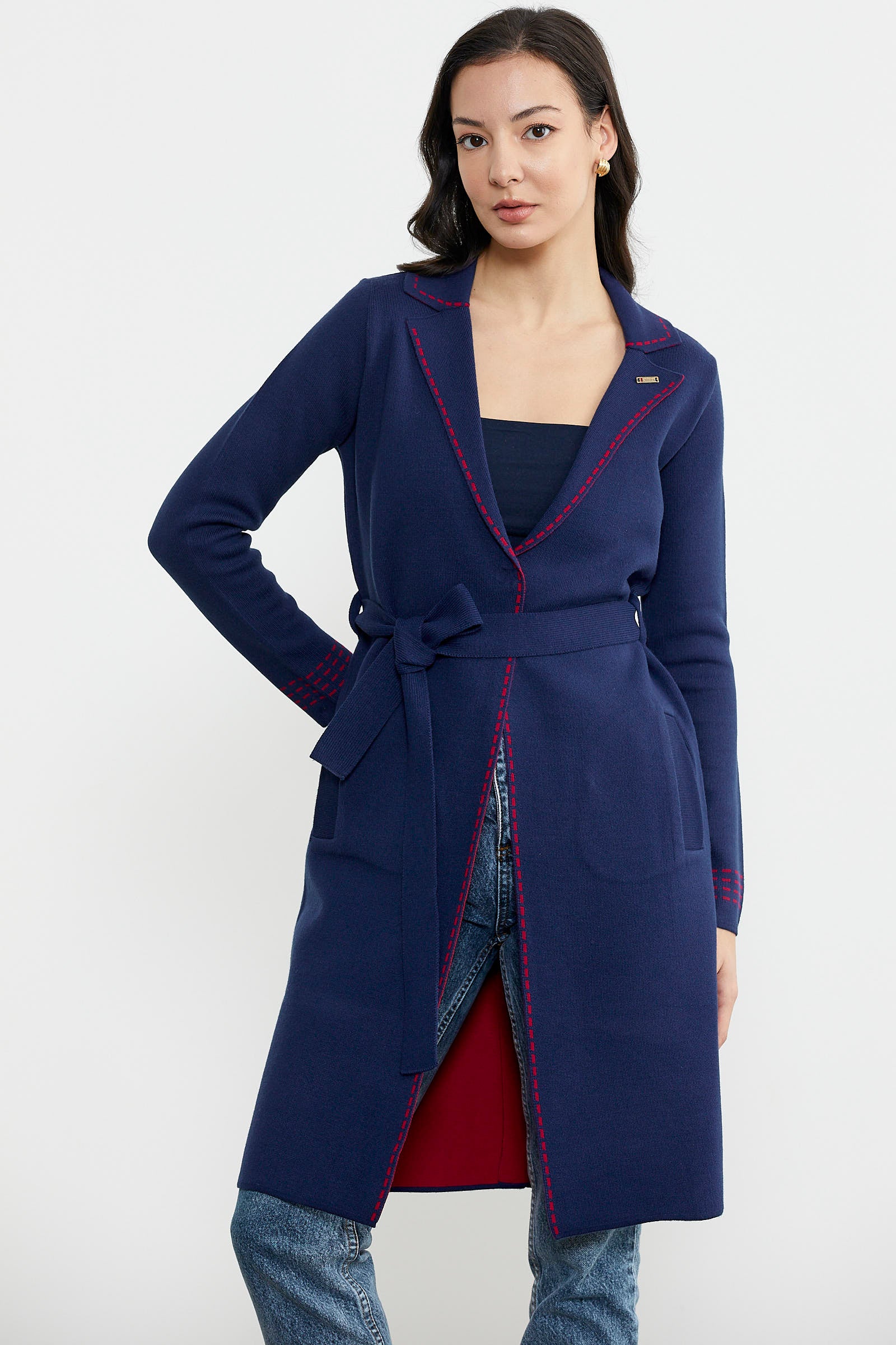 Kuşaklı Uzun Triko Hırka - Lacivert - Kırmızı