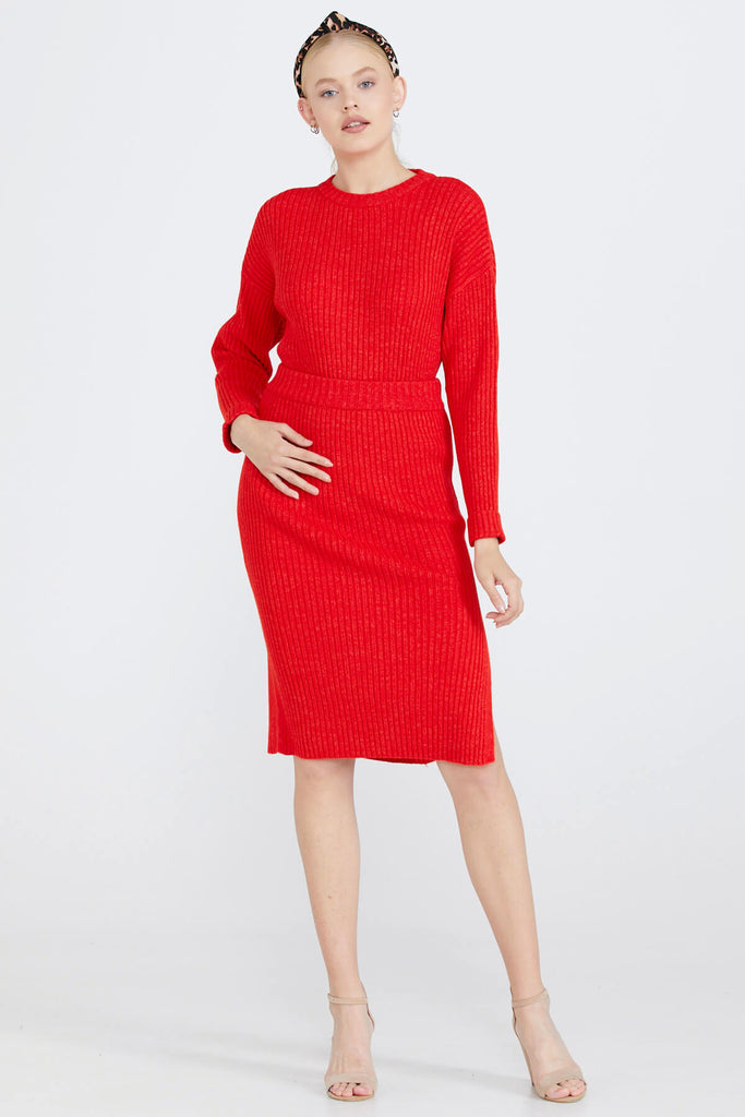 Lastik Örgülü Kadın Triko Etek - Kırmızı