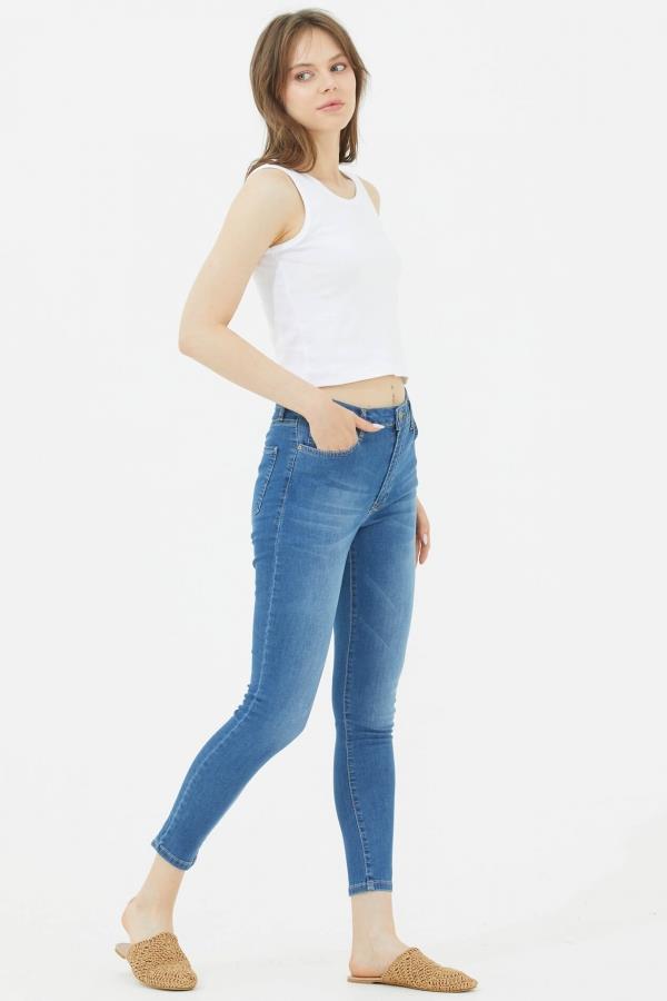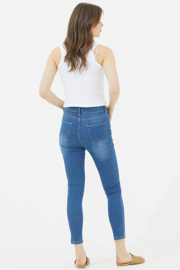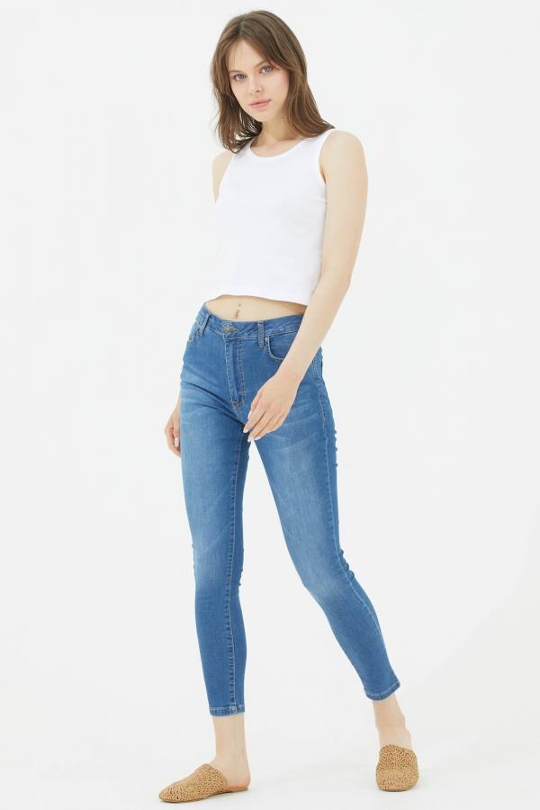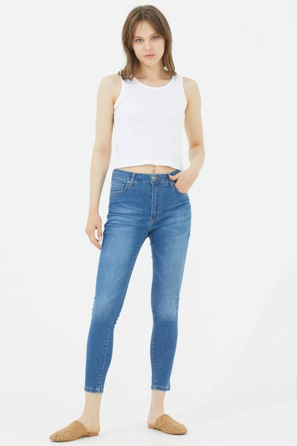 Günlük kullanıma uyum sağlayan, pamuk karışımlı kumaştan üretilmiş, yüksek bel, fermuar patlı ve düğmeli, dar paçalı jean.