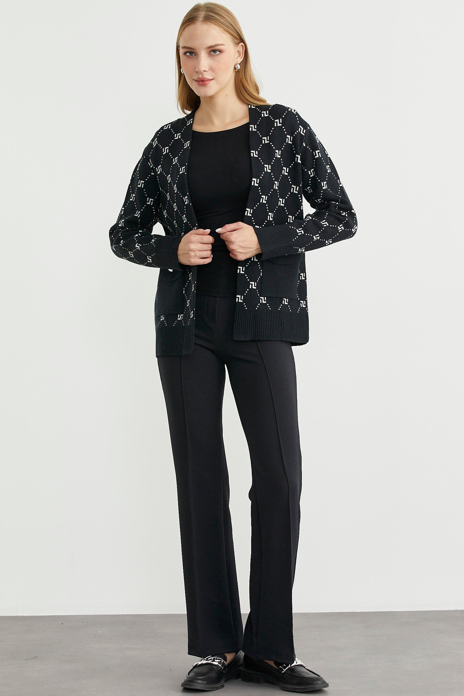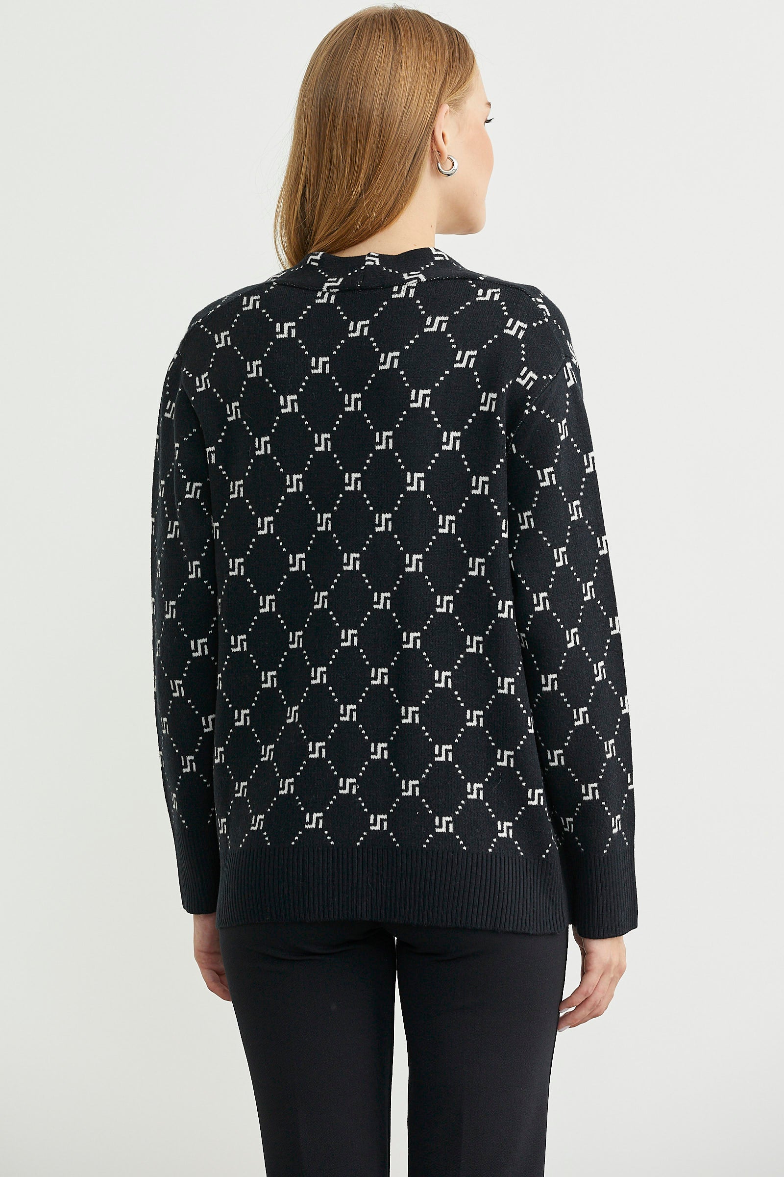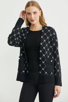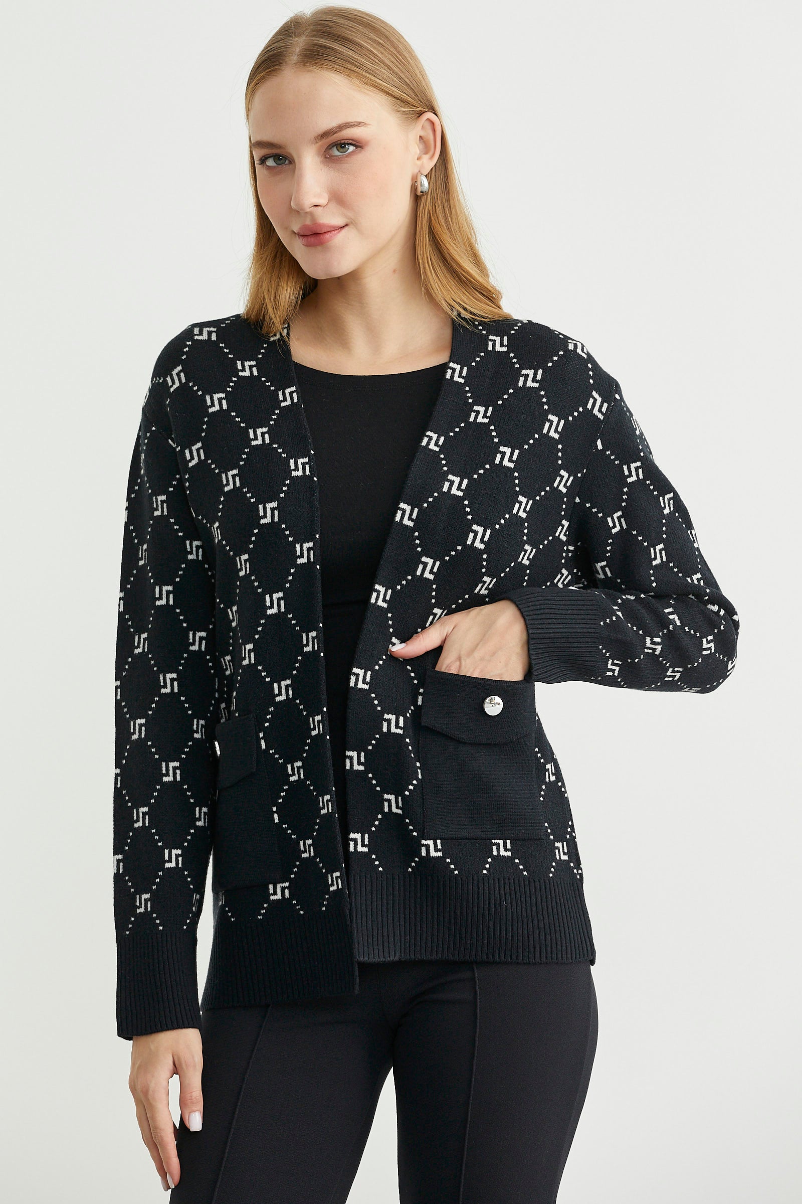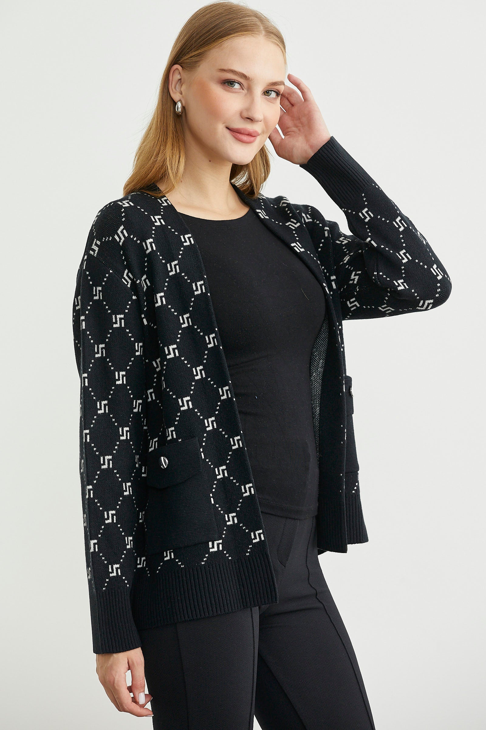 Logolu Cep Detaylı Oversize Triko Hırka - Siyah