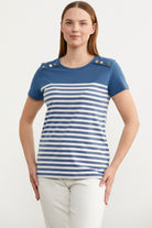 Metal düğme detaylı çizgili tişört düz parça kullanılan omuz geçişiyle spor bir şıklık sunar.