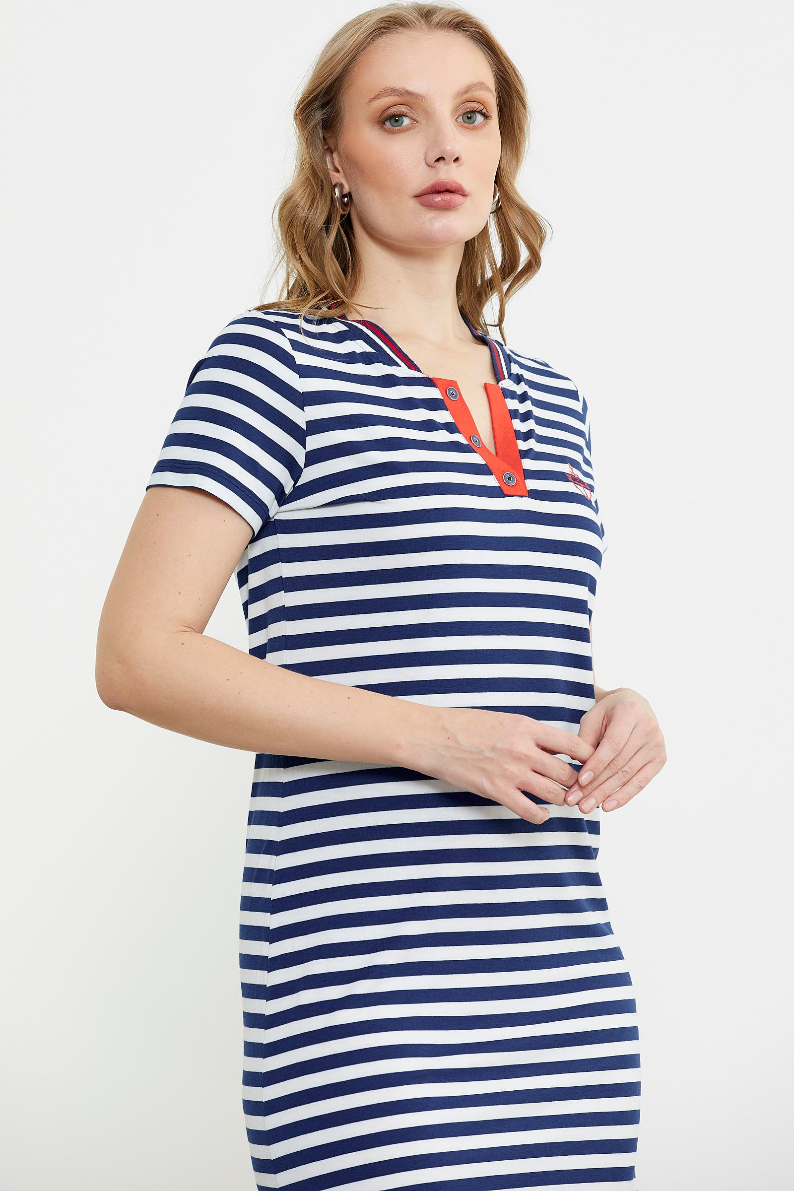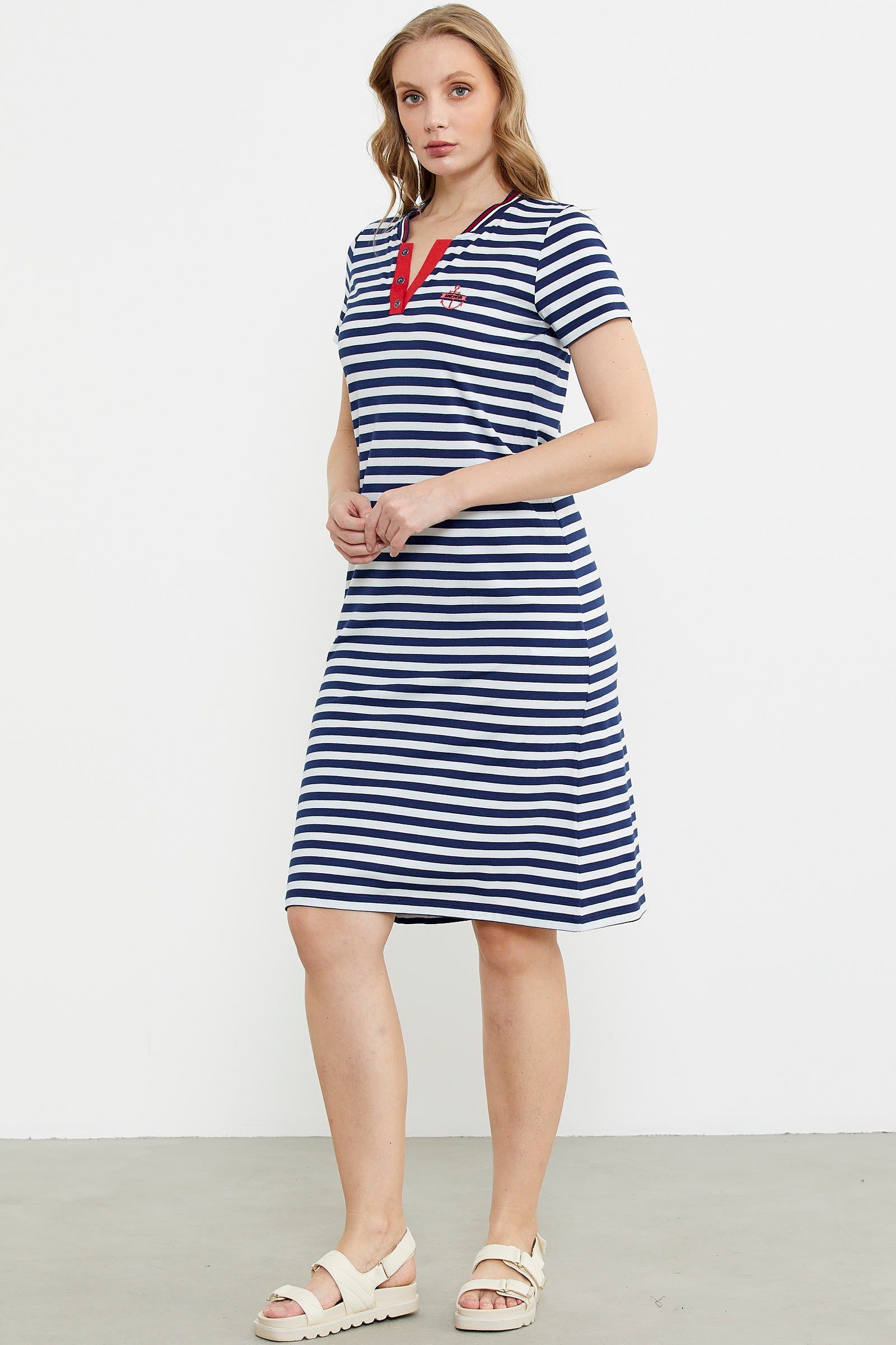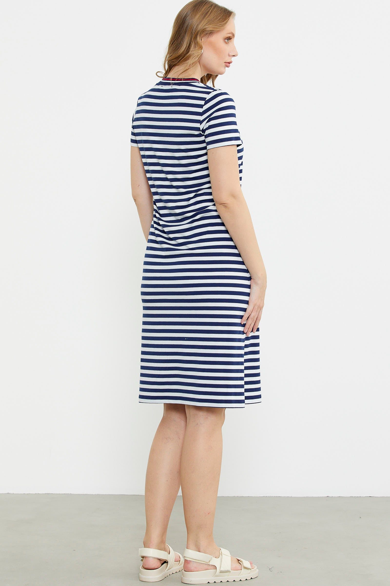 Marine, çizgili, diz boy, basic elbise. Belden hafif kloş inen elbise kısa kol ve rahat kalıptır.