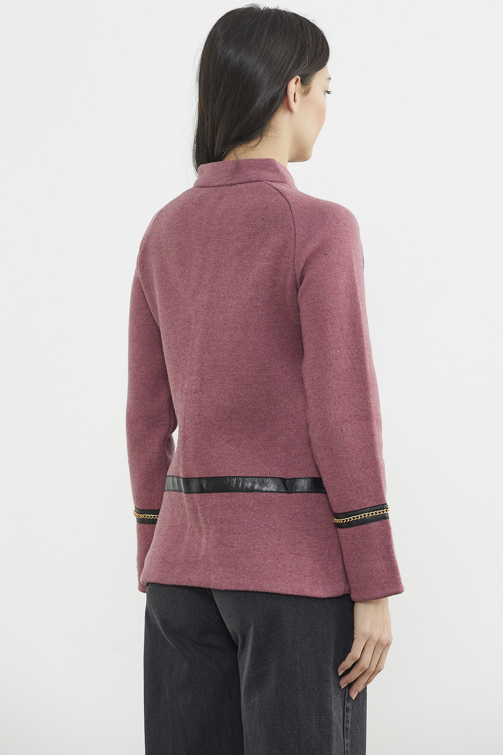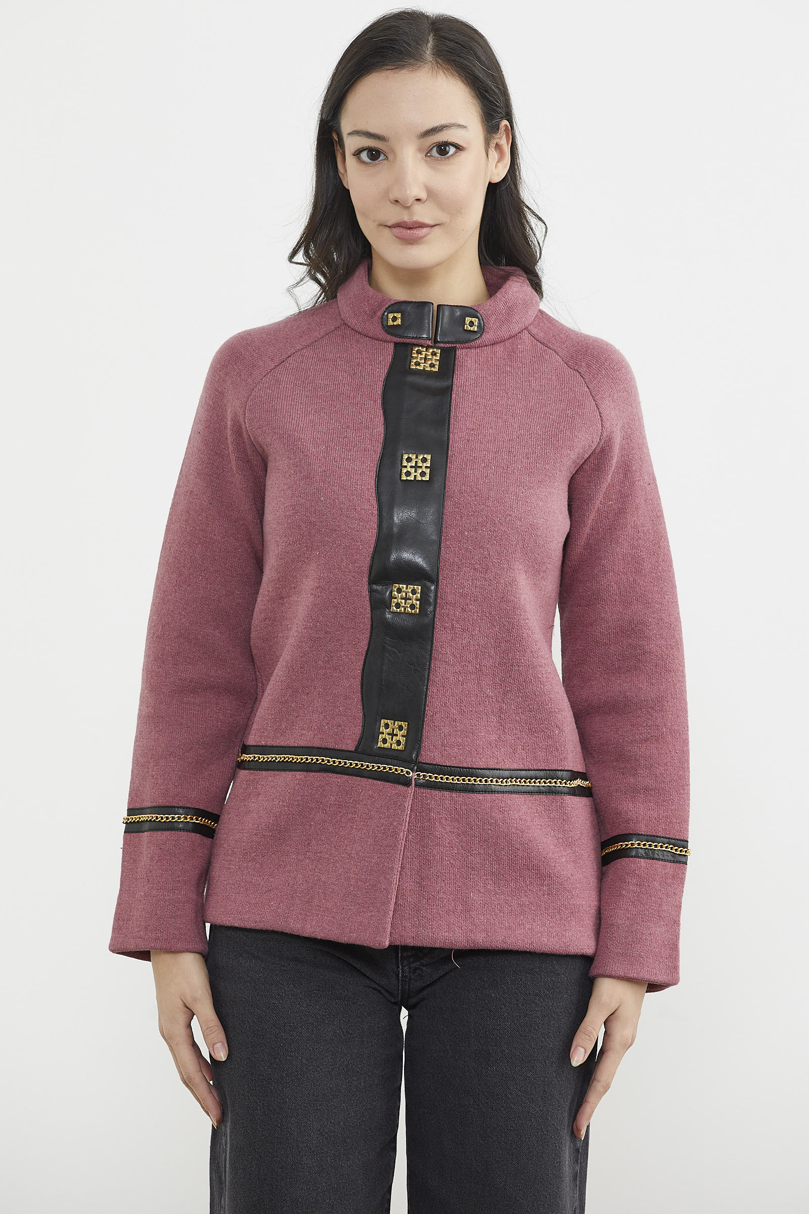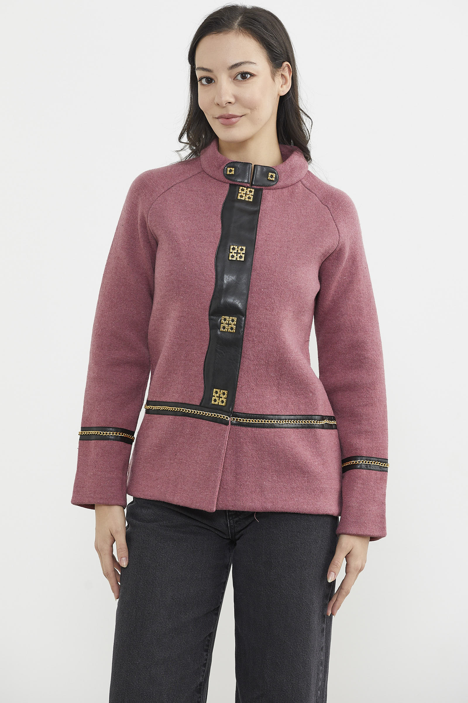 Metal aksesuarlarıyla dikkat çeken biye ve zincir detaylı dik yaka uzun kollu kısa triko ceket ile orijinal kombinler yaratırken stilinize farklı bir hava katabilirsiniz. Yün içerikli dokusu ile esnek ve sıcak bir hissiyata sahip olabilirsiniz.