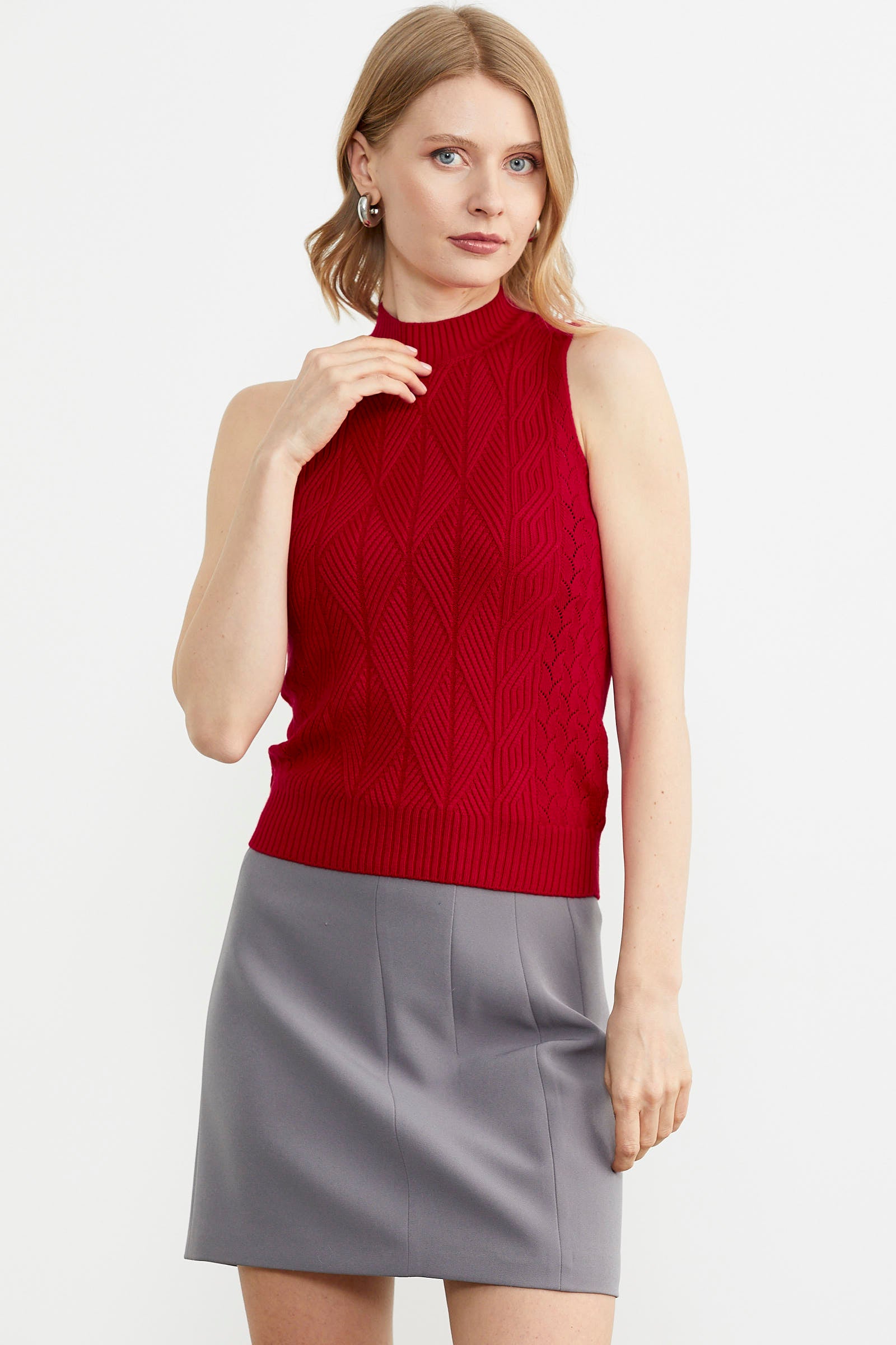 Motifli Dik Yaka Triko Süveter - Kırmızı