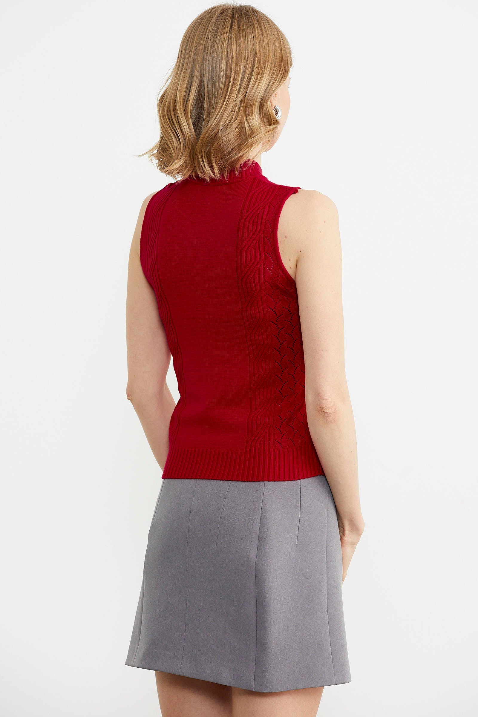 Dik yaka tasarımıyla çağdaş bir görünüm kazandıran sıfır kollu zarif motifli parça ile süveter rahatlığını yakalarken günlük kombinlerinizde feminen görünüm elde edeceksiniz.
