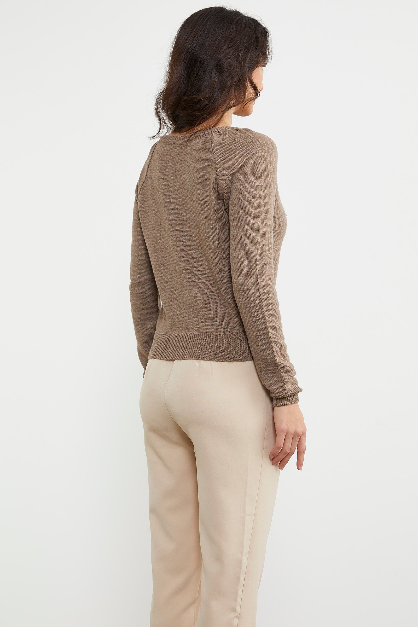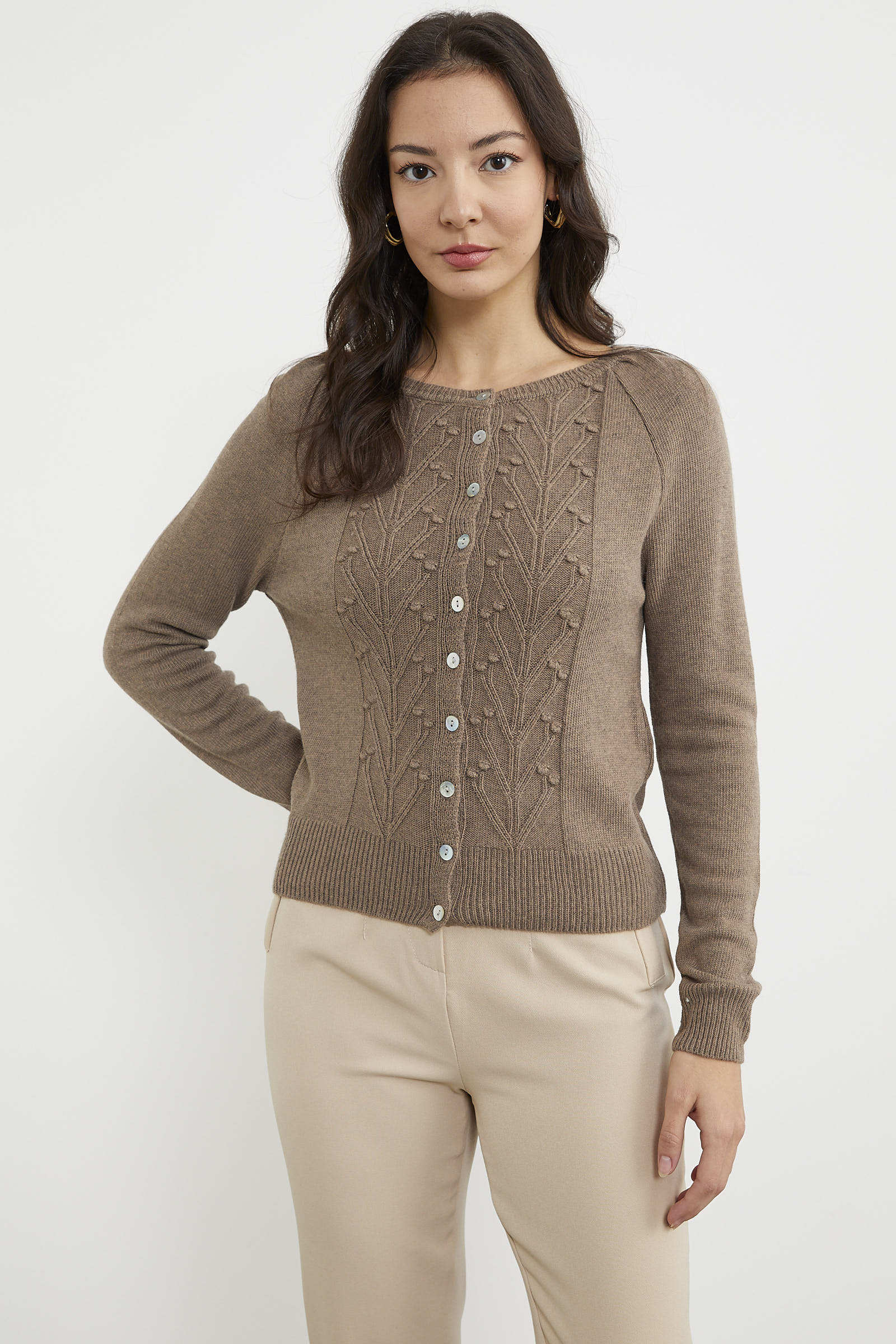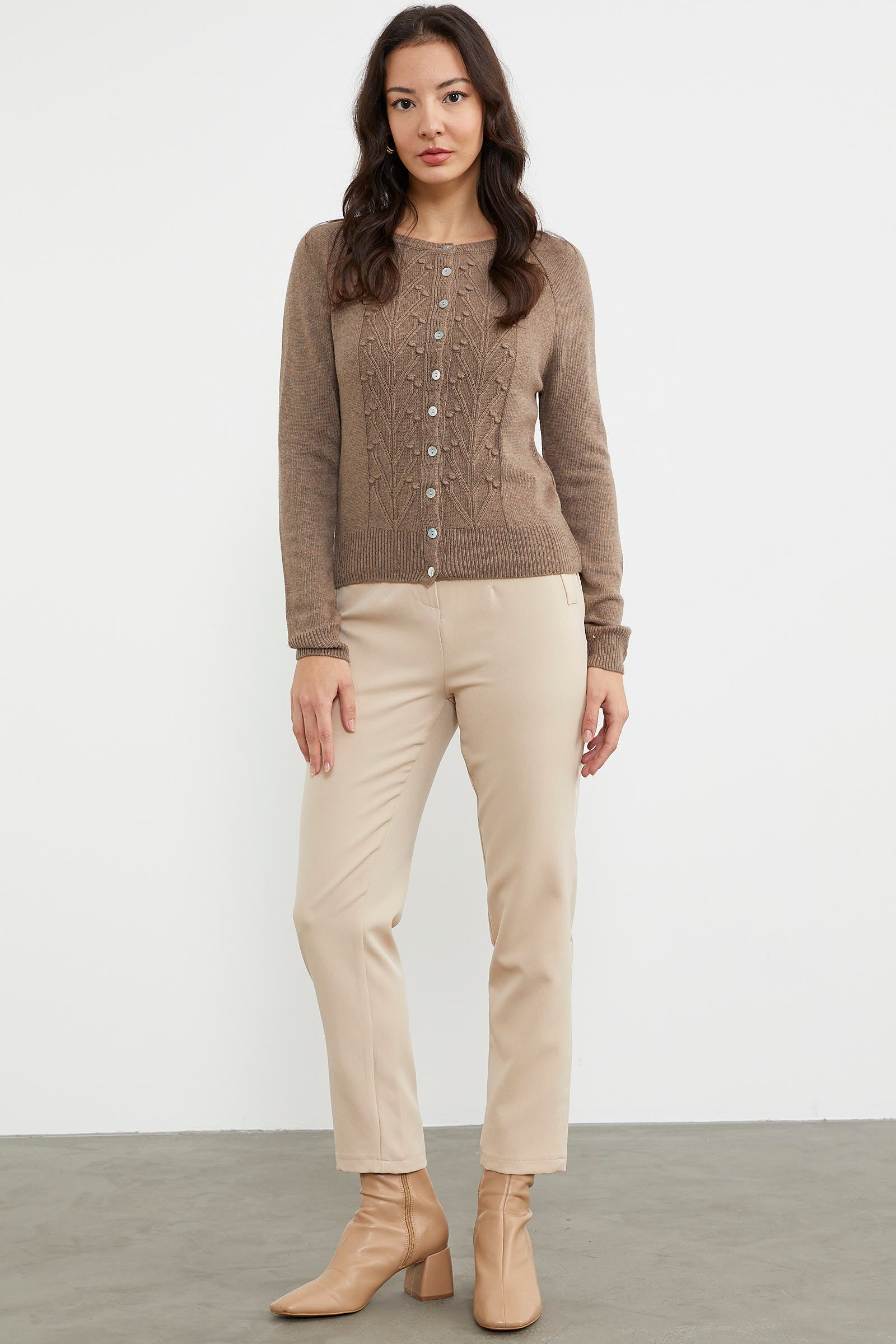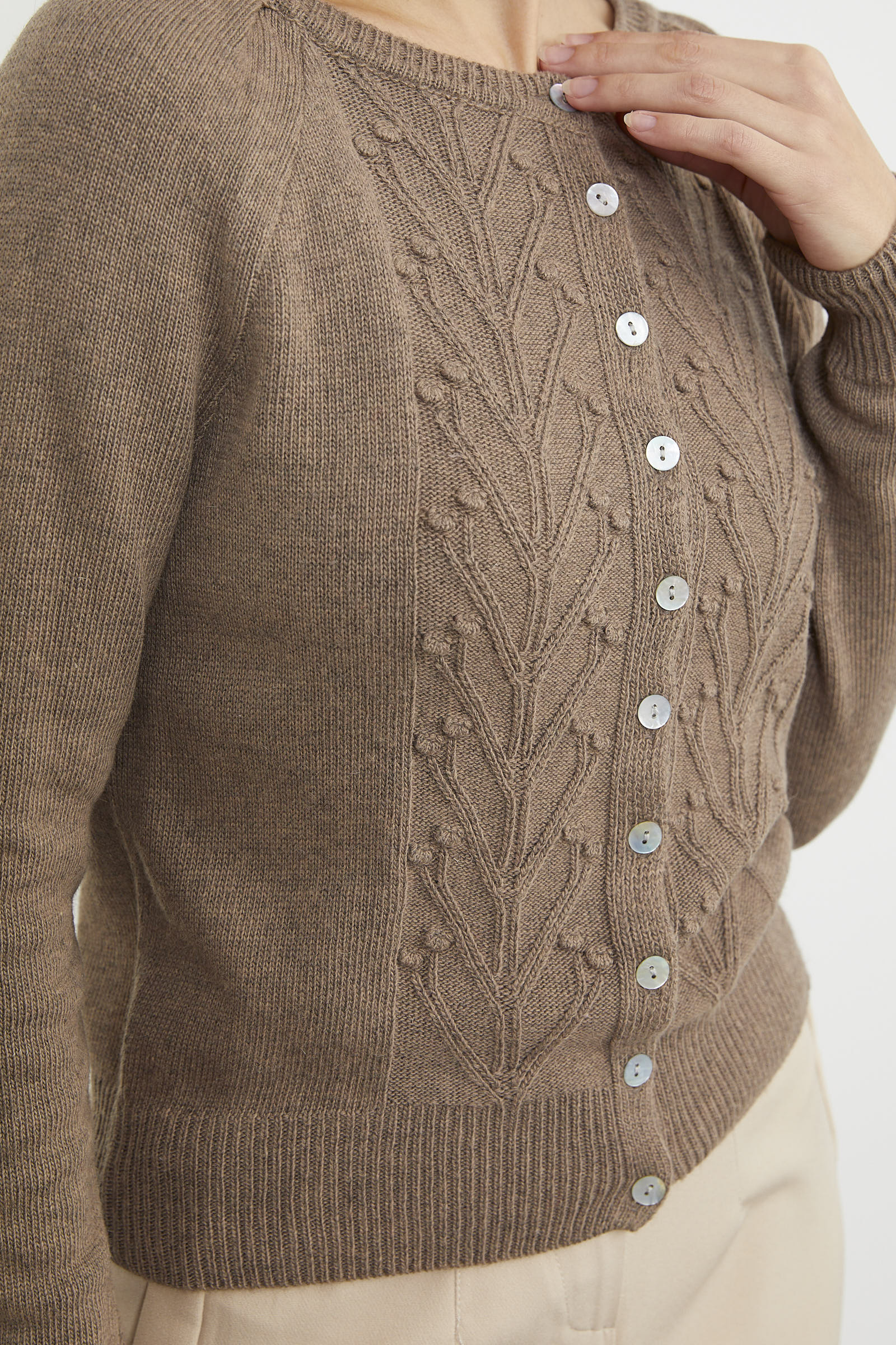 Motifli Düğmeli Kısa Triko Hırka - Vizon