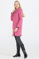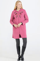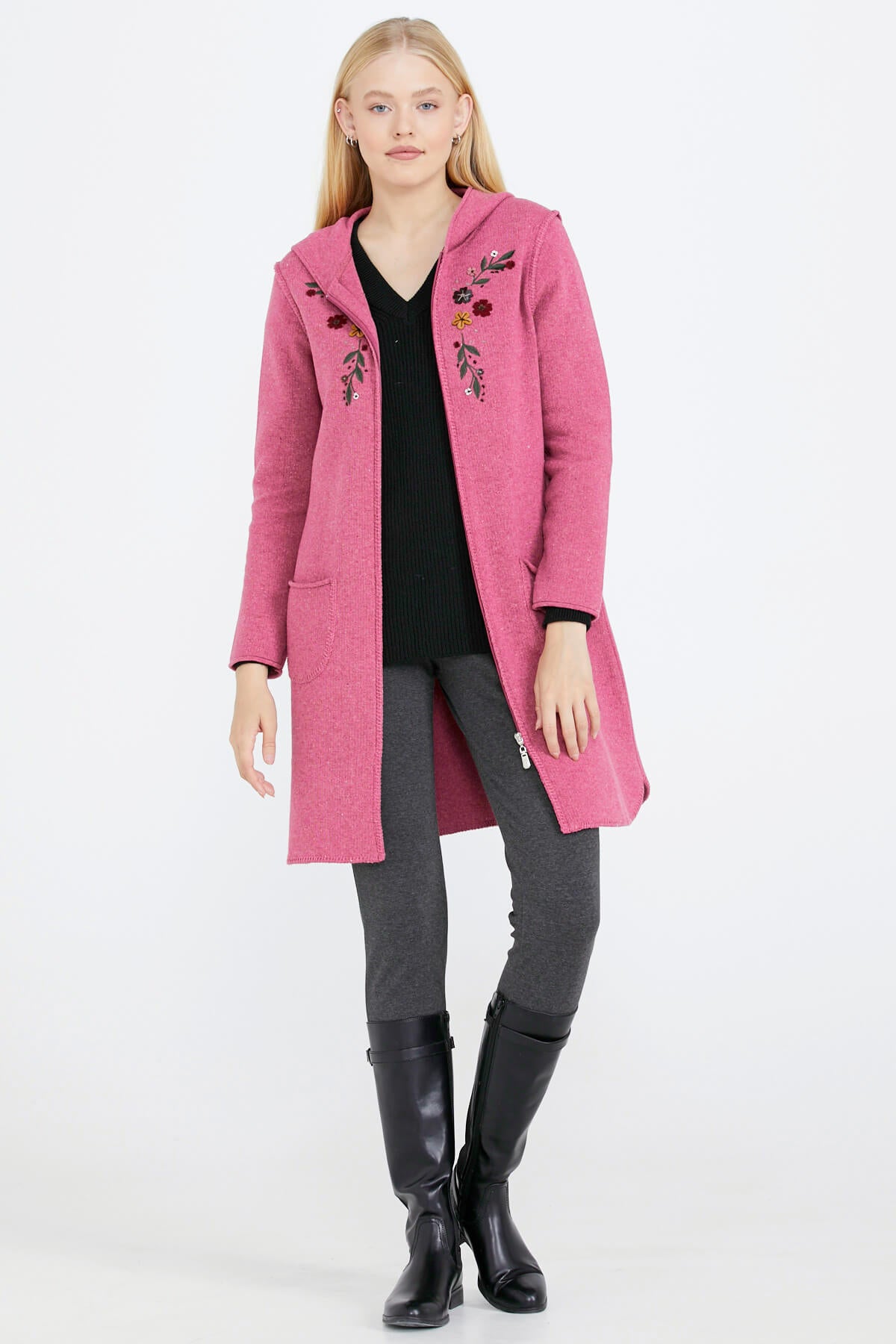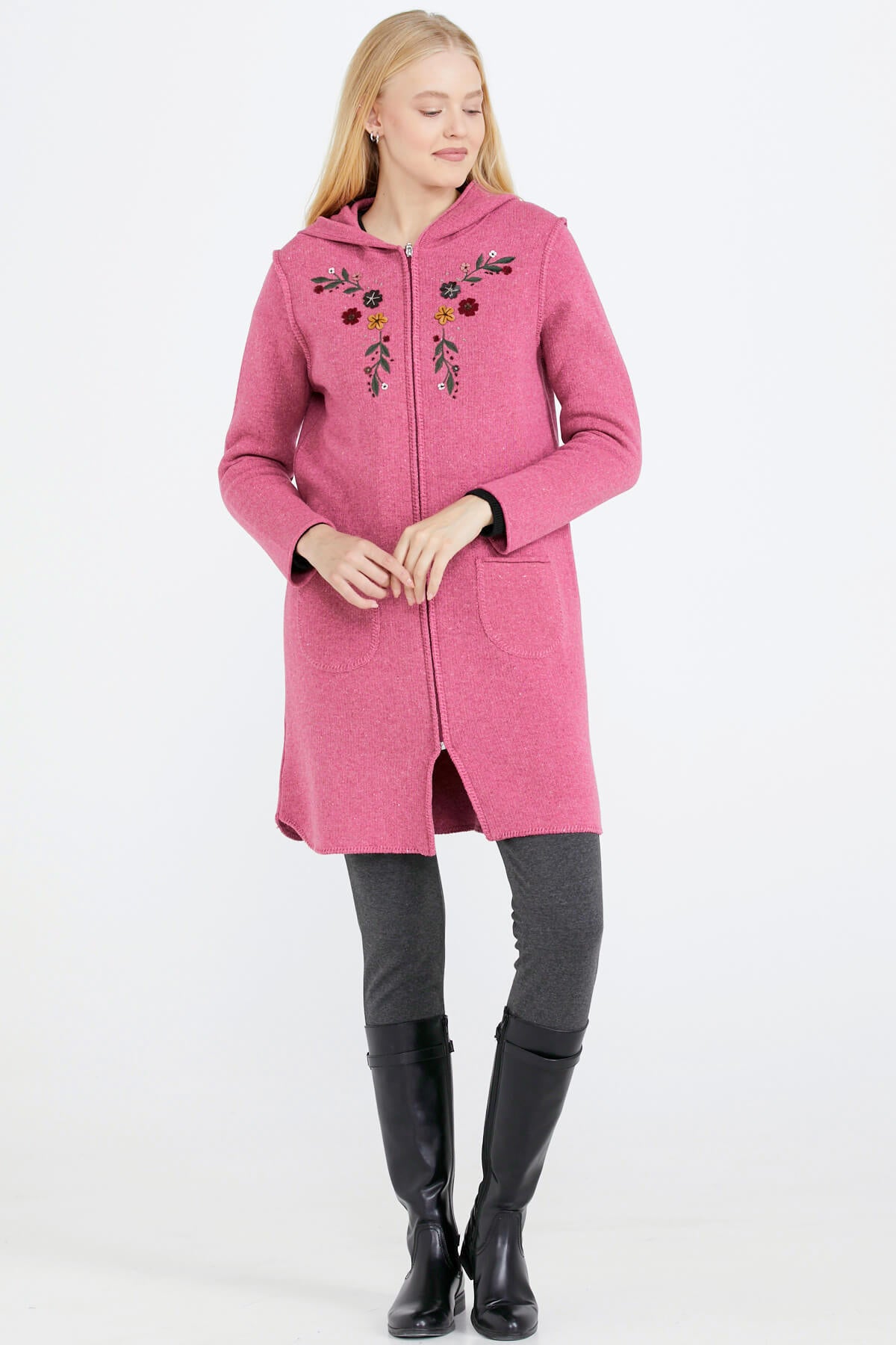 Nakış Desenli Kapüşonlu Kadın Triko Ceket - Gül