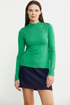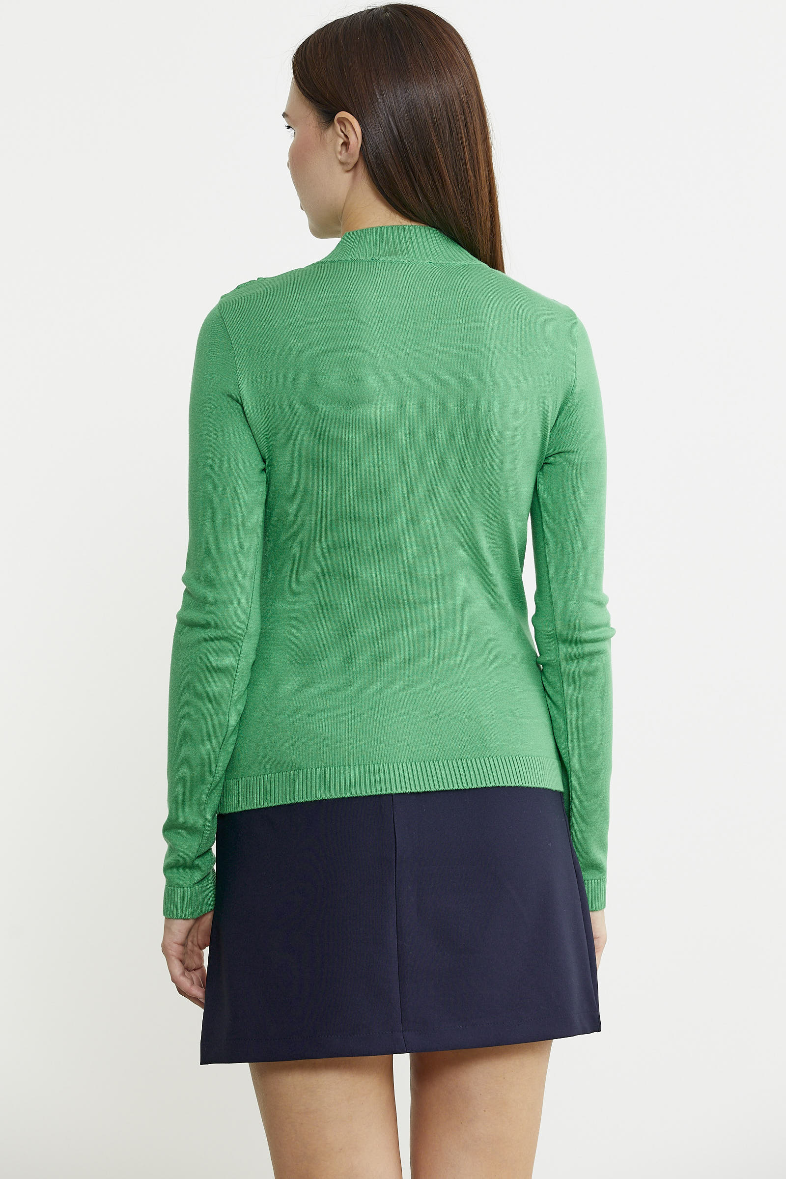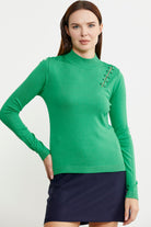 Basic, dik yakalı, uzun kollu, omuz aksesuar detaylı, yumuşak ince triko kazak.