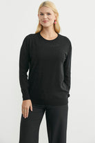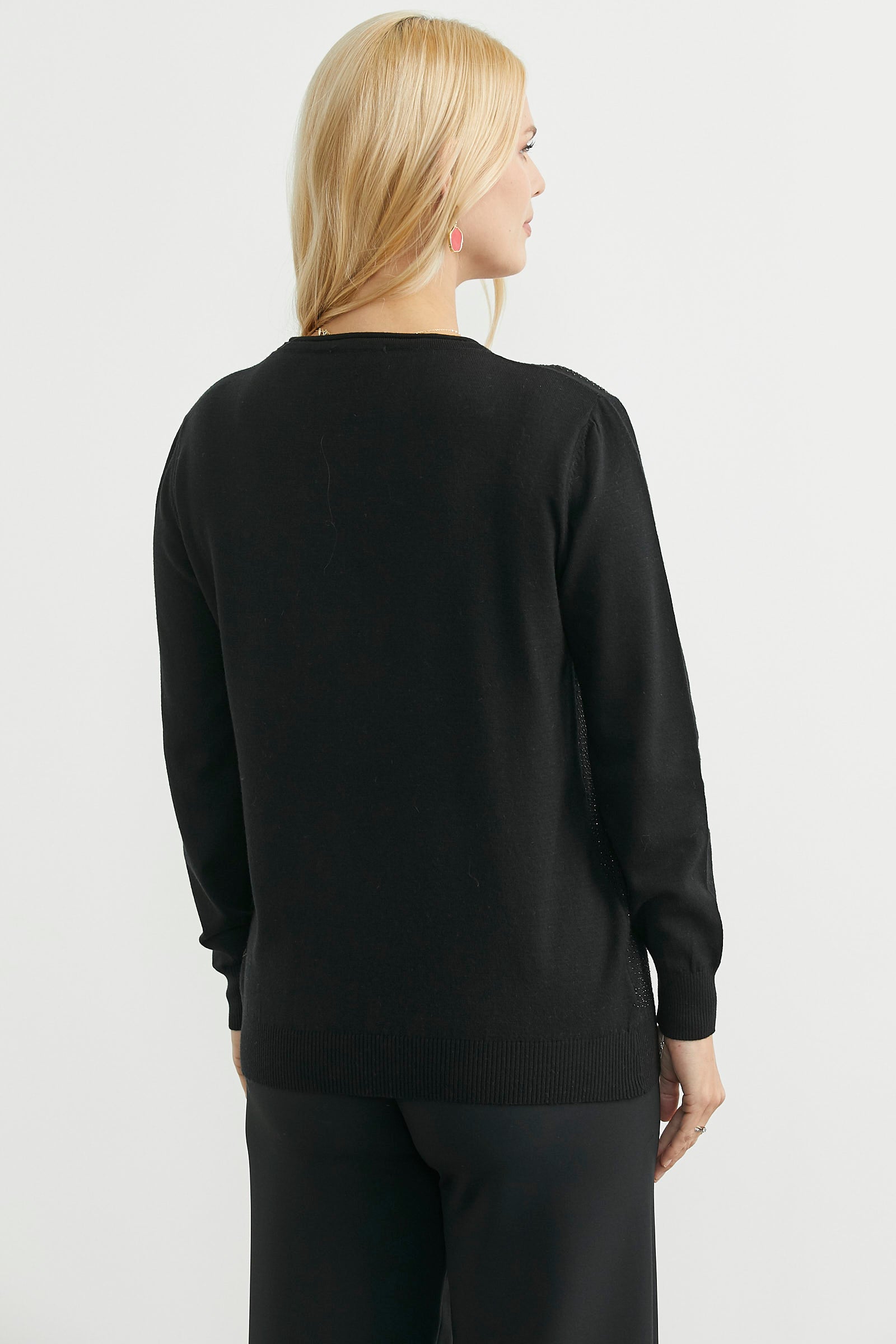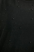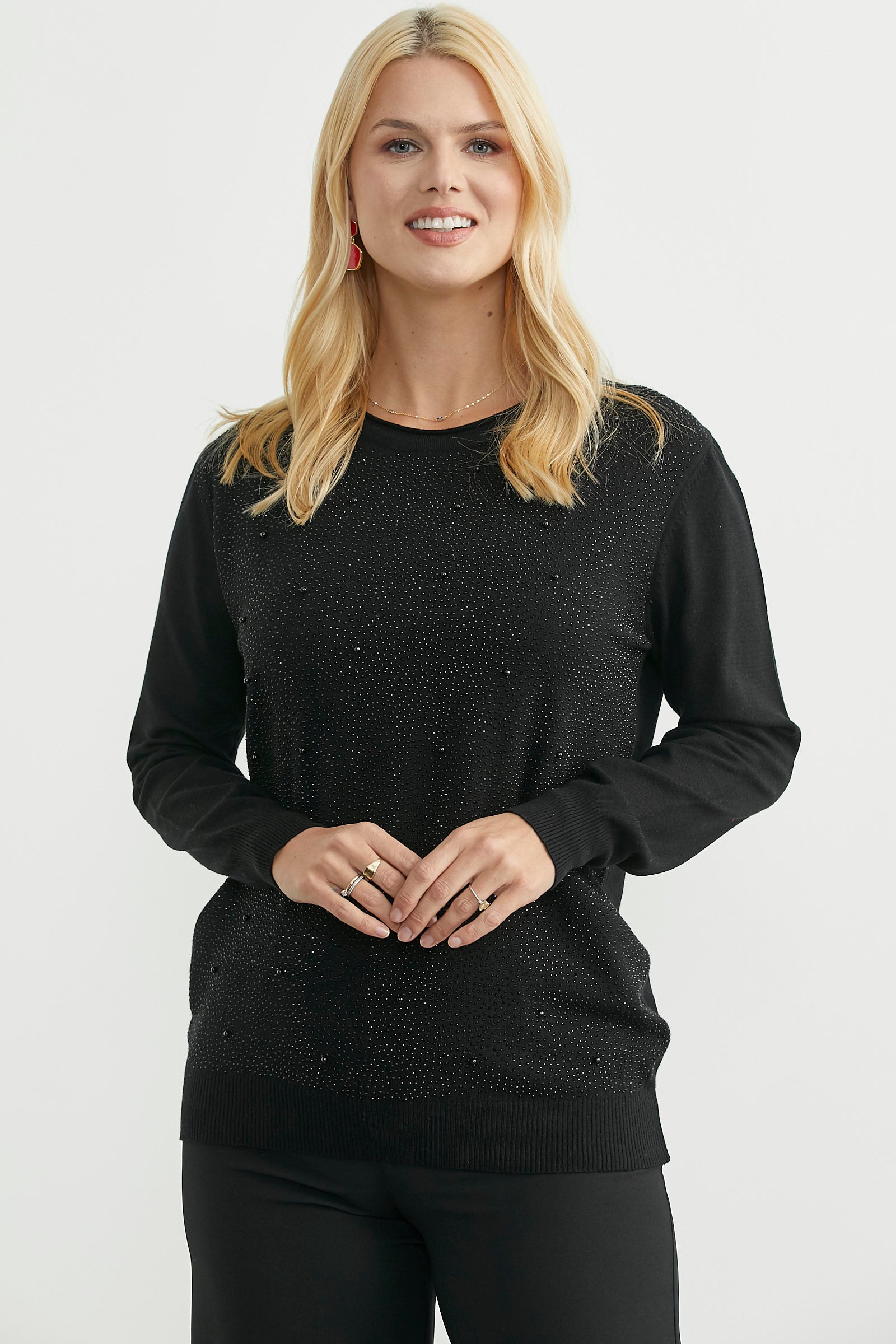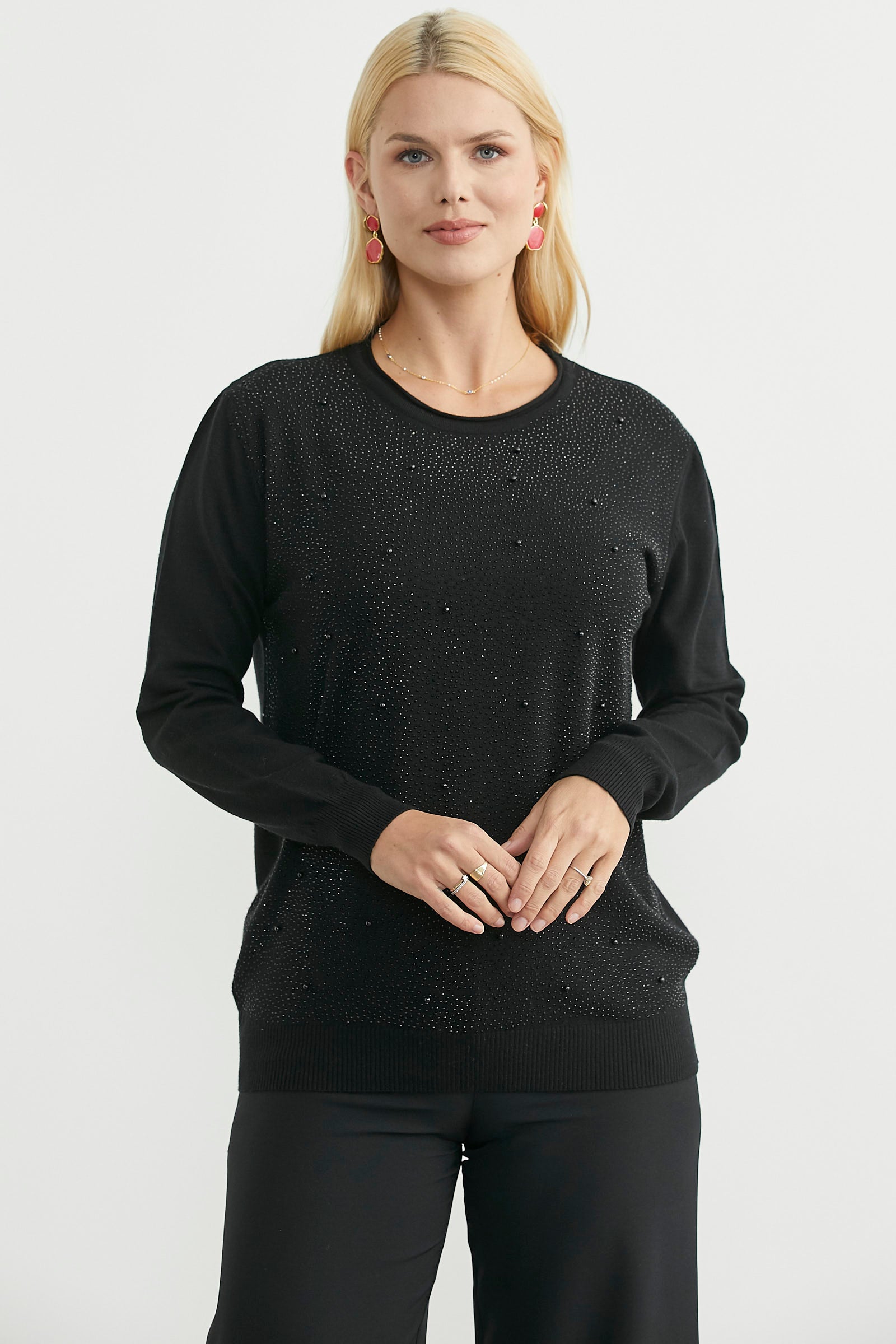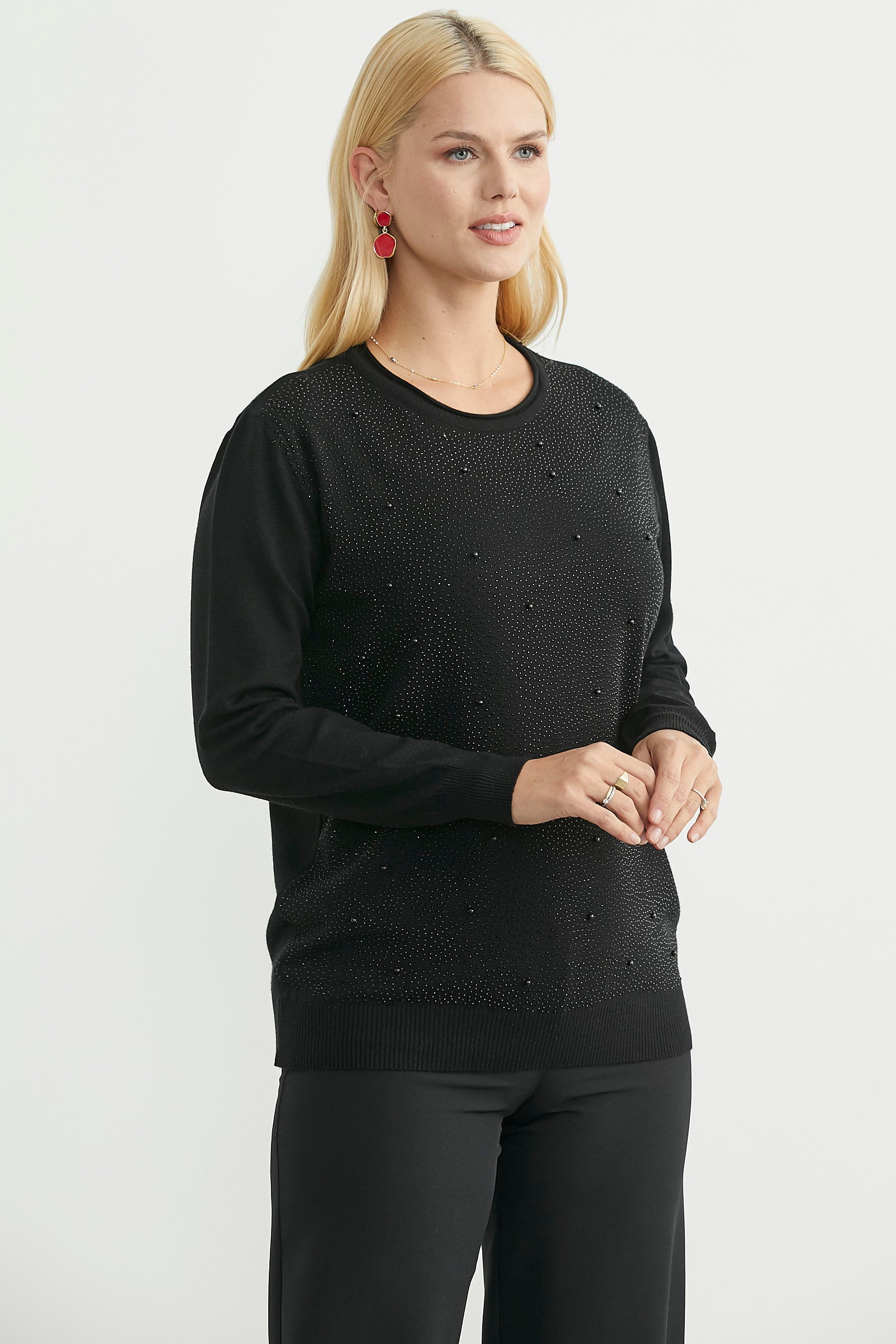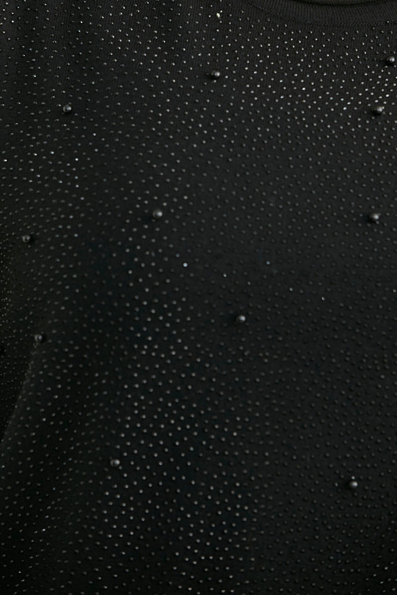 Ön bedeni tamamen taş detaylı, yumuşak dokulu, uzun kol triko kazak standart kalıptır.