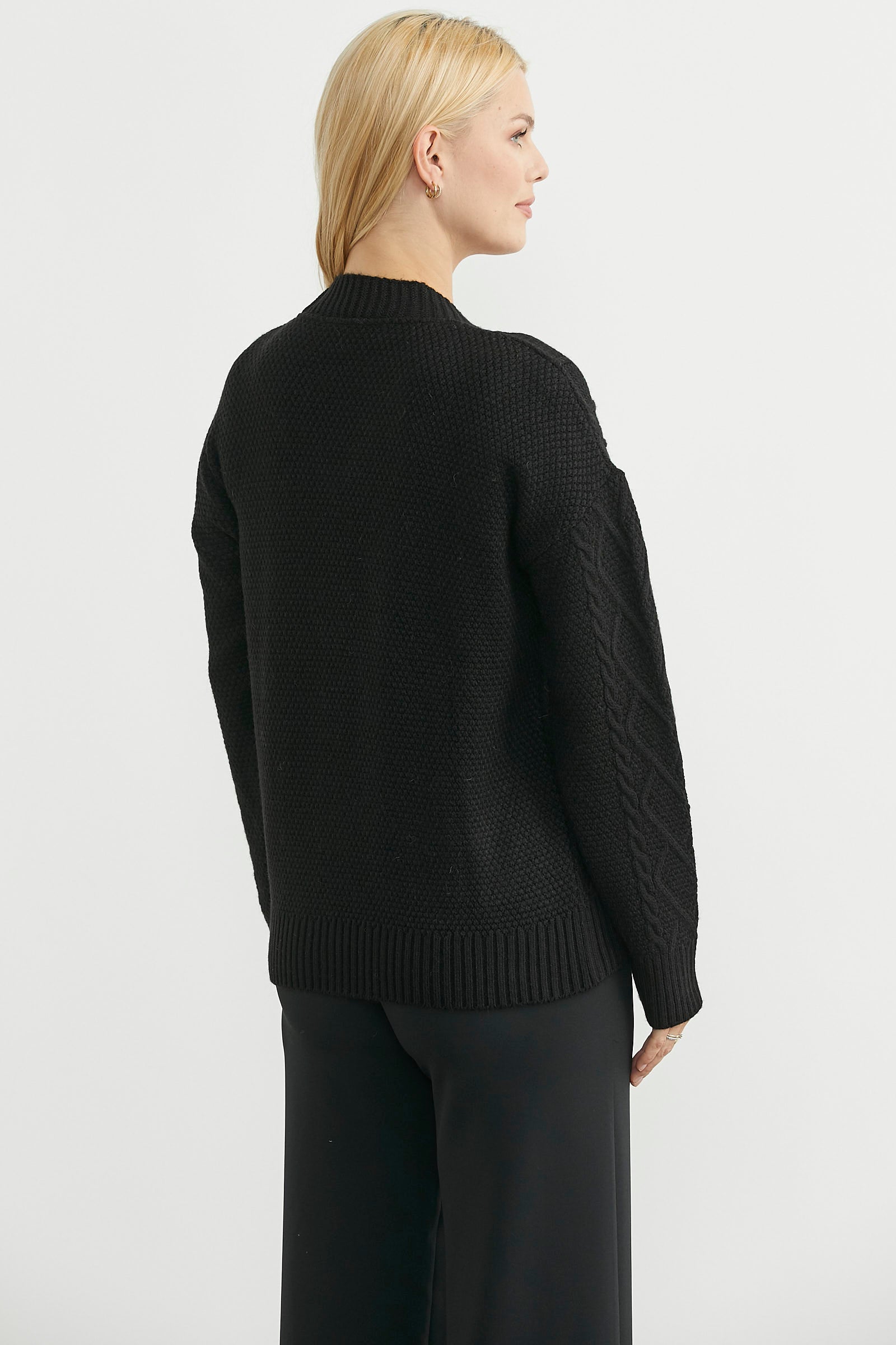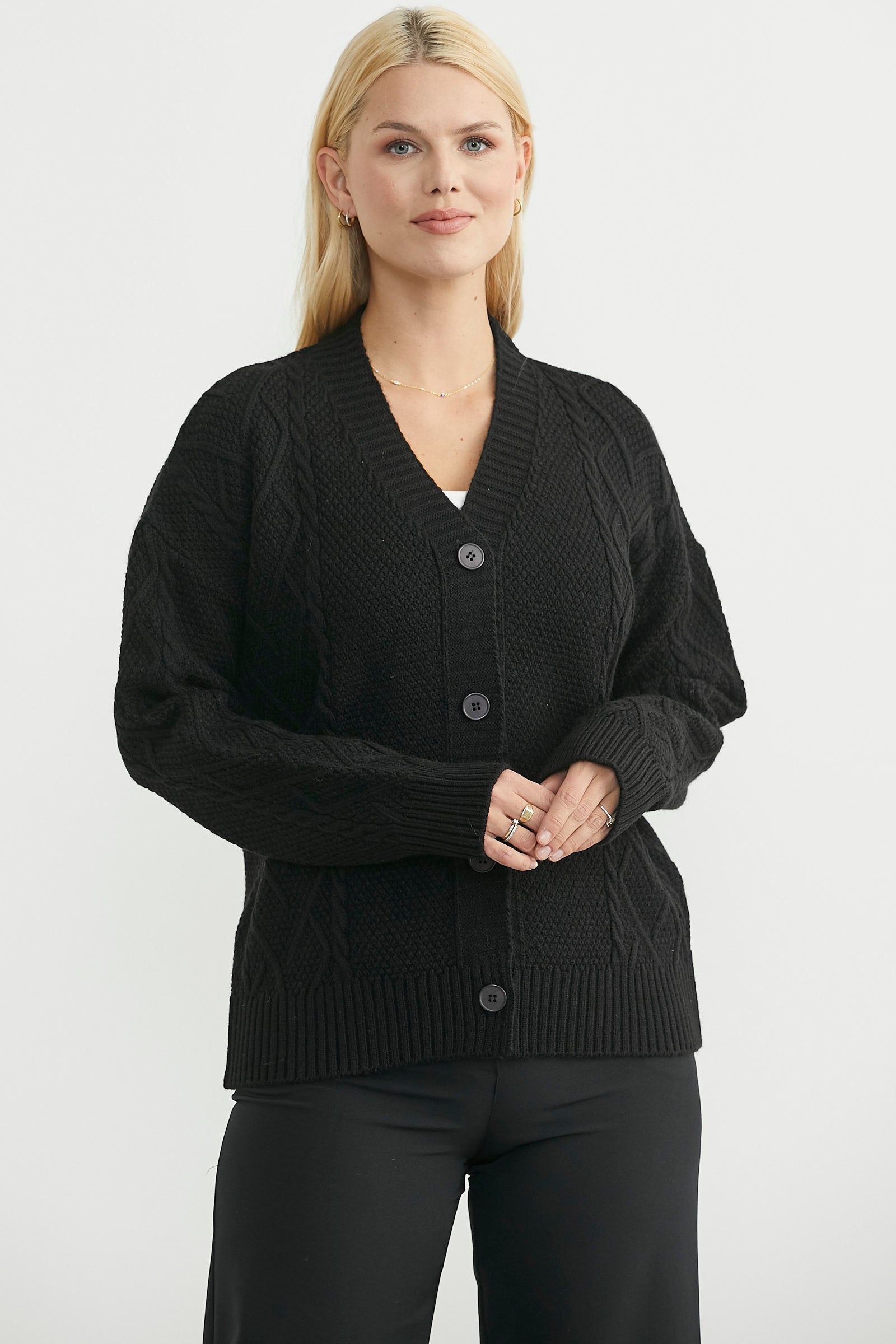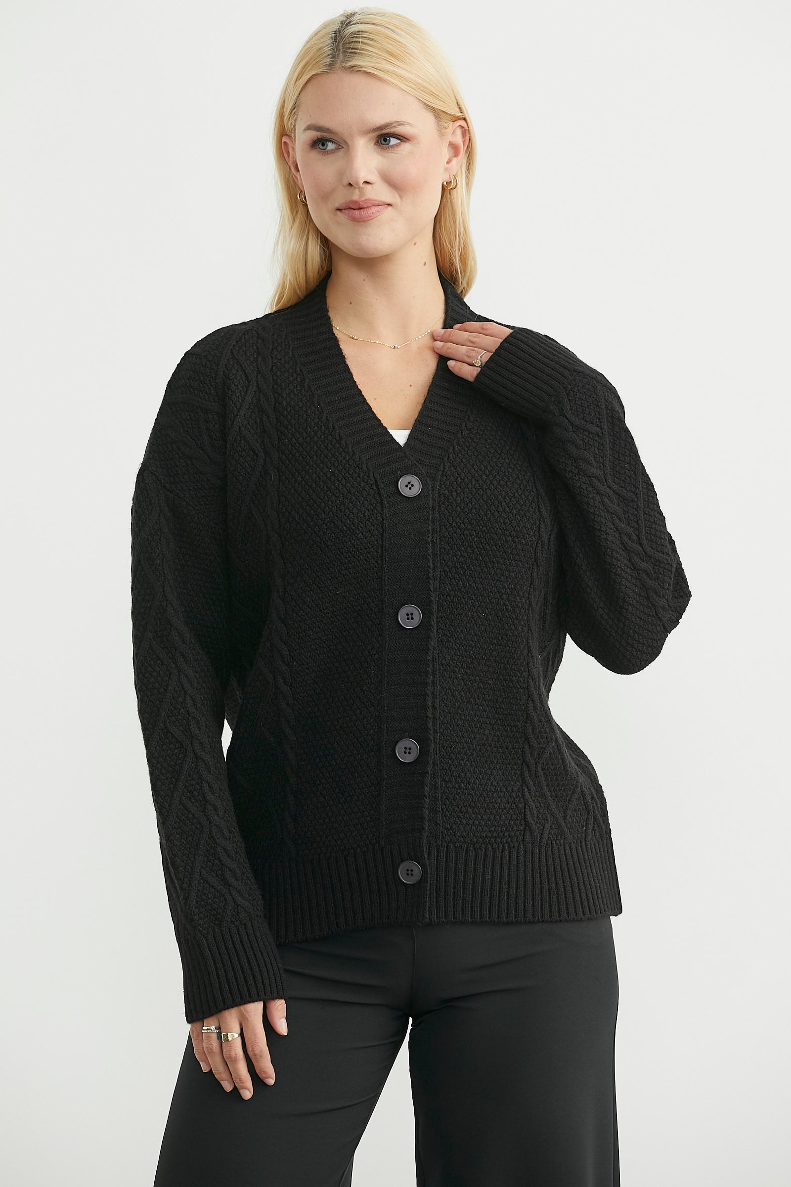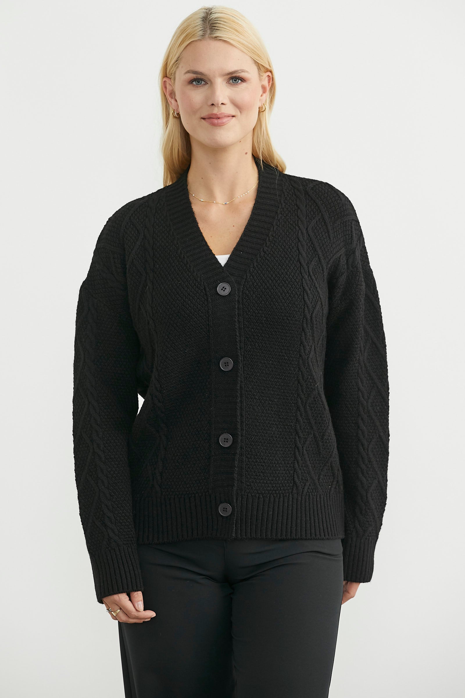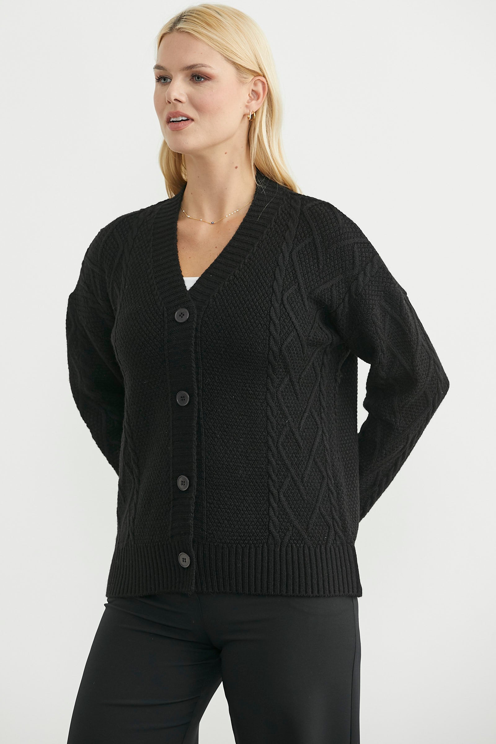 Oversize bol kesim, düşük kol triko hırka. V yaka düğme kapamalı, rahat kalıp.