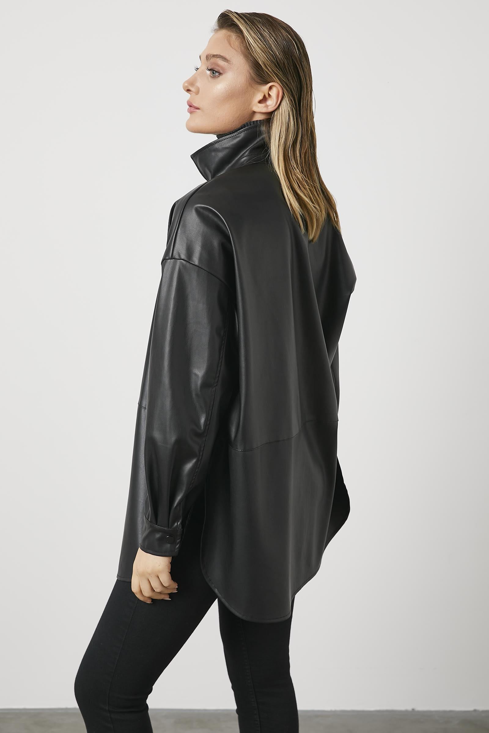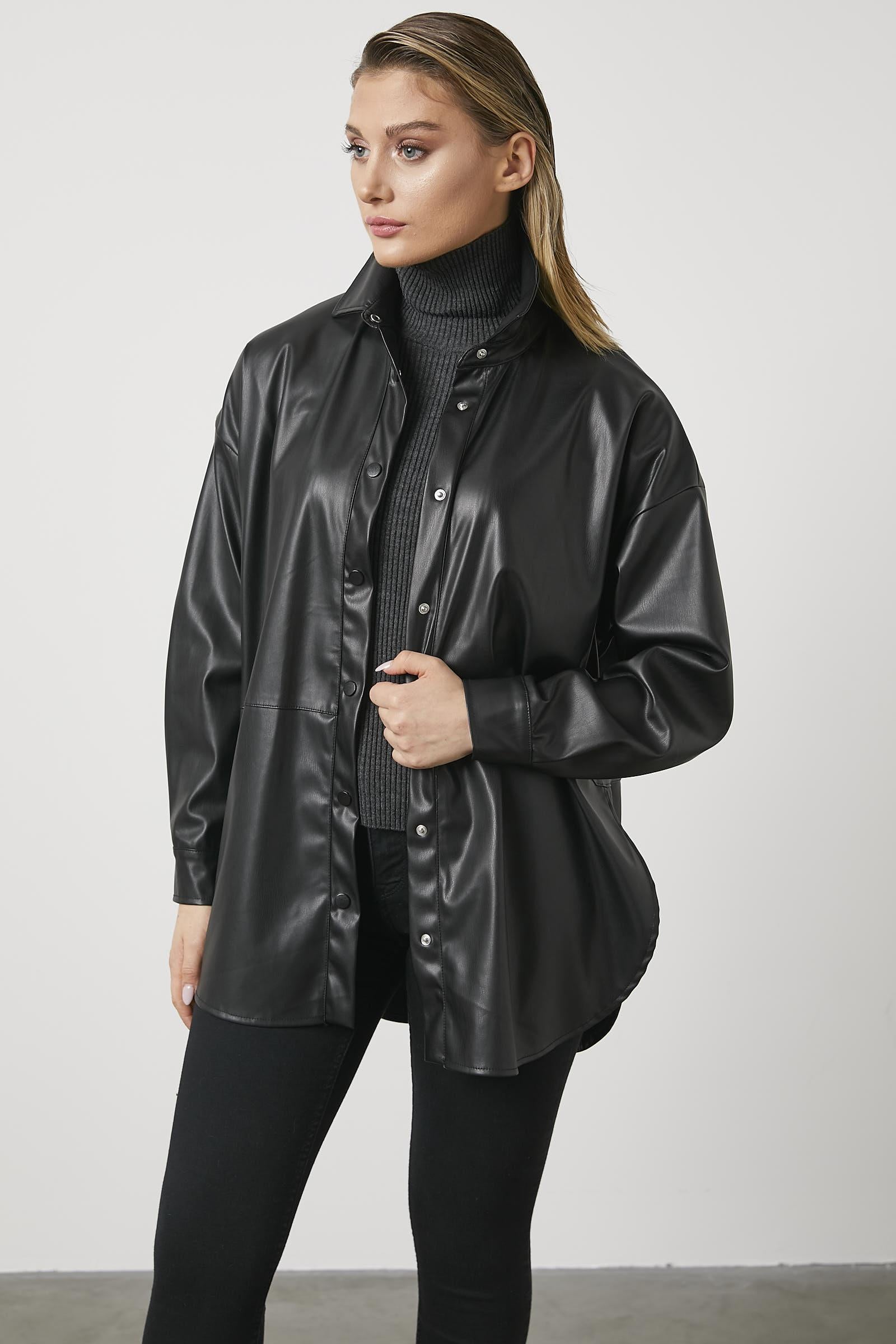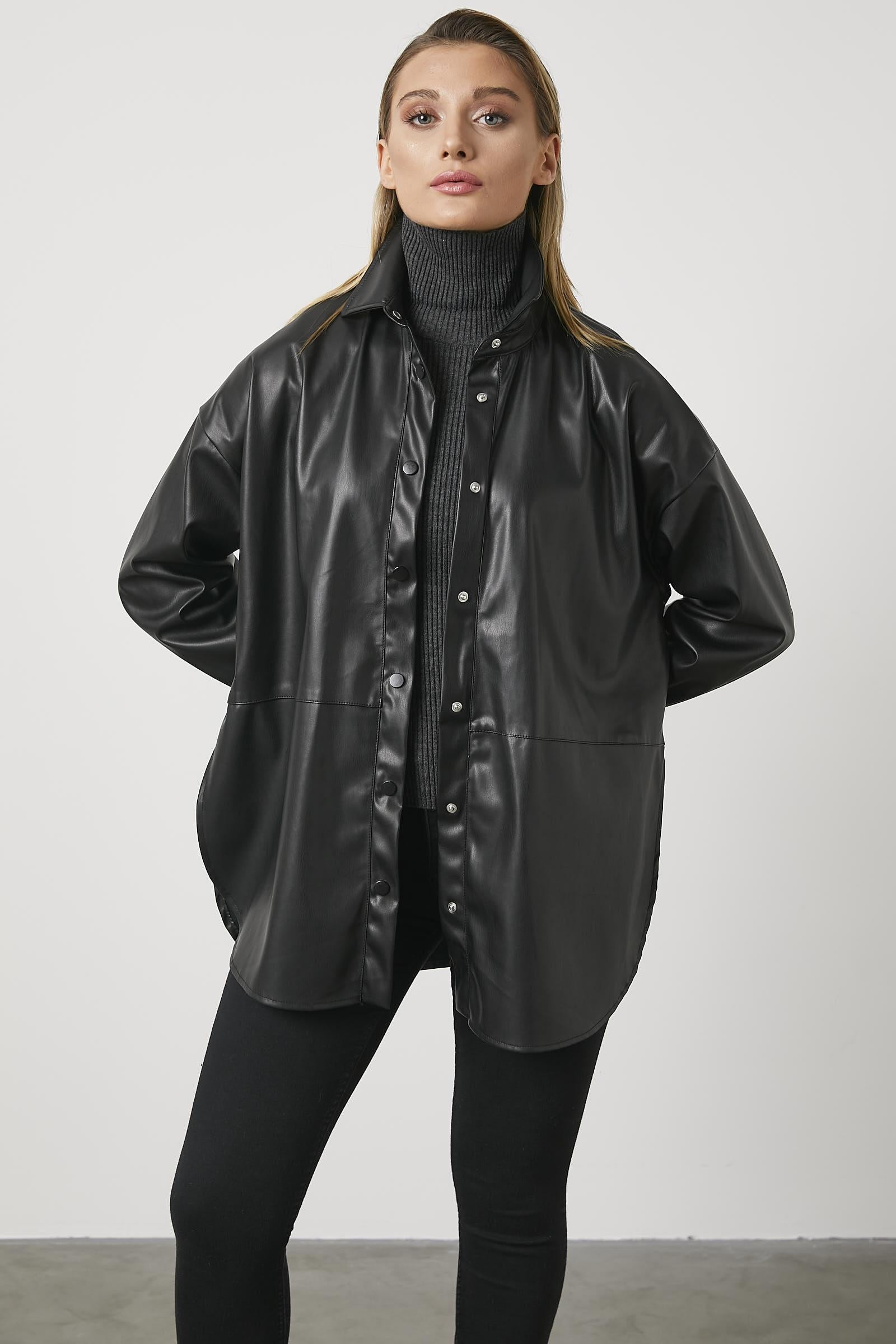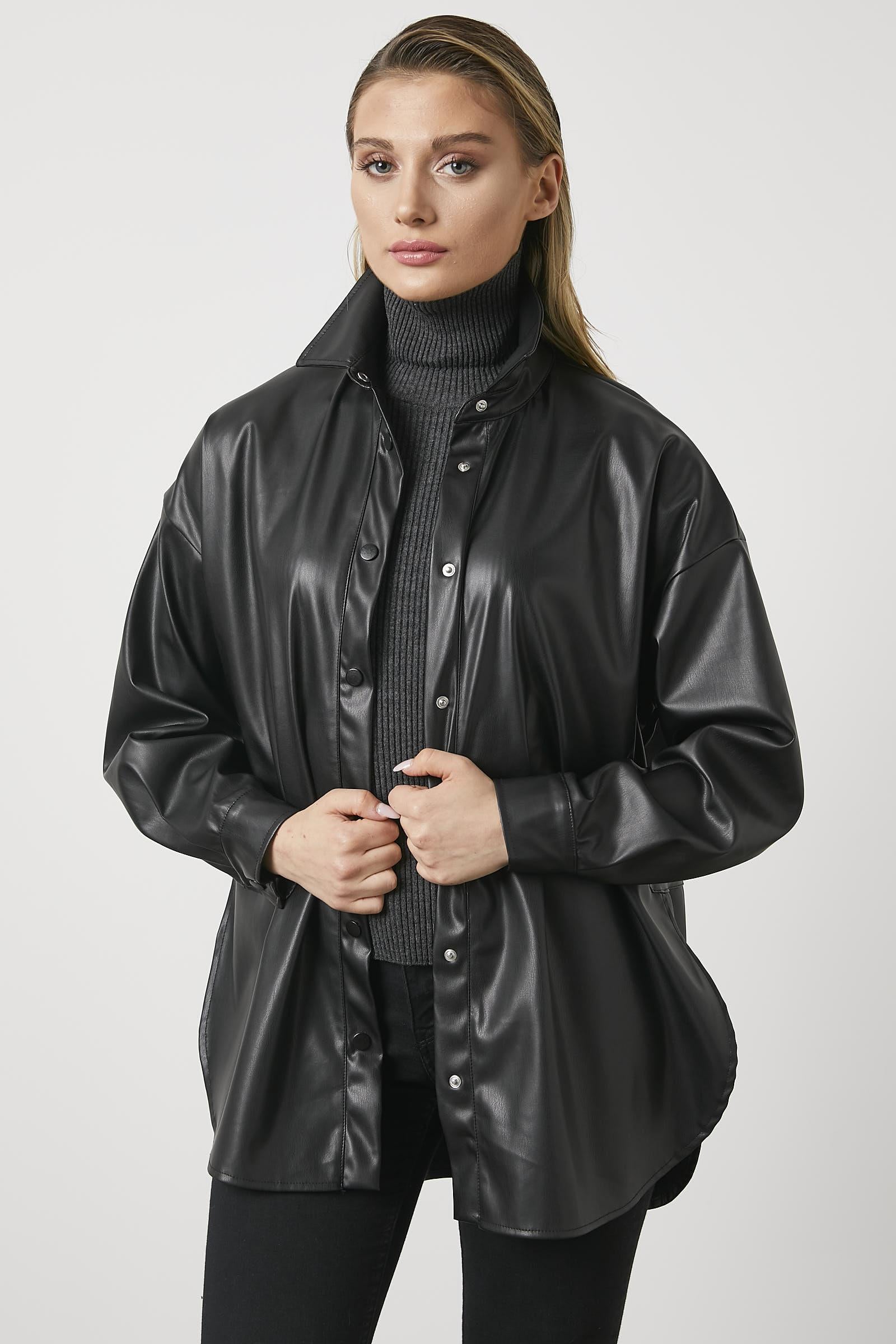Çıtçıt düğme kapamasına sahip uzun kollu, düşük omuzlu, oversize suni deri gömlek ile cool stiller yaratın!