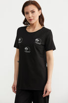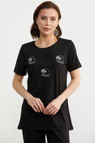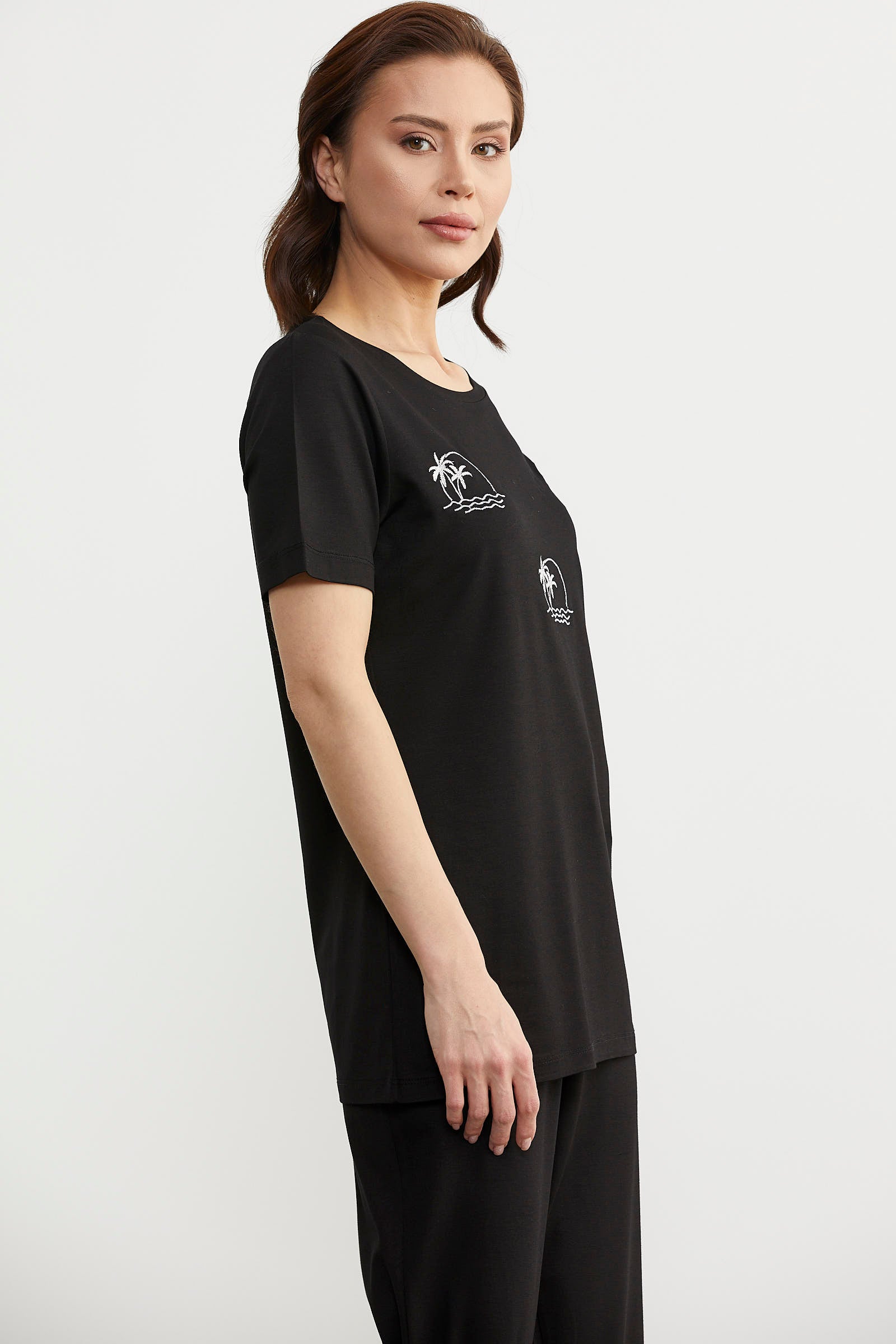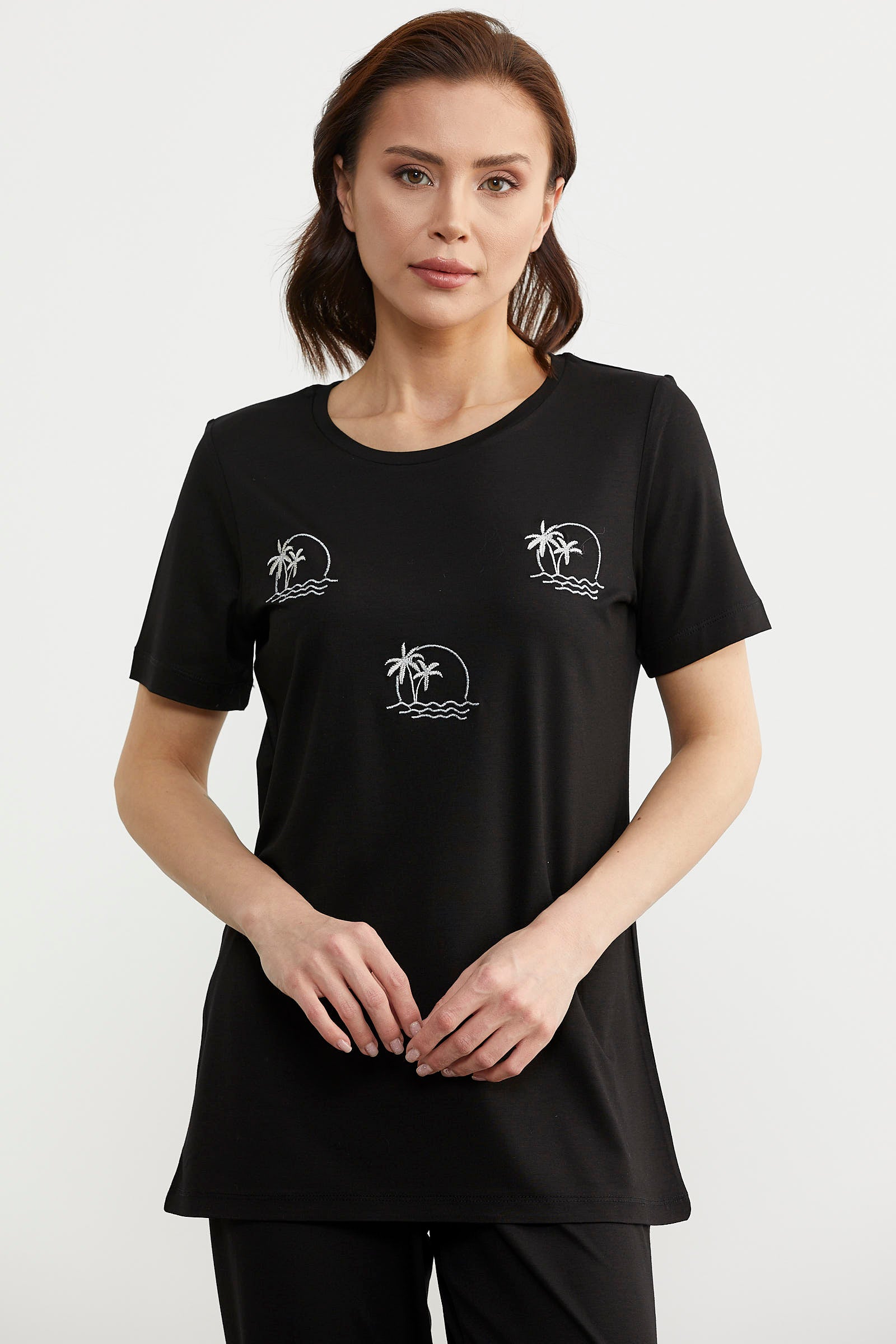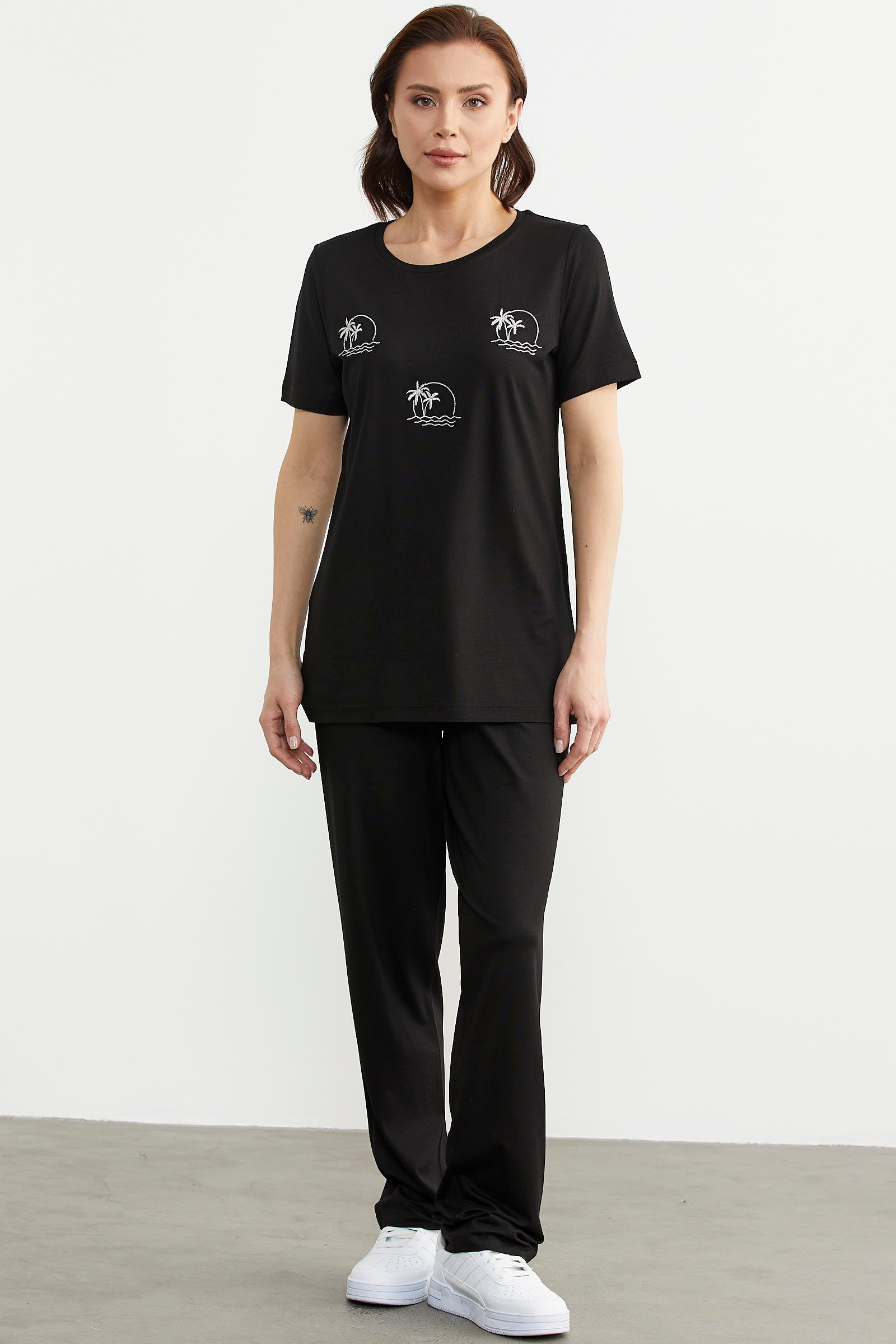 Palmiye Nakışlı Dökümlü Penye Takım - Siyah