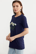 Papatya Baskılı Basic Tişört - Lacivert