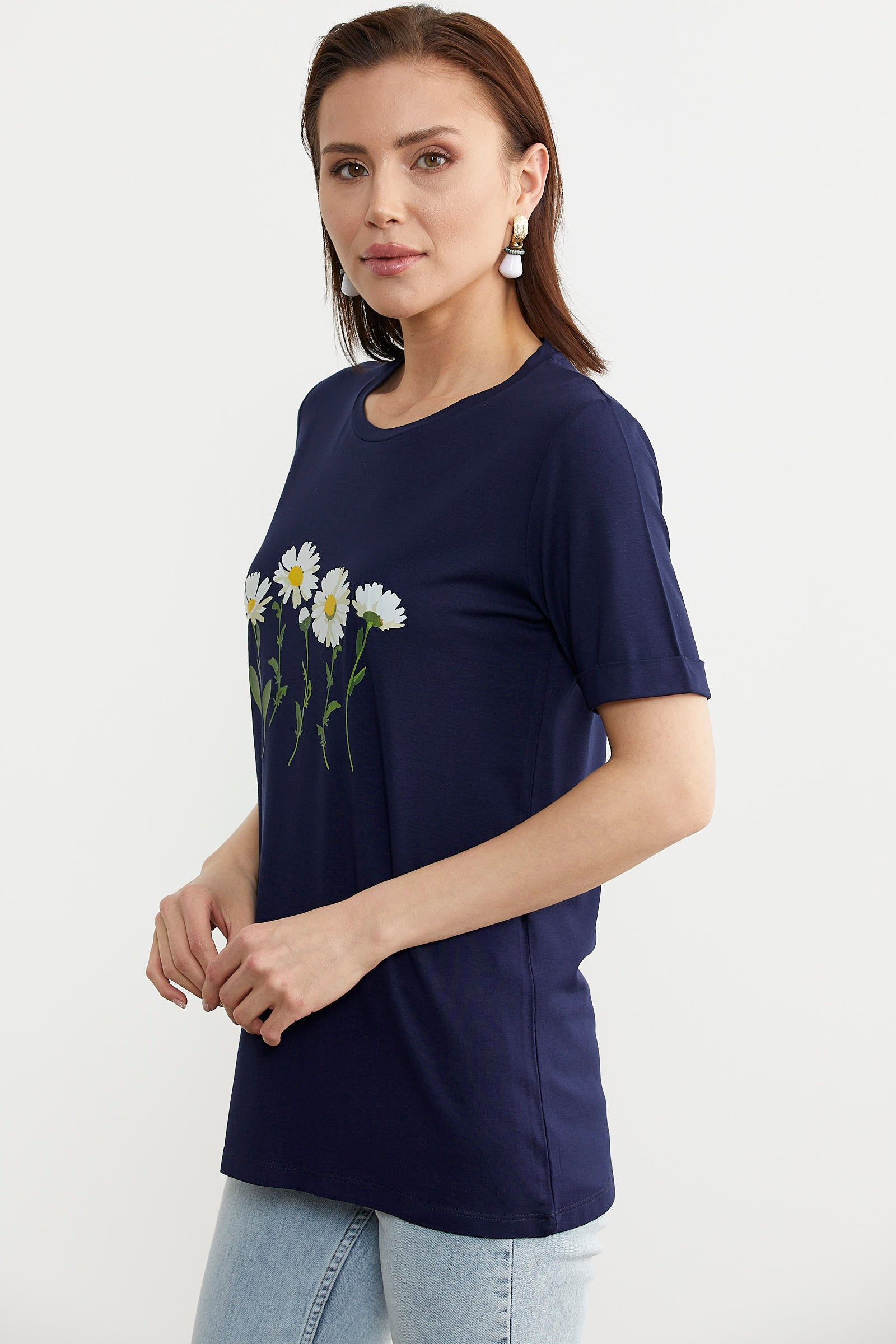 Yaz mevsiminin doğasıyla uyumlu papatya baskılı basic tişört, gardıroplarınızın kurtarıcı parçası olacaktır.
