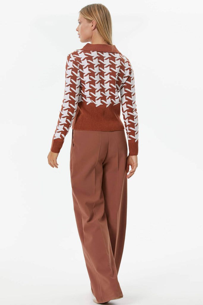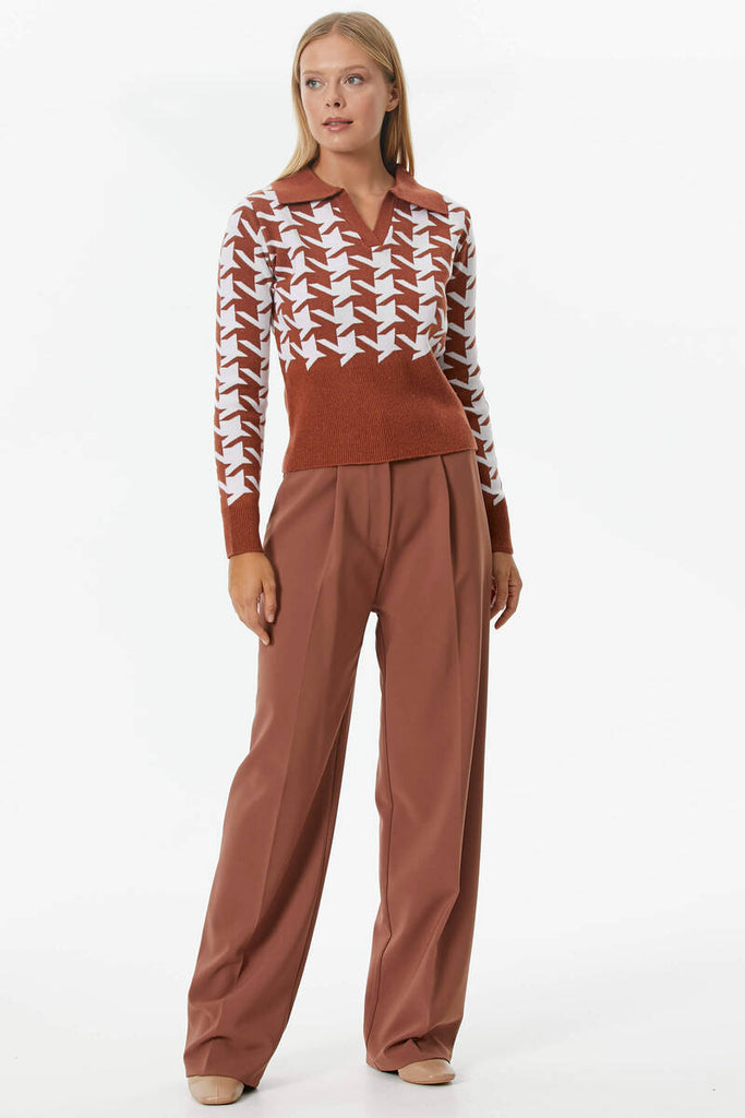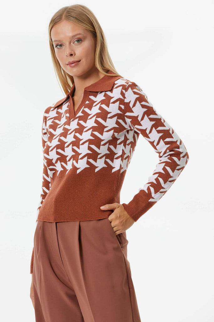 Patlı Polo Yaka Kazayağı Desenli Triko Kazak - Kiremit