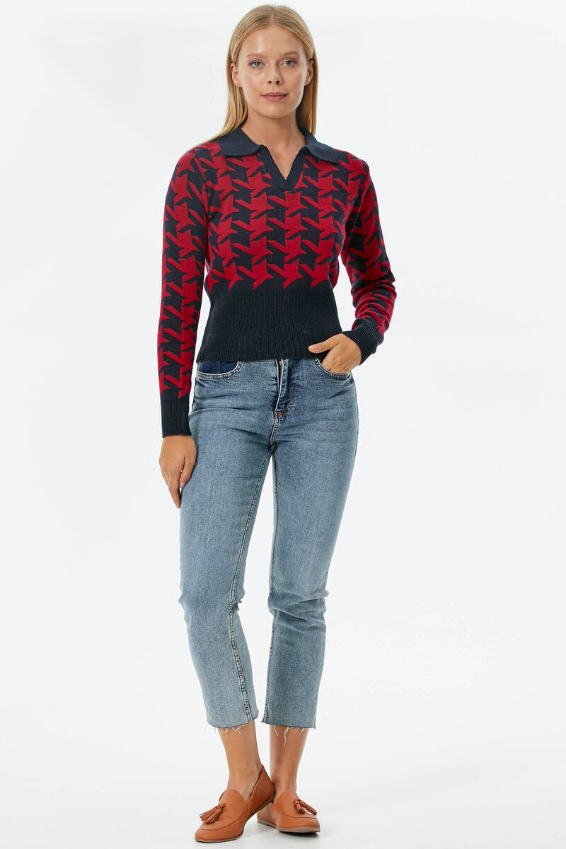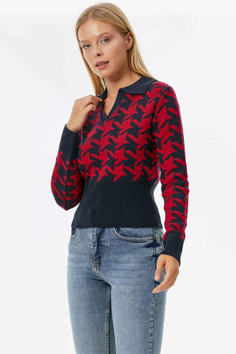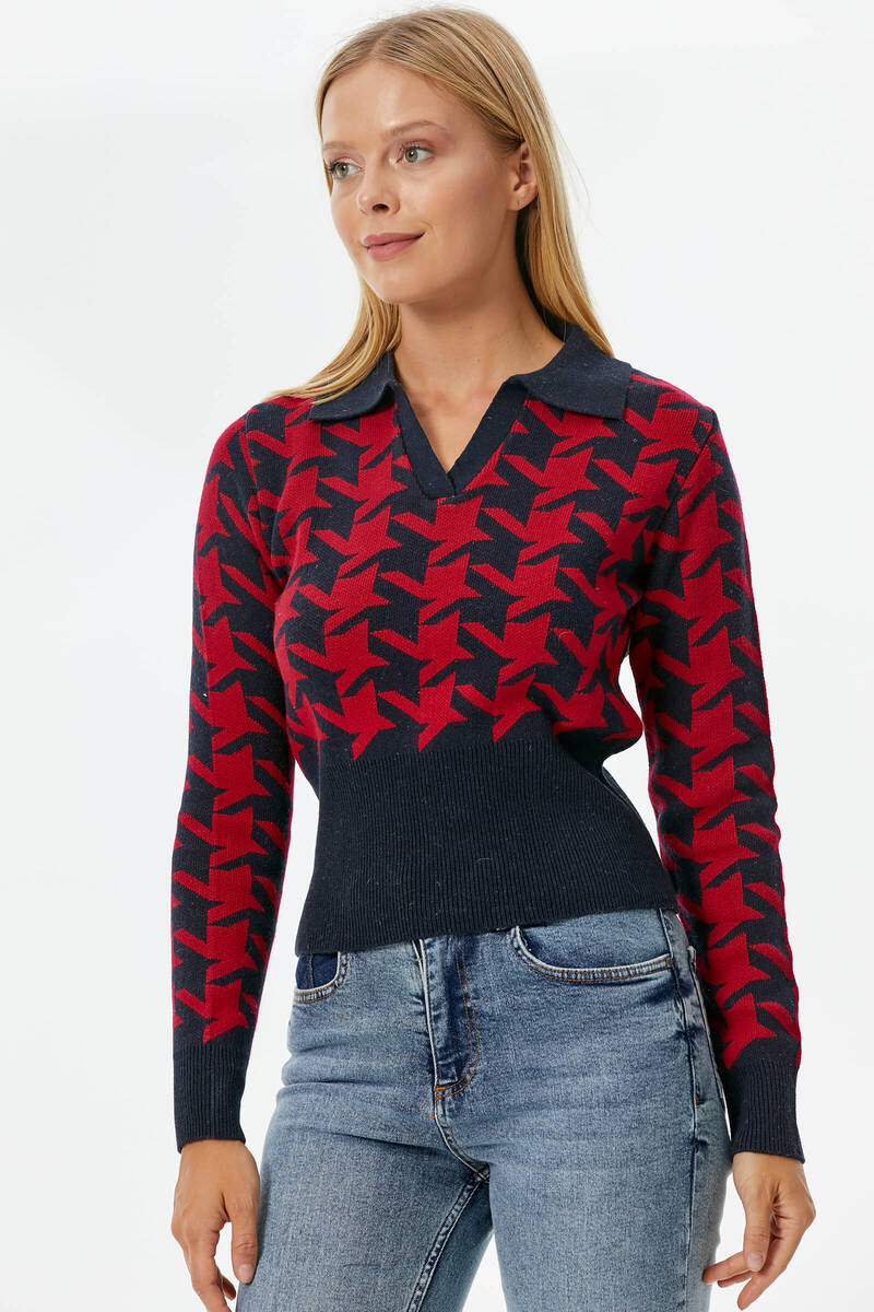 Patlı Polo Yaka Kazayağı Desenli Triko Kazak - Lacivert